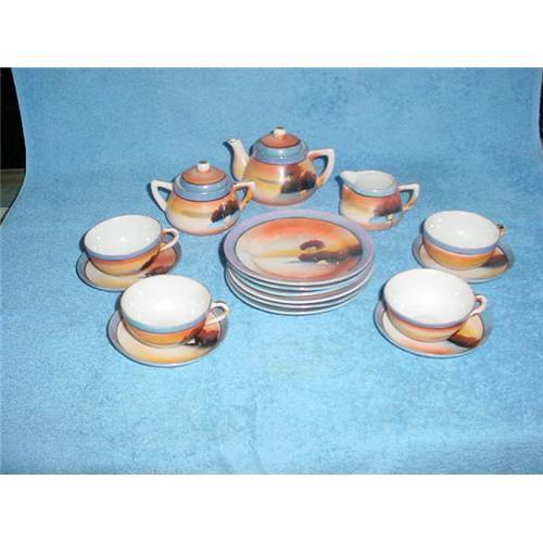 </font></strong>19 pc set. Made in Japan. Includes 6 5" plates, 4 3-5/8" saucers, 4 2-3/4" cups , creamer, sugar & lid, teapot & lid. All good condition except some of the plates and saucers have some wear on the orange color, but they still look good and these were cheaply made back then ,and maybe it wasnt put on good in the first place.</font>