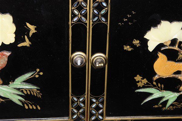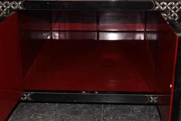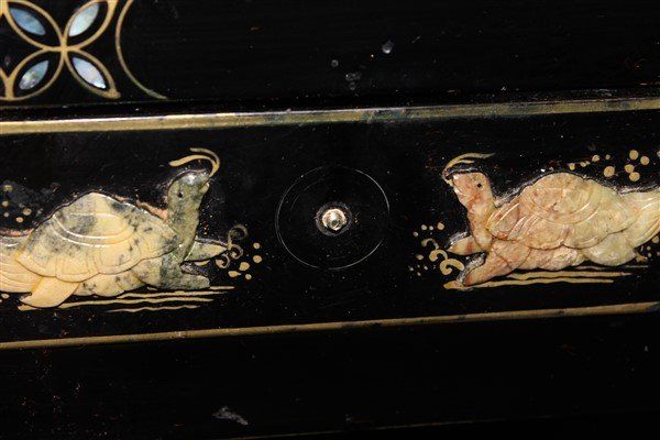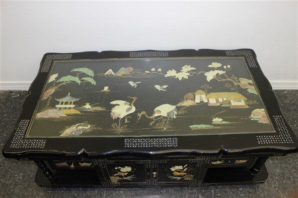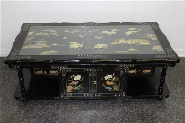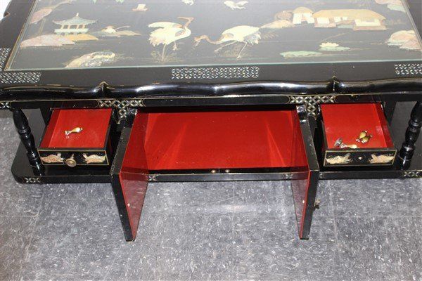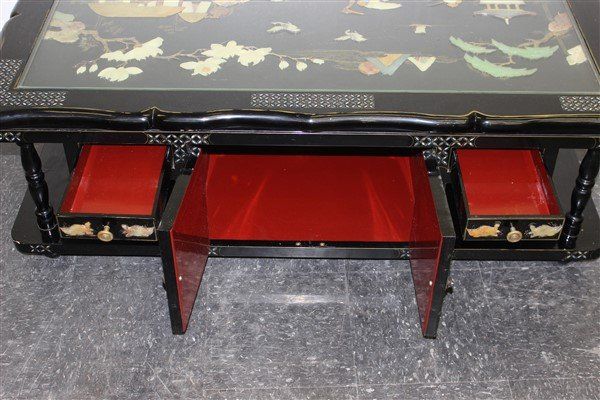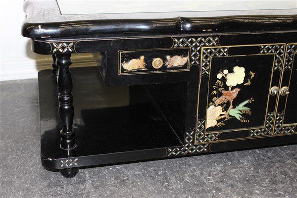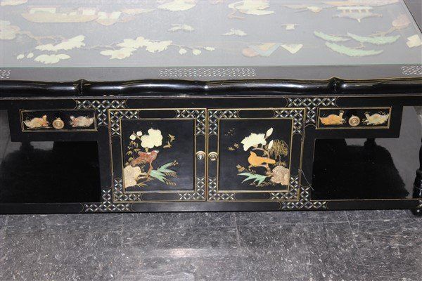black lacquered , all handmade with carved ivory, jade, mother of pearl, coral, and other carved stones, hand painted , double sided 2 drawers and 2 doors on each side, NOTE- 1 side has broken drawer knob and cabinet door, comes with some broken hardware , 1 side has 1 broken door handle, with a glass top over inlaid top, approx 52"long x 30" wide x 18" tall