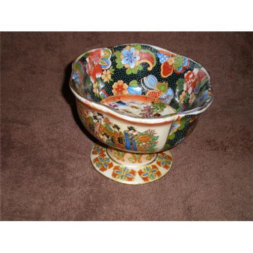 Vintage Japanese Footed Compote Marked with a red mark. Photos show the mark and great color this item has. Really a true beauty of the eye, and I am sure it tells a great story. It stands 4" H X 5.5" W and base is 3.25" diam. Beautiful show piece of Asian art, and a very beautiful one. Hope you like it to. Very Classy show piece...GREAT GIFT ITEM AS IT IS A REAL BEAUTIFUL ONE. ENJOY
