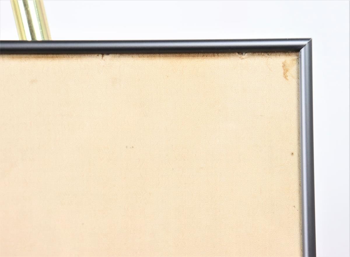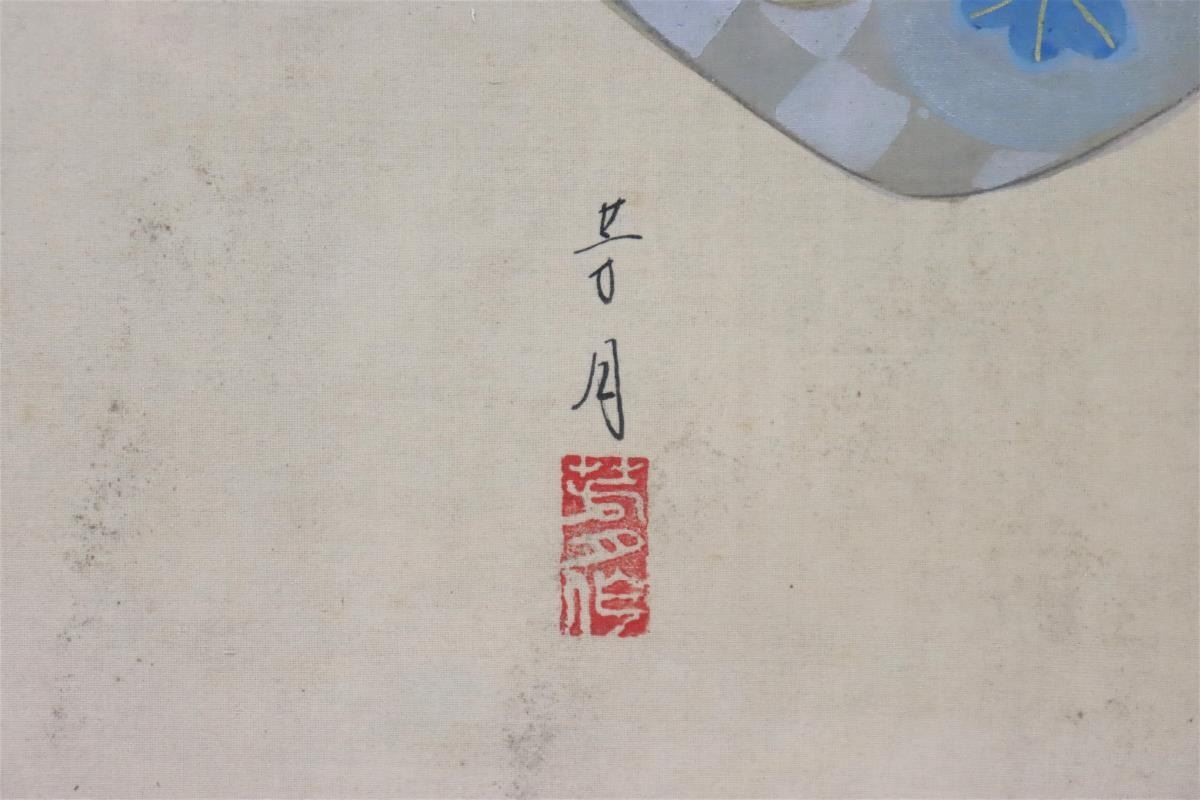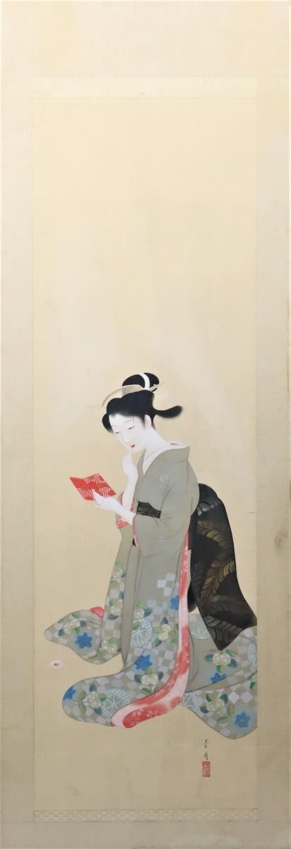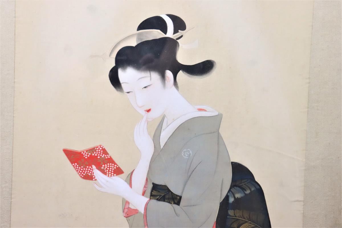 Gouache/watercolor painted scroll of a geisha reading, inscription & chop mark lower right, framed under plexiglass.