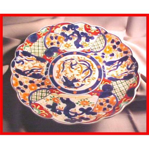 This 12-1/2" in diameter Imari pottery charger/plate was probably made in Japan during the 1920's. This scalloped porcelain plate is hand decorated with cobalt blue, copper red and orange decoration. Good condition with typical flaws in early Oriental porcelain(pinholes, uneven coloring in decoration). No chips or cracks. I bought this plate at an estate sale of an antique dealer.