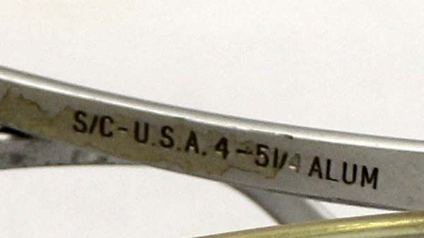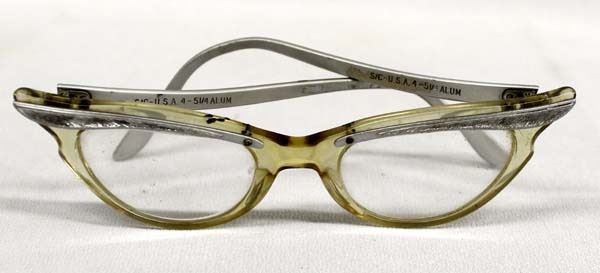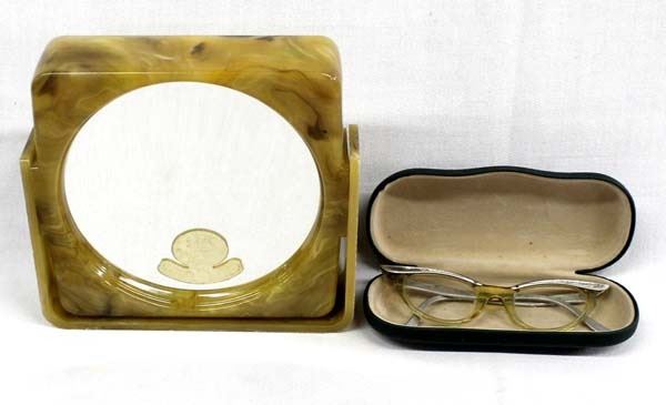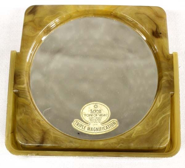 Vintage Japanese Trina ''Point of View'' Magnifying Mirror and Cat Eye Glasses marked ''S/C U.S.A. 4-- 5 1/4 Alum.'', mirror measures 6.5'' x 7'' x 1.75''