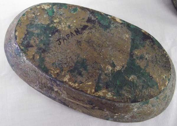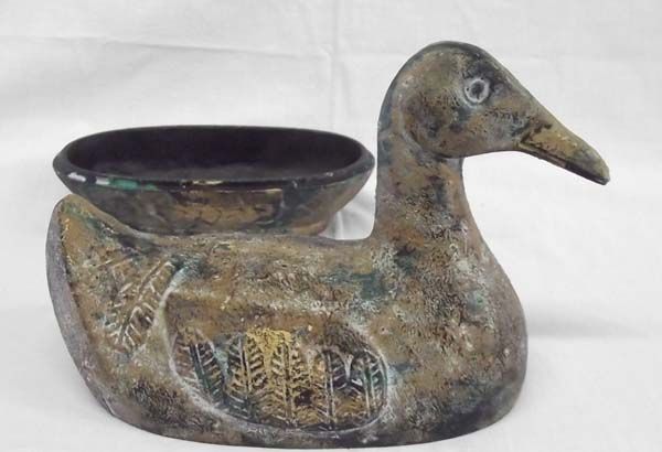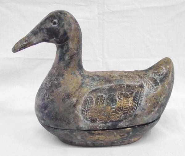Vintage Japanese Metal Duck Container.  Lid lifts off for inside storage.  Multicolored-green, golds and browns.  7''H x 8''W.