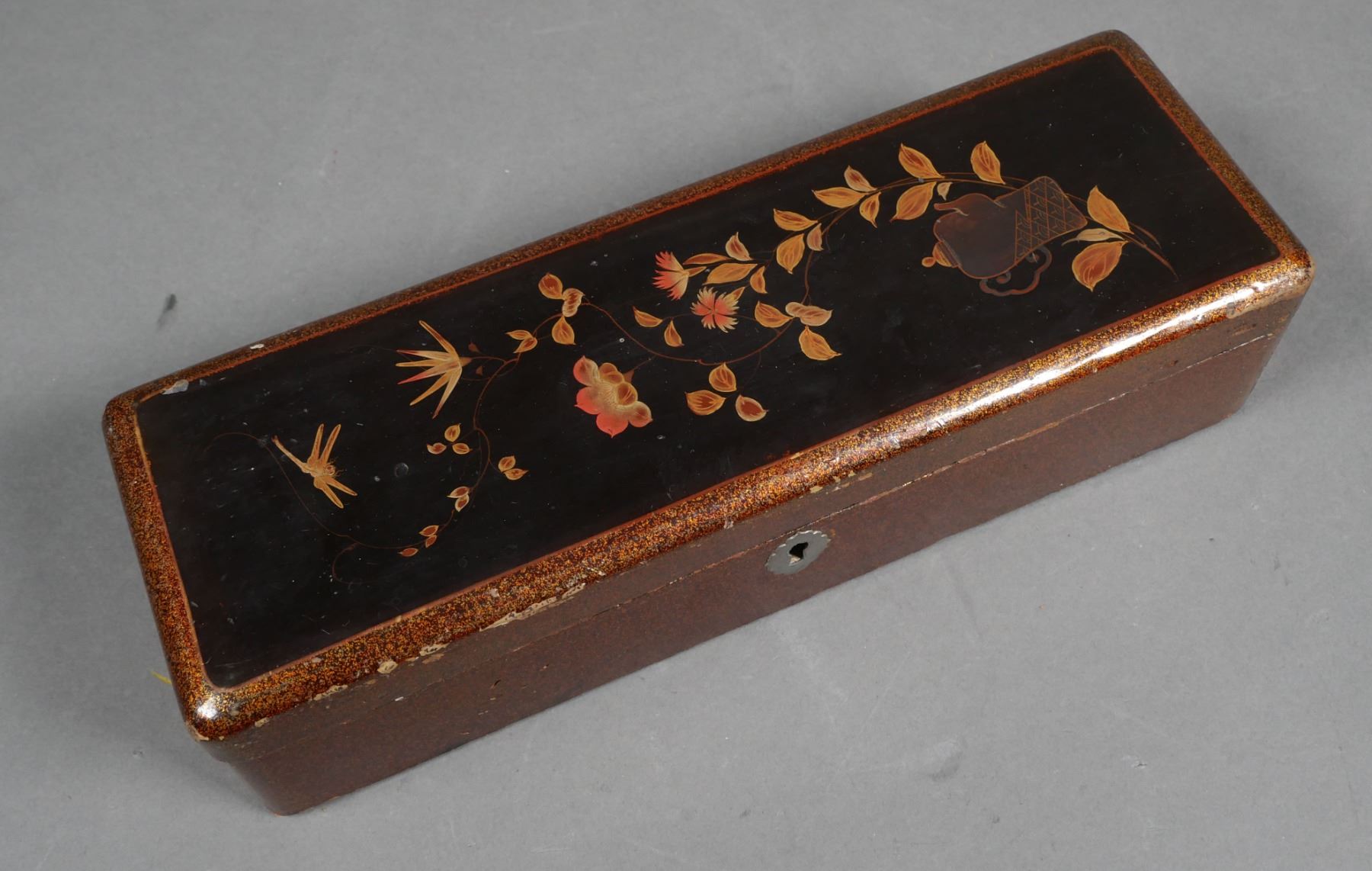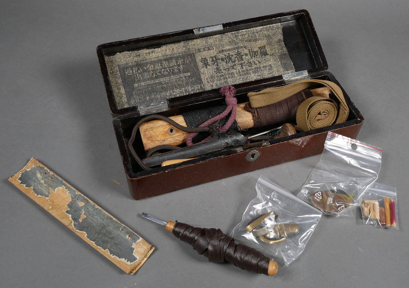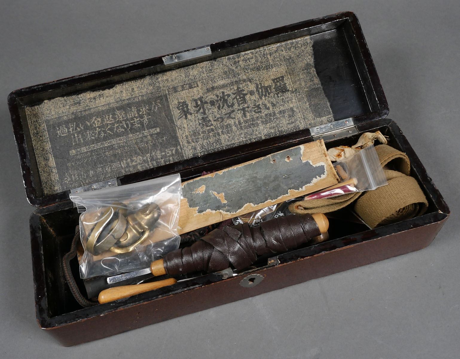 Old Japanese lacquer box with swordsmith tools and accessories, presumed to be for making or maintaining swords. Box measures 10-7/8" wide. See images for detail. Includes tools and what appear to be replacement components.