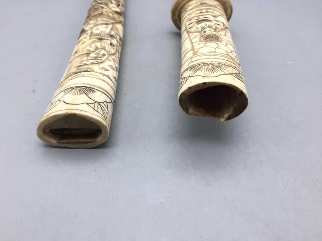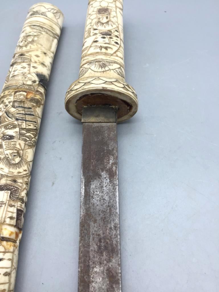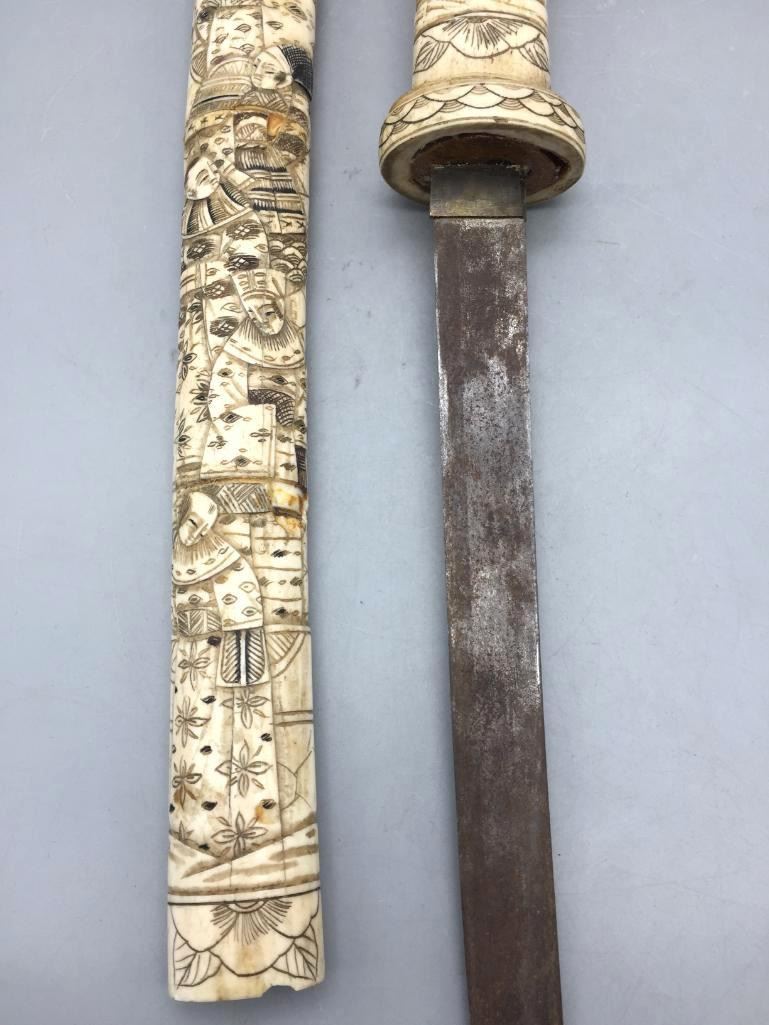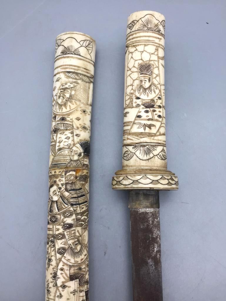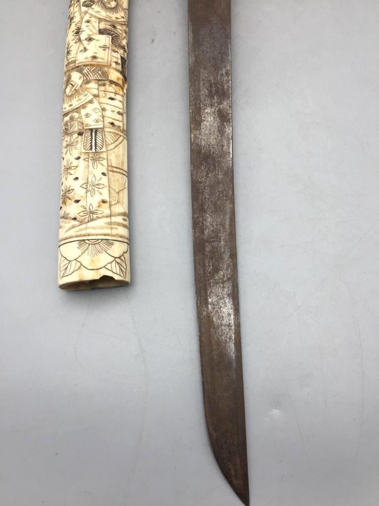 For your consideration we offer this Japanese Tanto with a bone sheath and handle which are decoratively carved. It has a steel blade. *Please note, there are several old repairs to the item where it has come loose and been re-glued. This would make a great conversation piece for your office. Maker: Unmarked as far as we could tell. Width is 1-1/2'' and Length is 18-1/4''. Age, circa- 1900s. Please look closely at the pictures - they are an important part of our description. Shipping: There will be a $8 handling / packaging fee for shipping this lot. The actual cost of postage will be added on top of that.