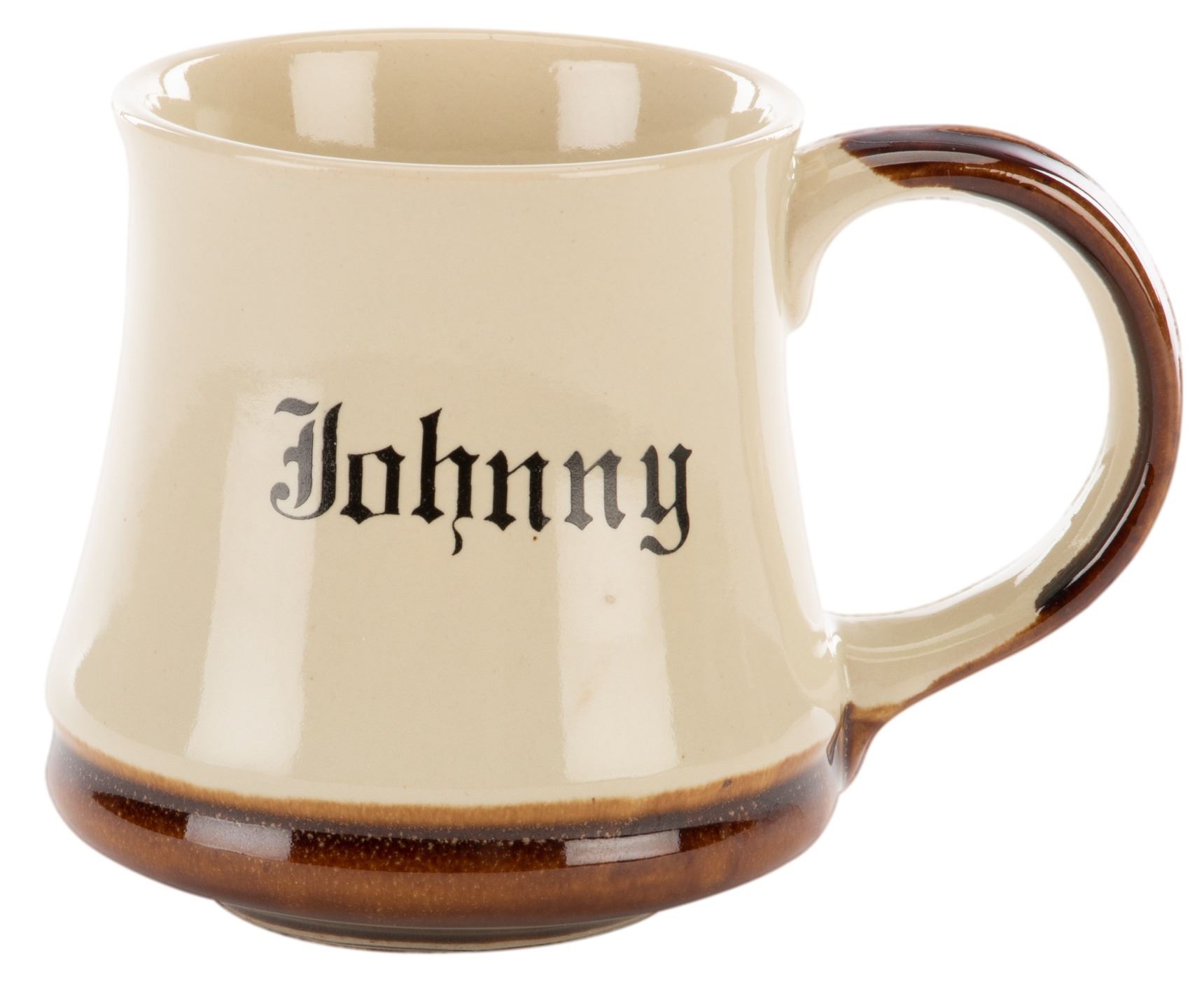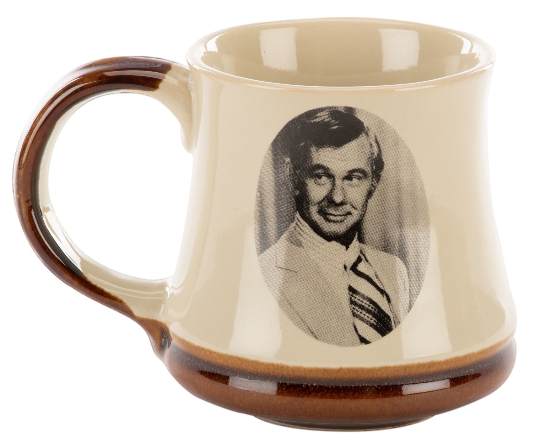 216. Vintage Johnny Carson coffee mug from The Tonight Show. (CBS, 1962-1992) Vintage original ceramic 3.5 in. tall mug. A black and white cameo photo of Carson is featured on one side and, Johnny'' printed on the other. Coffee mugs like this were a constant feature of the talk show host's desk. In vintage fine condition. $600 - $800