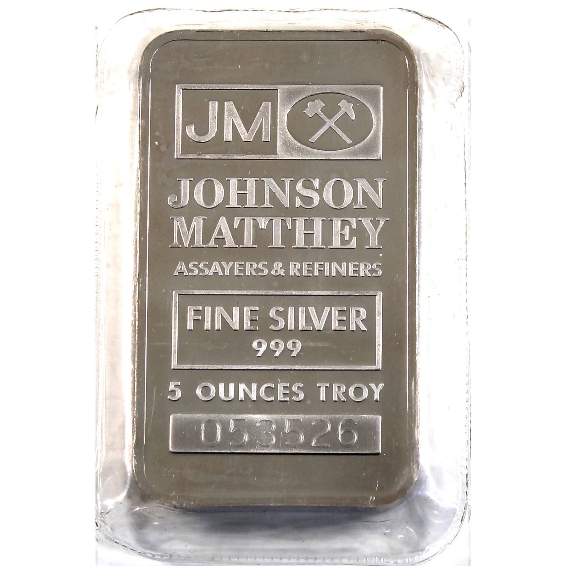 Vintage Johnson Matthey 5oz Fine Silver Bar with 'JM' logo Reverse (TAX Exempt). Serial #053526.