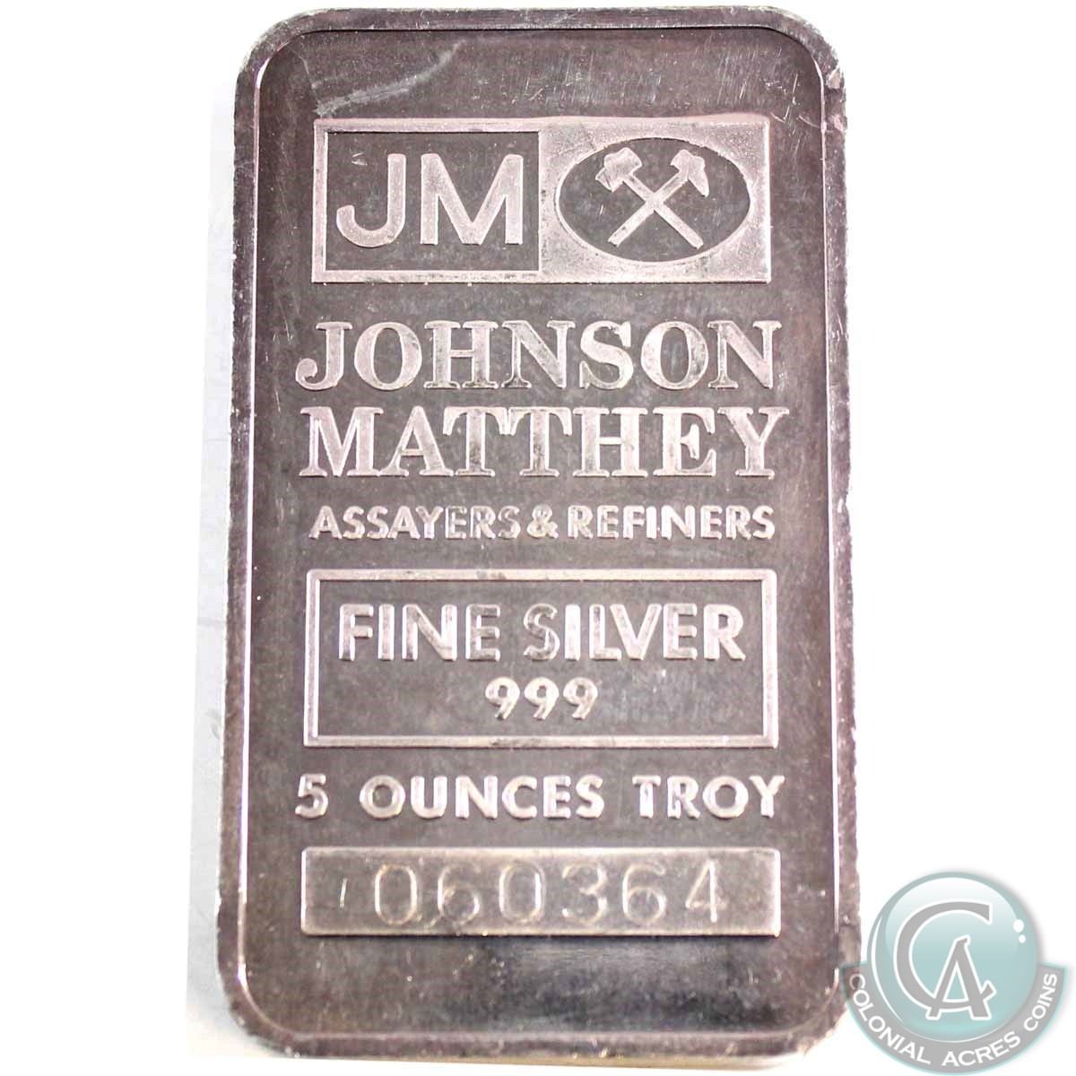 Vintage Johnson Matthey USA 5oz Fine Silver Bar with JM Logo (Tax Exempt). Serial # 060364
