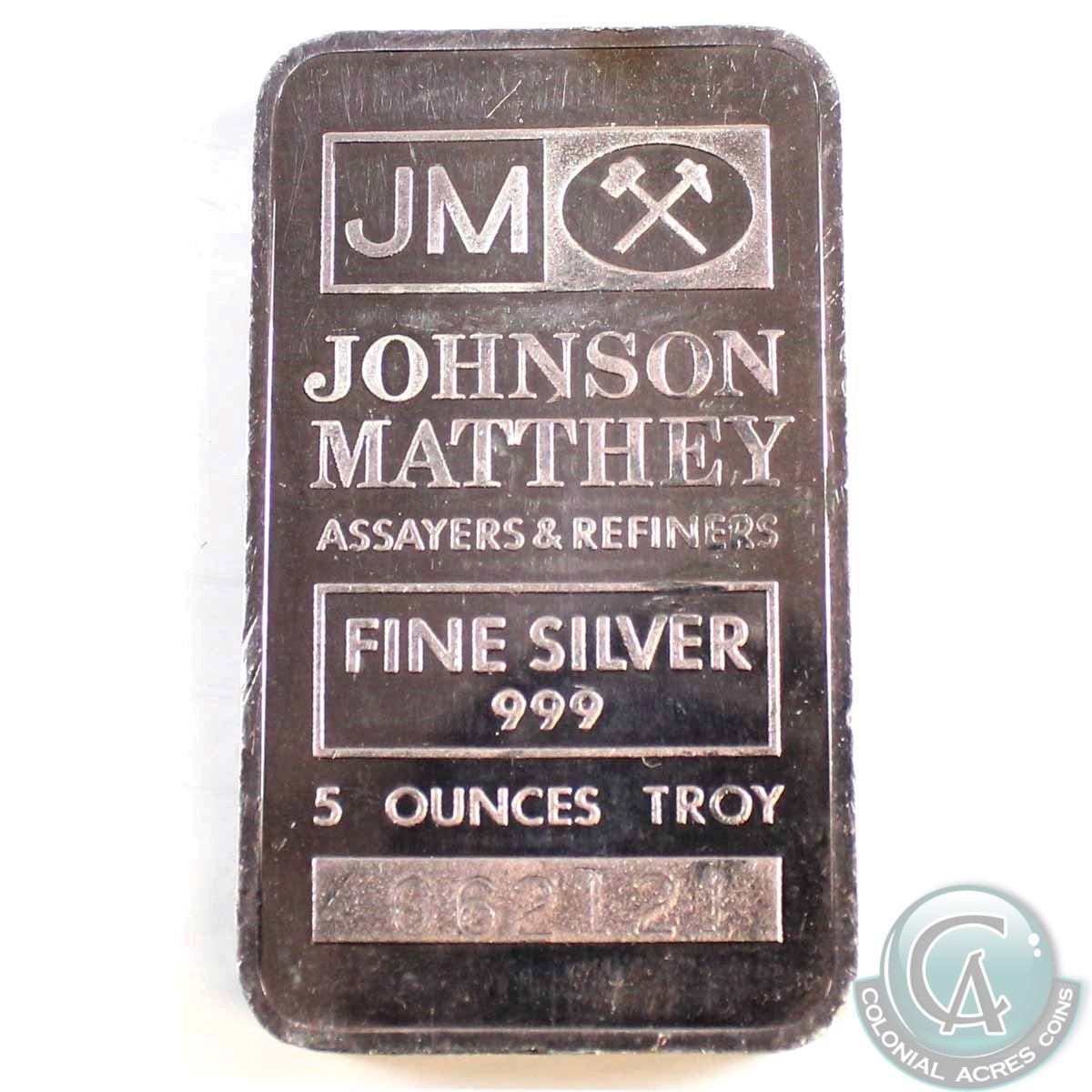 Vintage Johnson Matthey USA 5oz Fine Silver Bar with JM Logo (Tax Exempt). Serial # 062121