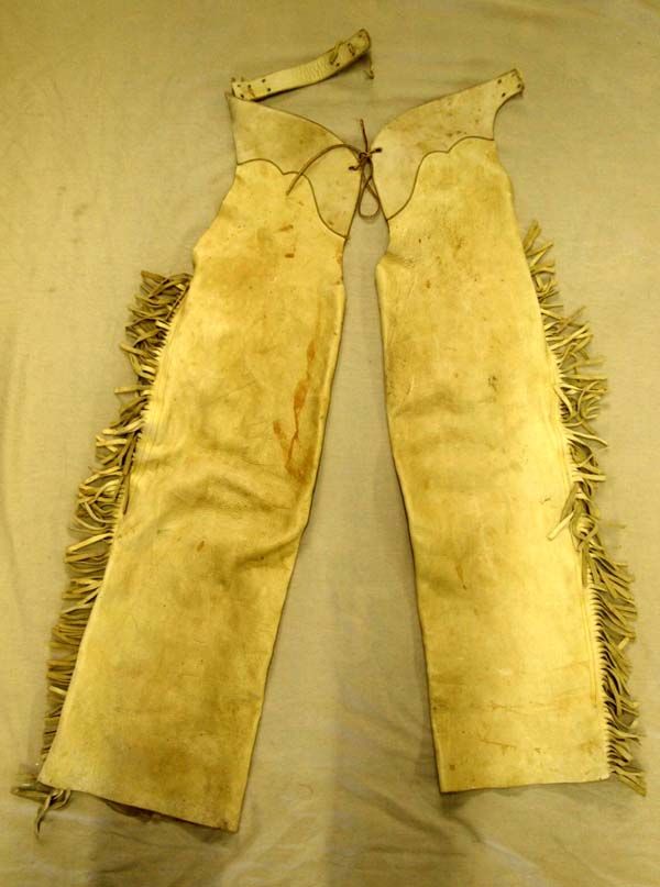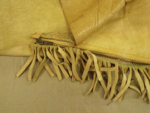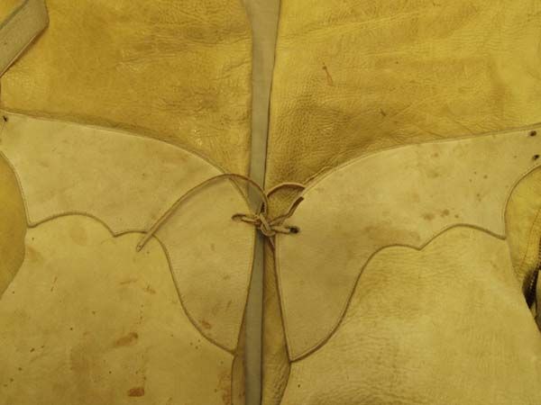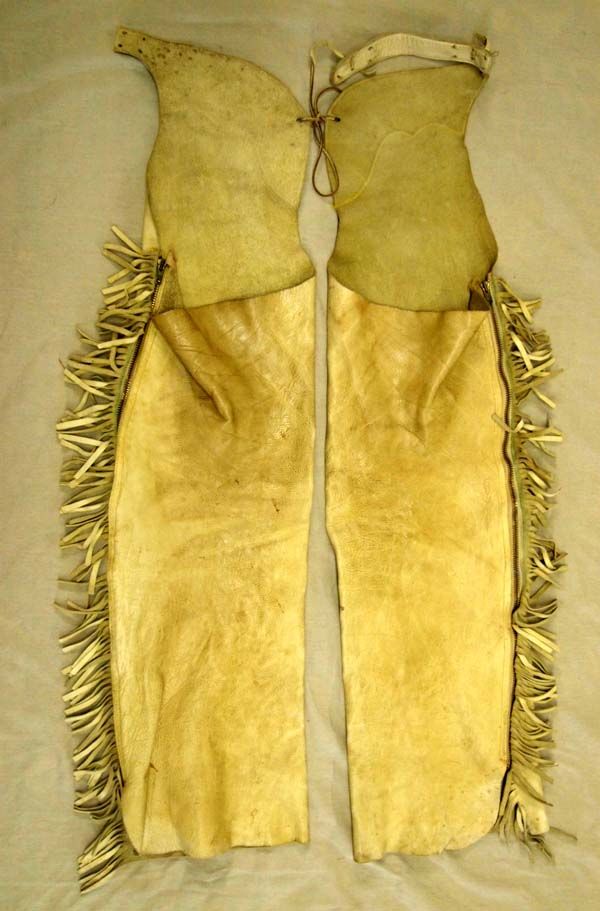 Vintage Juvenile's Fringed Leather Chaps. Used, but lots of life left in these hand made chaps. Brass zippers on inside leg and leather tie-strap waist belt. Great gift for your little buckaroo. Measures approx. 23'' waist and 25'' inseam.