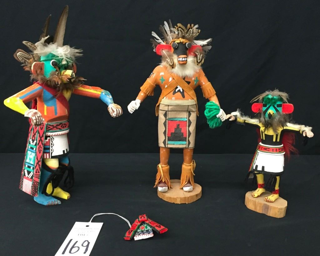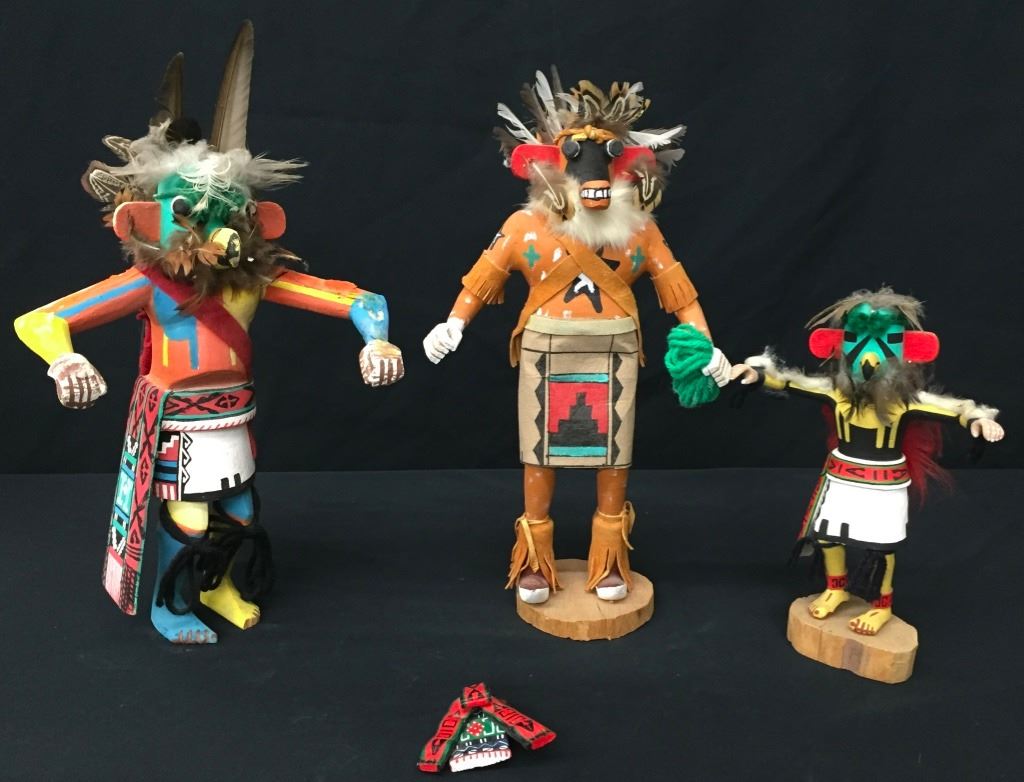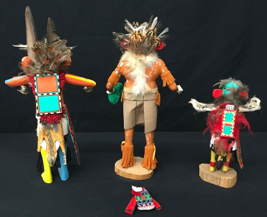 There are 2 Navajo and a Hopi kachina included in this group. They are from 9.5” to 13” in height. All have some condition issues. Please look closely at the pics as they are an important part of our description. Shipping: There will be a $8 handling / packaging fee for shipping this lot. The actual cost of postage will be added on top of that.