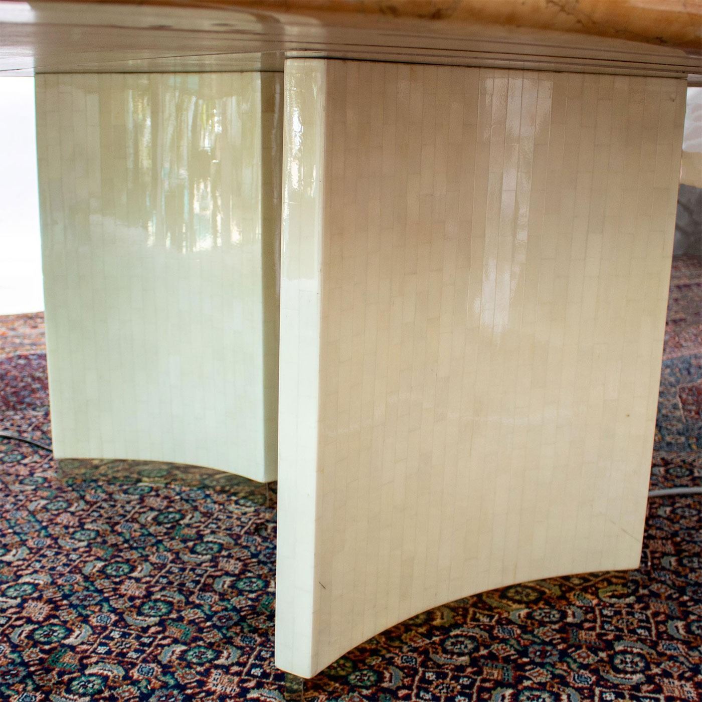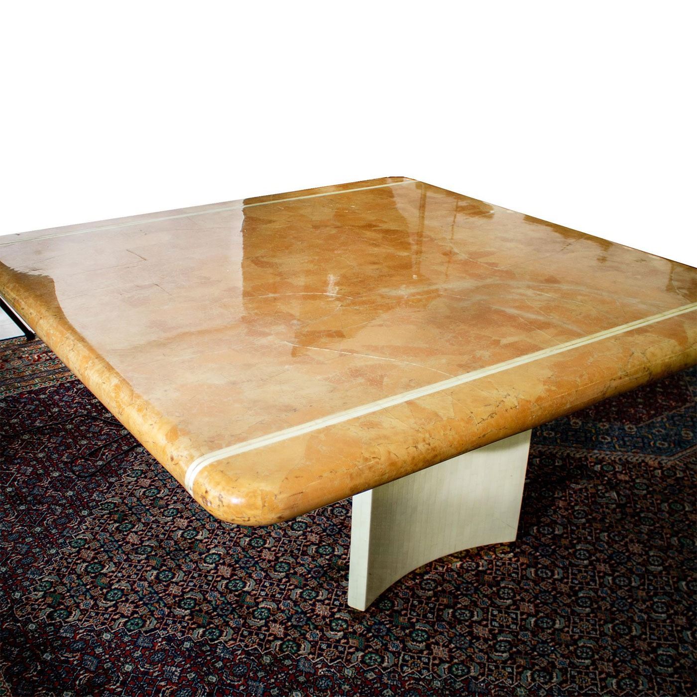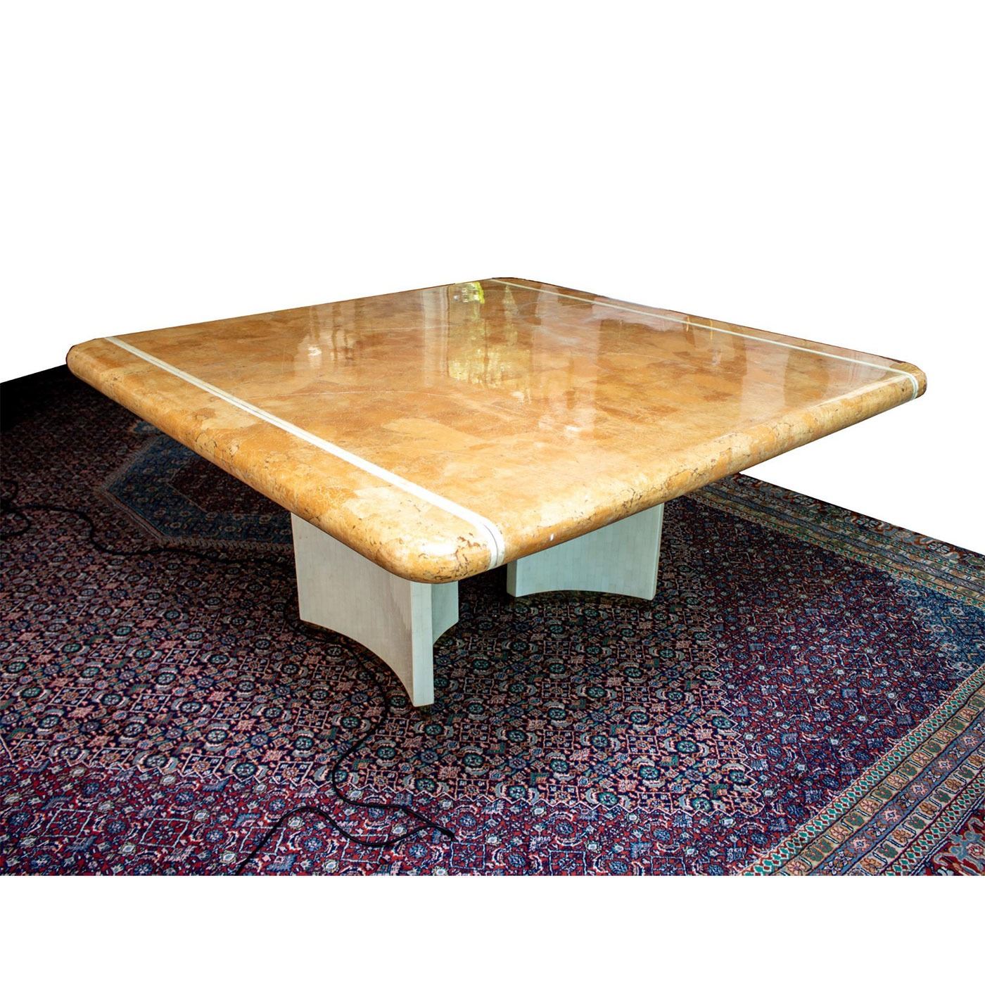 Mid century masterpiece - Lacquered Shell and Bone measuring 60" square and includes two table extensions that measure 24" each can make the table 108" when both leaves are used.