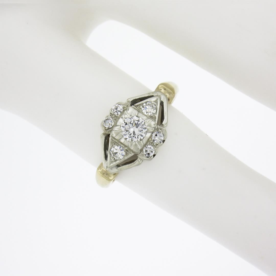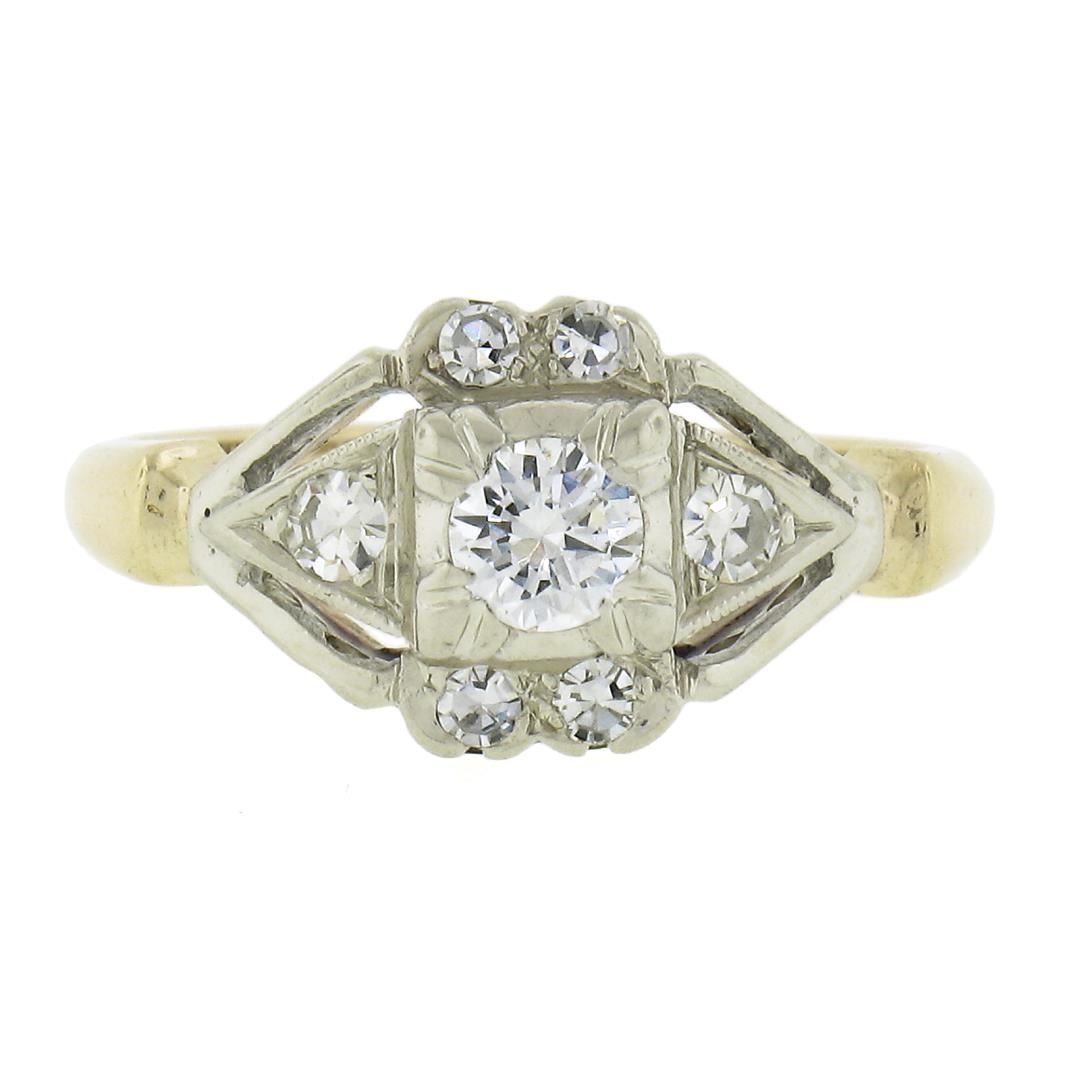 A vintage solid 14k yellow & white gold ring by Keepsake, with 6 old single cut natural diamonds (F-H - VS1/VS2 ; 0.36ctw). The ring is size 4.0, weighs a total of 2.23 grams, and measures 8.9mm wide.