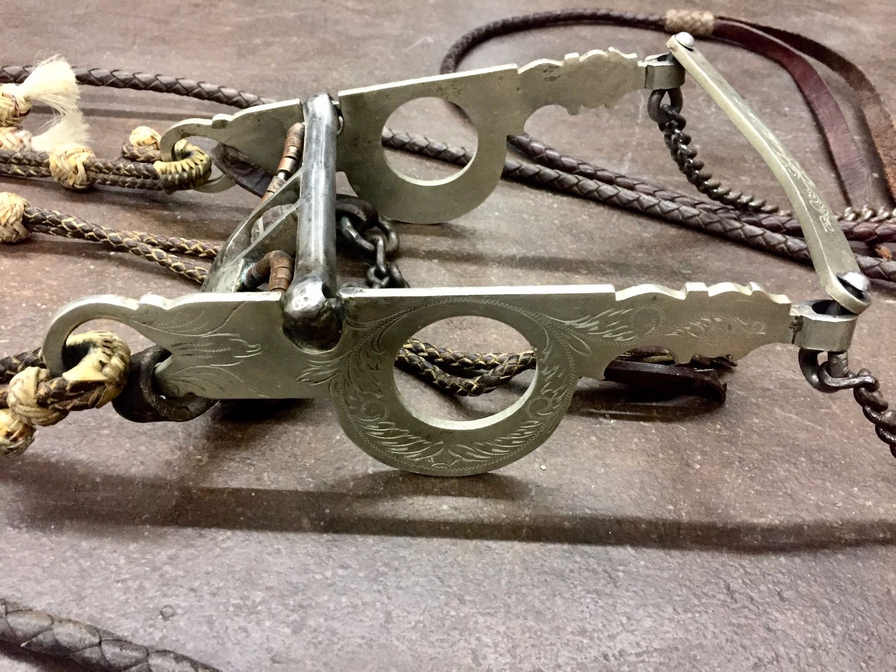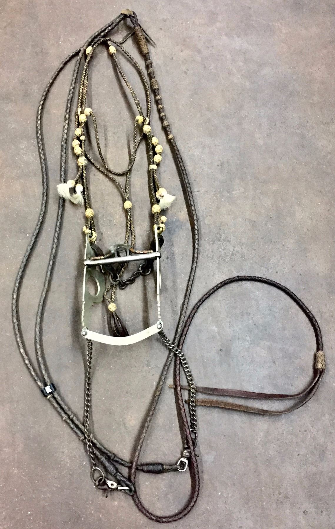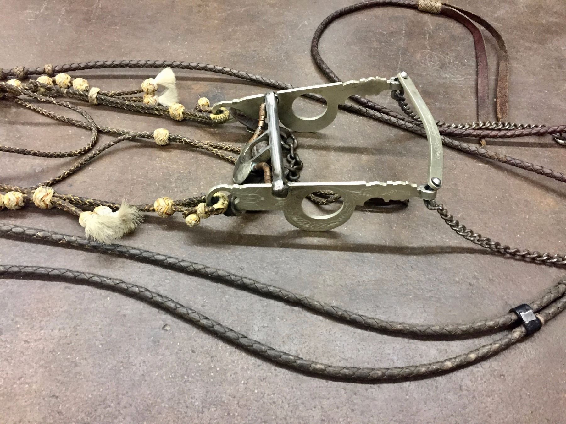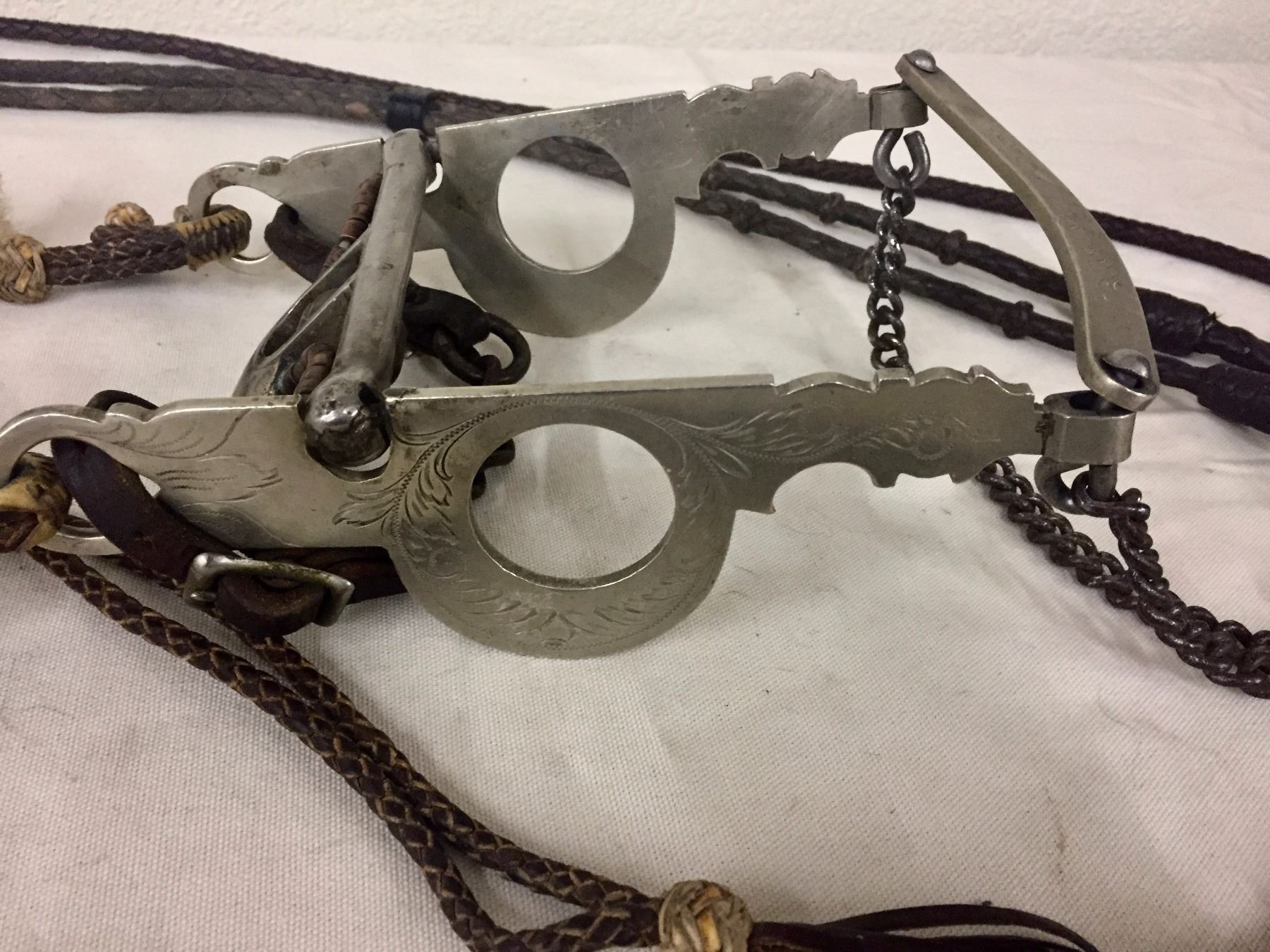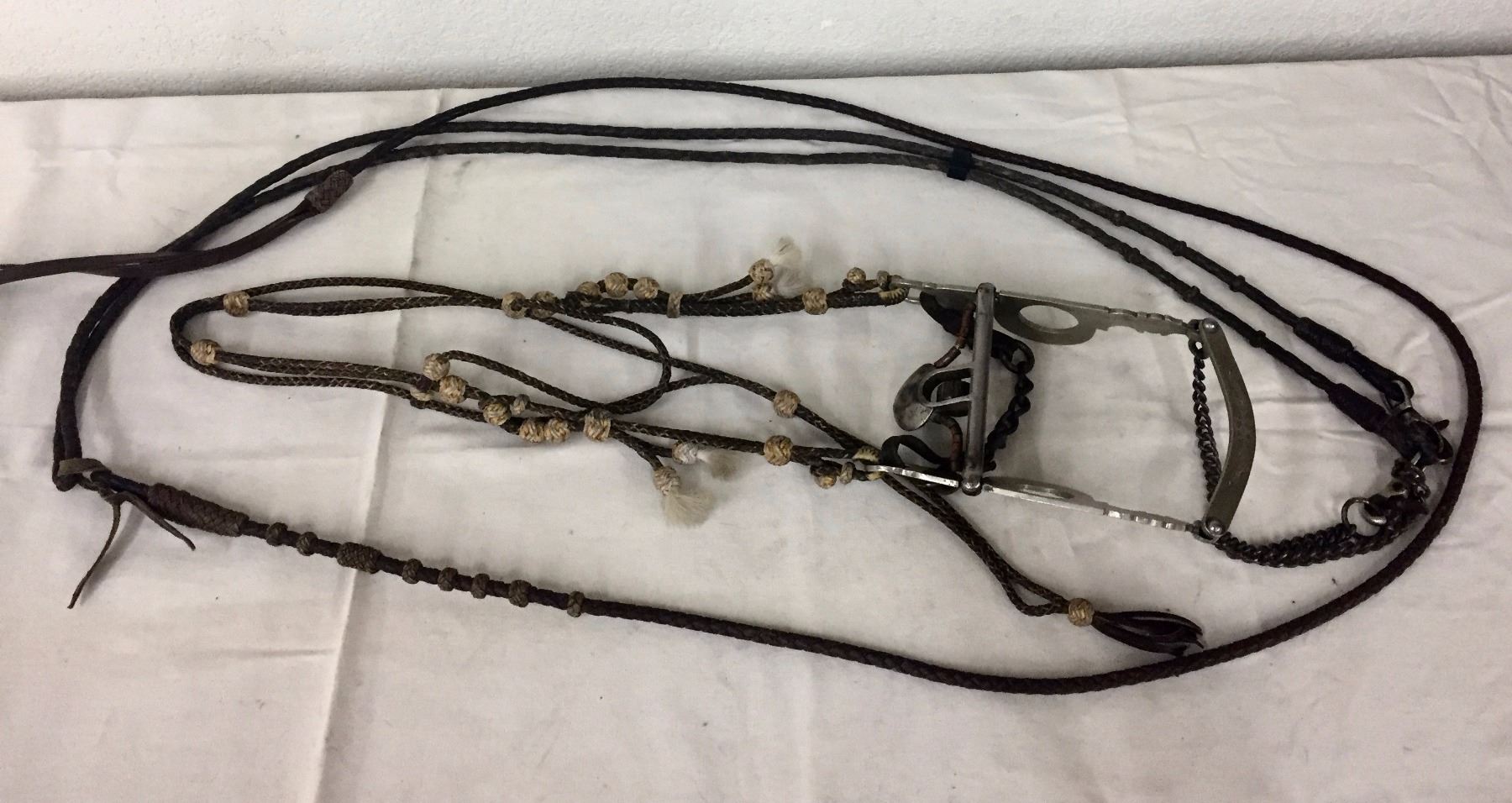 Maker: Bit is marked, Keystone S.F. Cal. Headstall and reins are handmade (braided) leather and rawhide. Approx. Age: Vintage. Size: Bit has a 5" mouthpiece and is 8.5" long. Headstall and reins are pretty standard size and are also adjustable. Additional Info: Nice vintage bit and nicely braided headstall and reins. Condition: Pretty good for its age, normal wear expected. Please look closely at the pictures - they are an important part of our description. Shipping: There will be a $7 handling / packaging fee for shipping this lot. The actual cost of postage will be added on top of that.