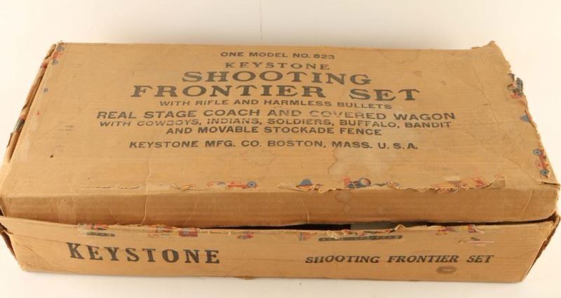 Model 823 includes a real stagecoach, covered wagon, cowboys, Indians, buffalo, soldiers, bandit and removable stockade fence. In original box.
