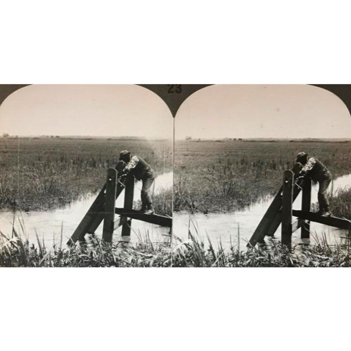 Vintage African American, Gullah History subject. Vintage early 1900's Keystone stereoview card entitled Opening The Flood Gates - Flooding a Rice Field at High Tide, South Carolina USA. With information about the scene on the reverse side. Comes in protective sleeve. Part of a former museum collection in South Carolina. Â