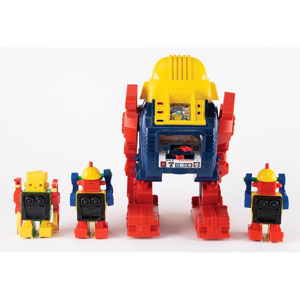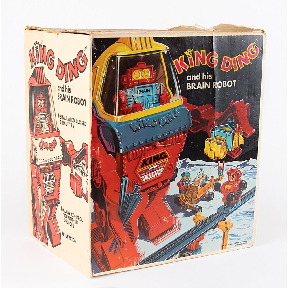 Vintage circa early 1970s battery-operated "King Ding" toy robot with "Brain" seated inside, made by Topper Toys, standing at 14˝ tall. King Ding's right arm has broken off at the joint with evidence of prior repair. Includes its original box, advertising the "Simulated closed circuit TV," "Claw control to pick-up objects," "Elevator," and "Brain Robot," as well as the other toys and accessories in the Ding-a-Ling toy series. Additionally accompanied by four Ding-a-Ling miniature toy robots—Fireman, Constructo (2), and Claw—one with its damaged original box.