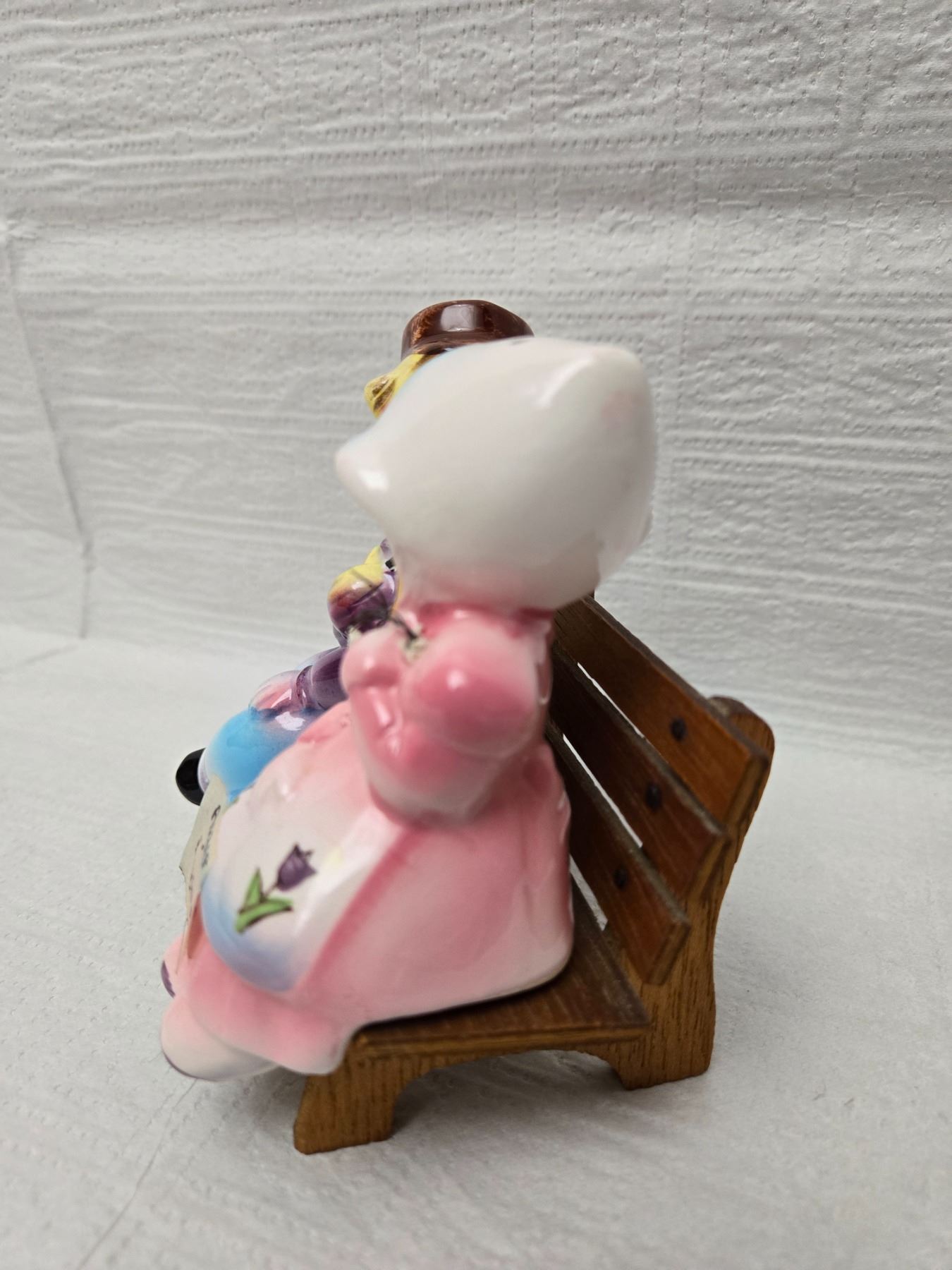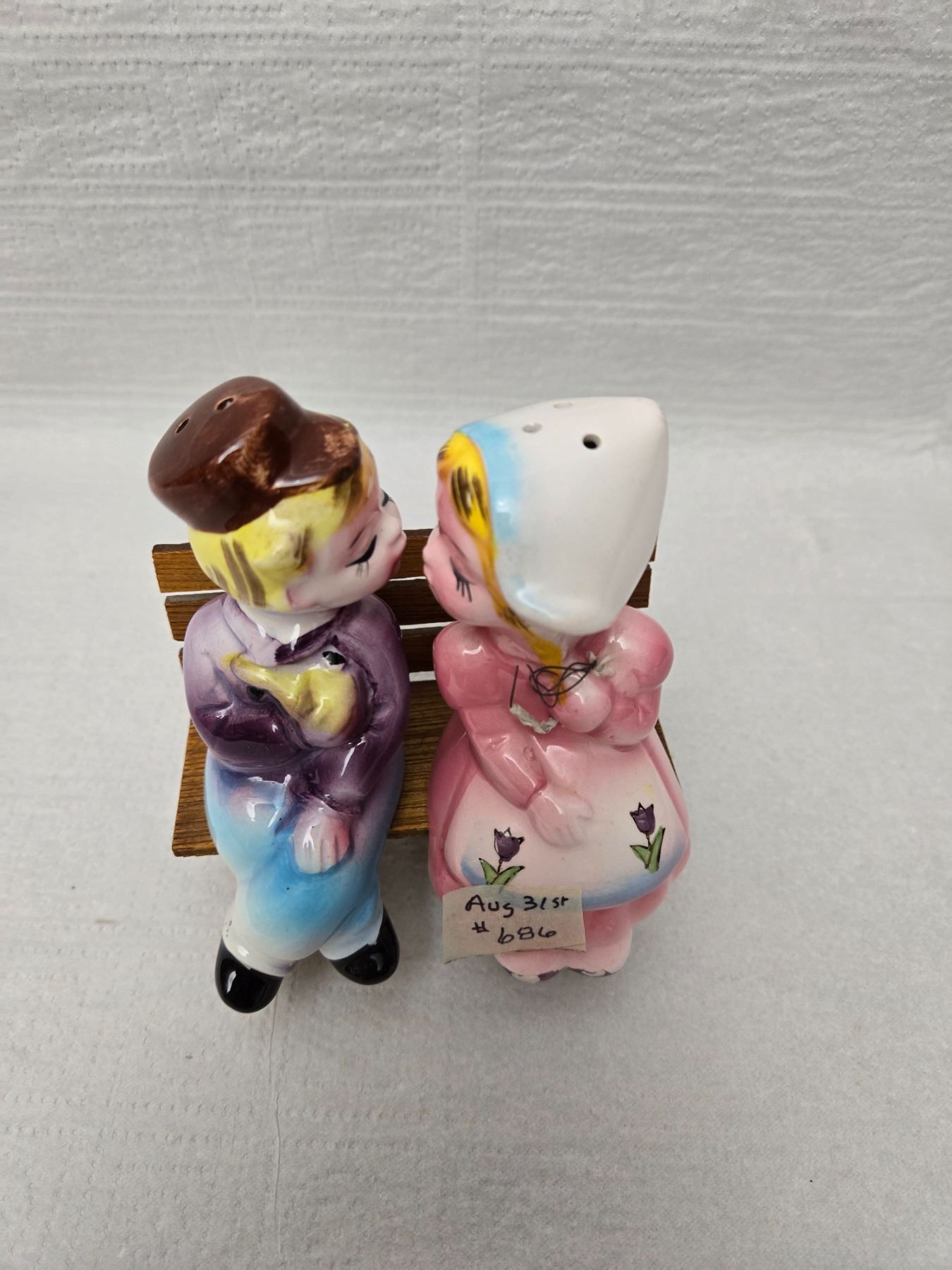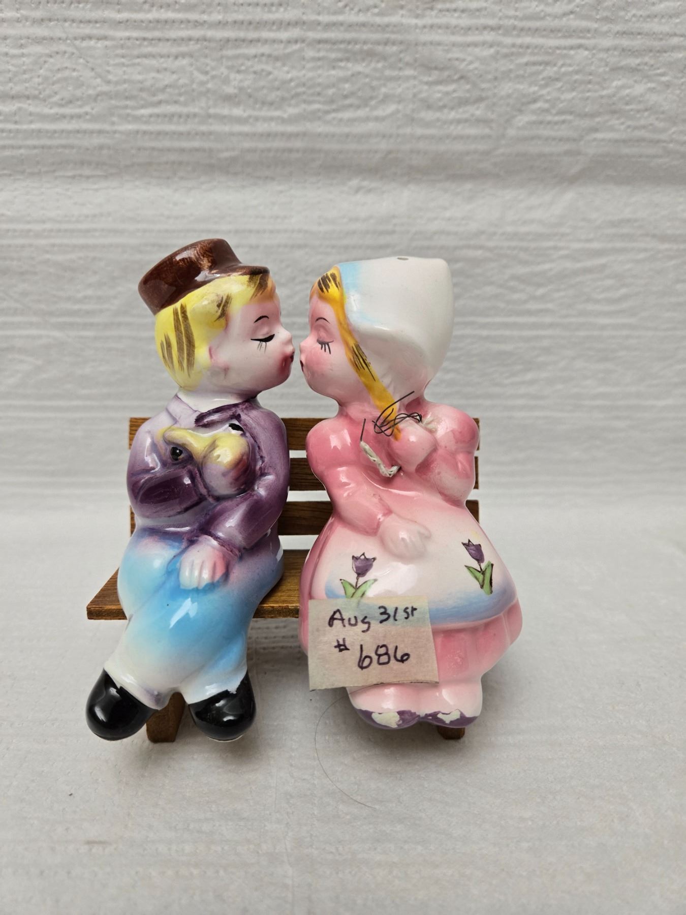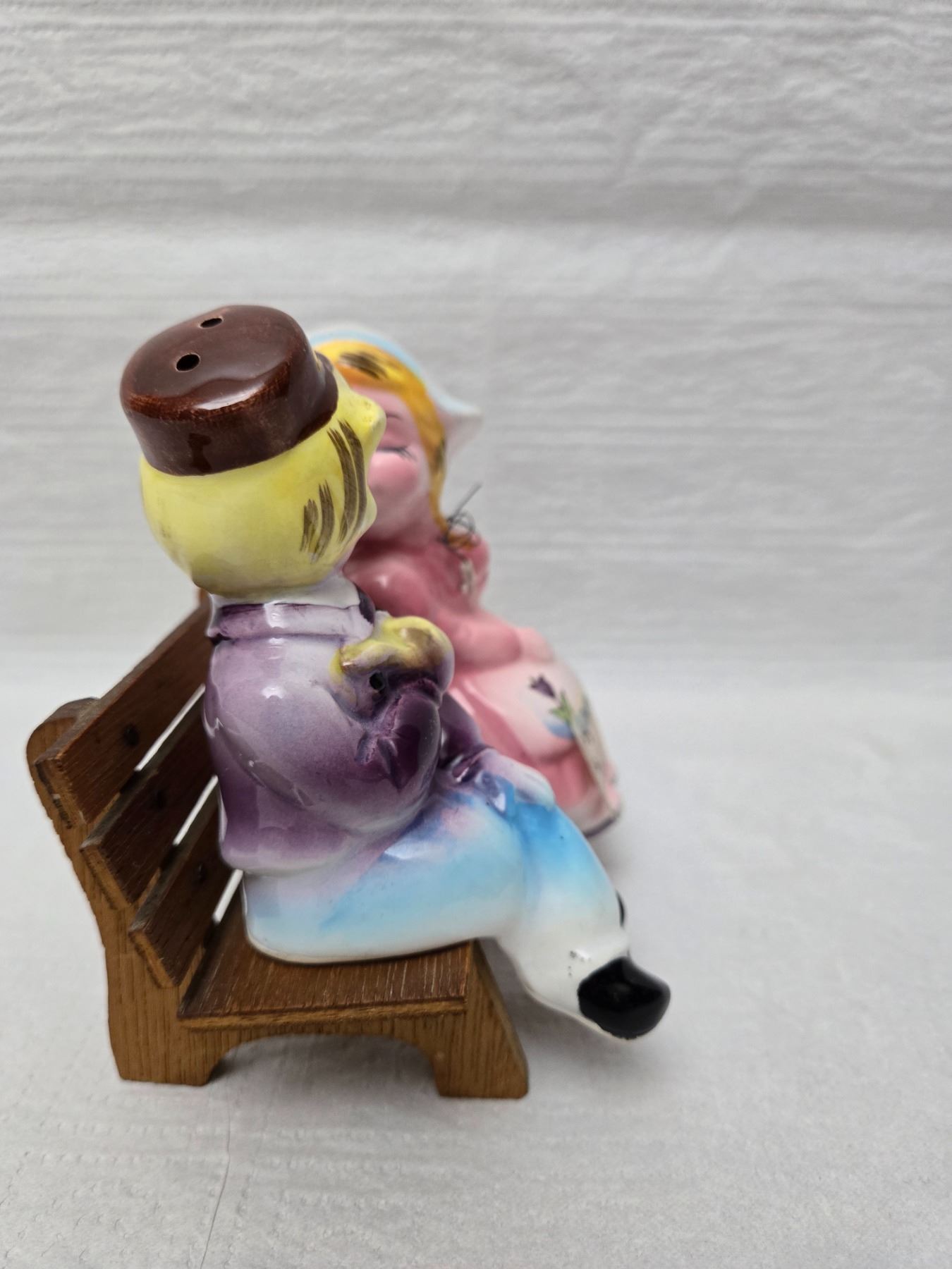 Vintage Kissing Dutch Boy and Girl on Wooden Bench - Salt and Pepper Shakers