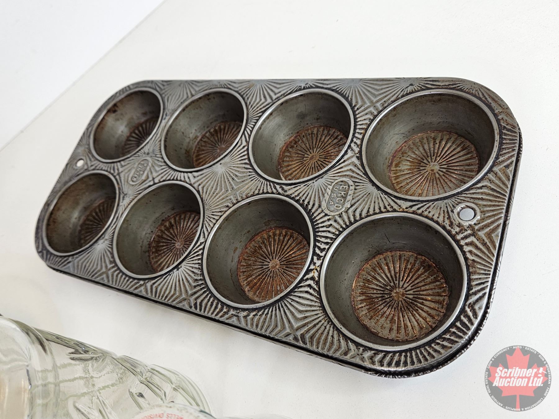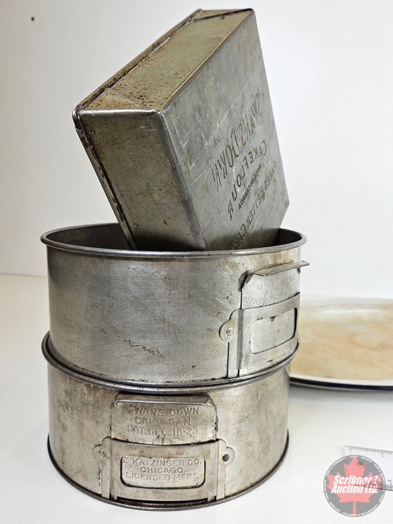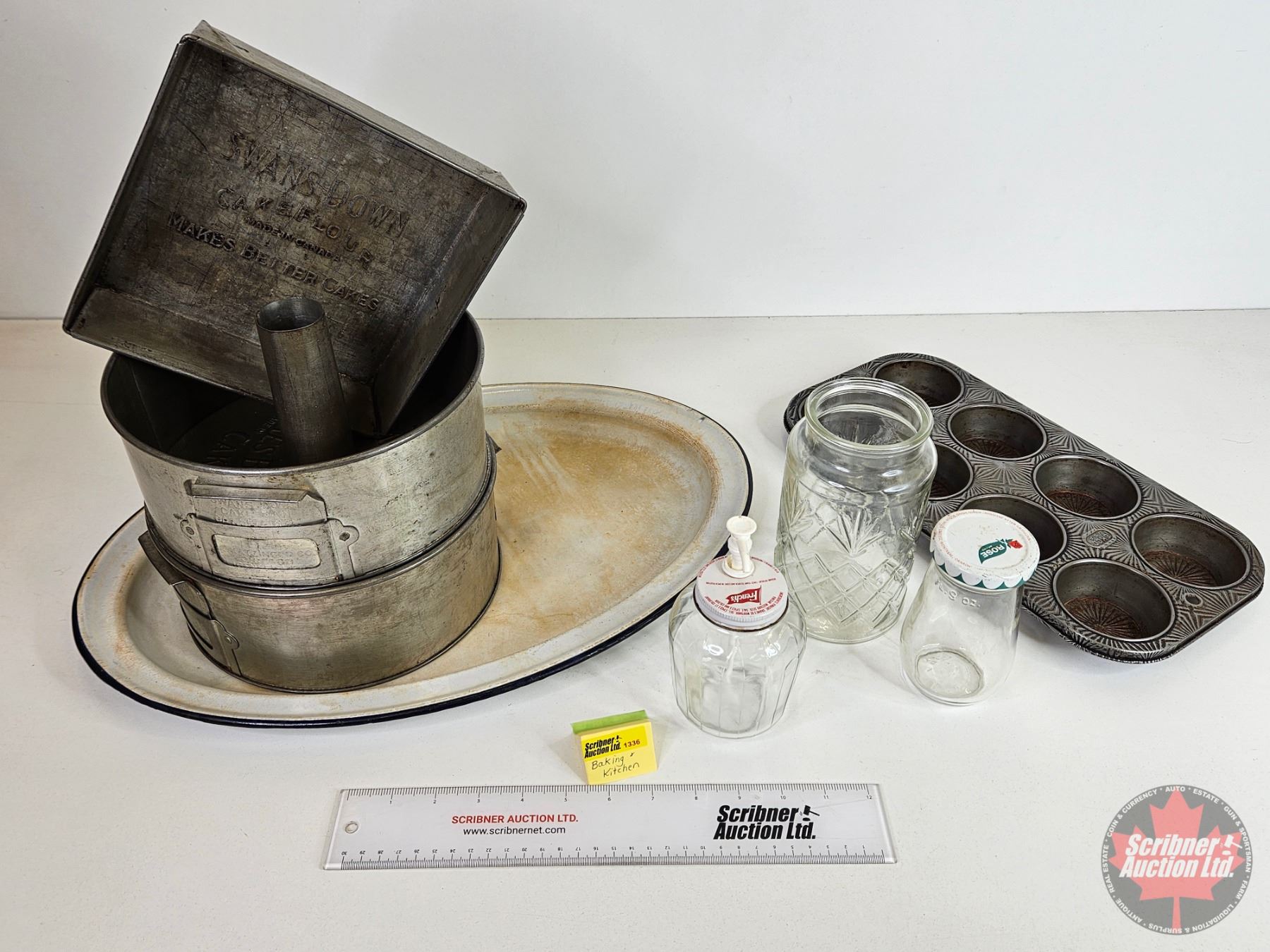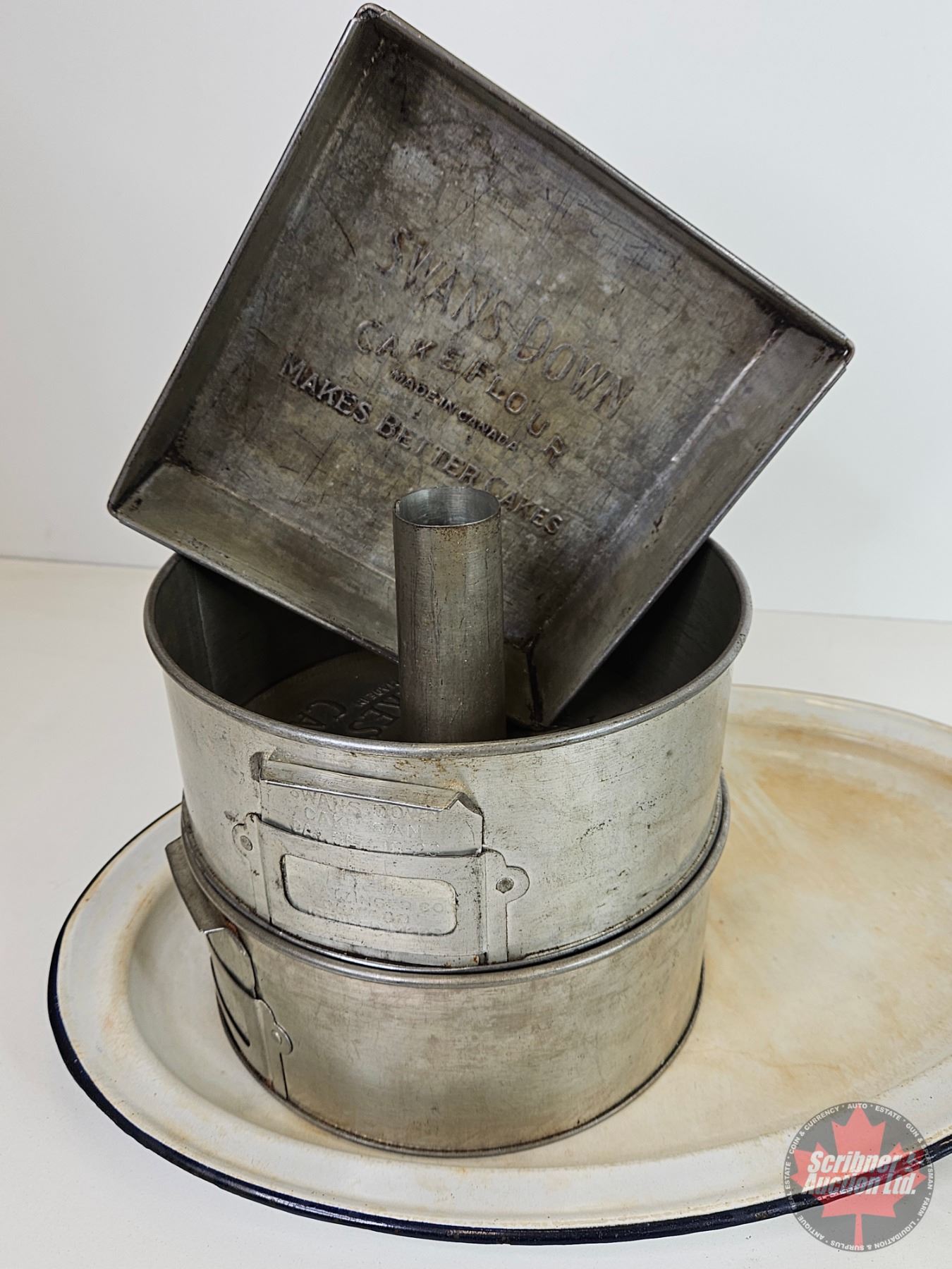 Vintage Kitchen Collectors Combo: Enamel Platter; Cake Pans "Swans" Embossed; Muffin Tin; Jars; etc