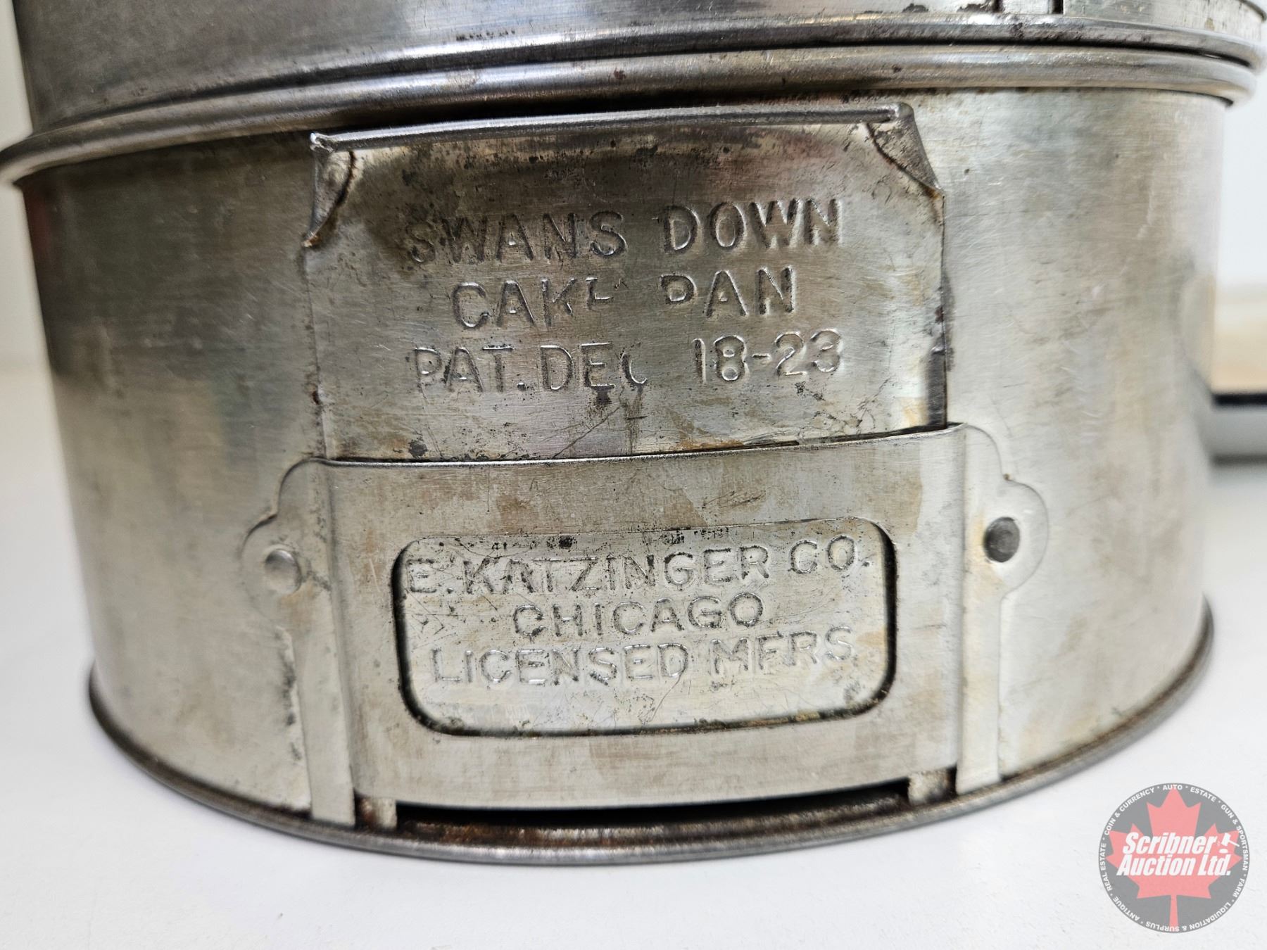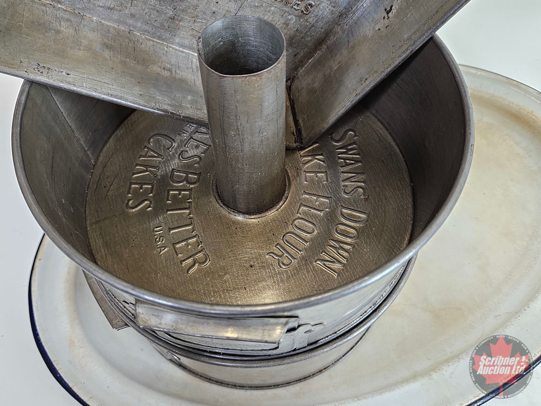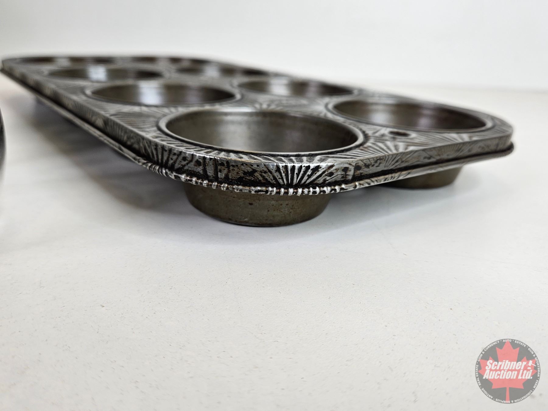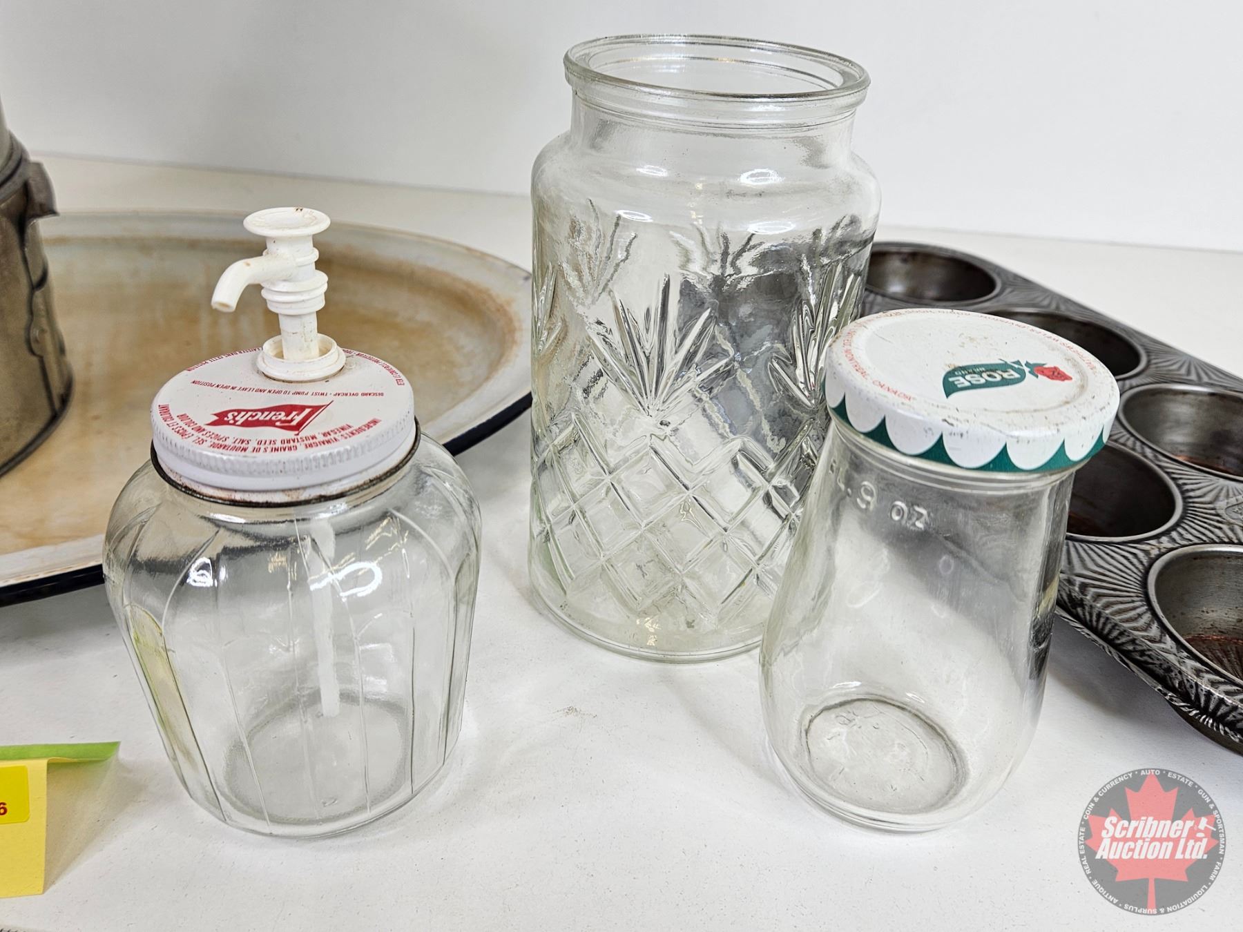 Vintage Kitchen Collectors Combo: Enamel Platter; Cake Pans "Swans" Embossed; Muffin Tin; Jars; etc