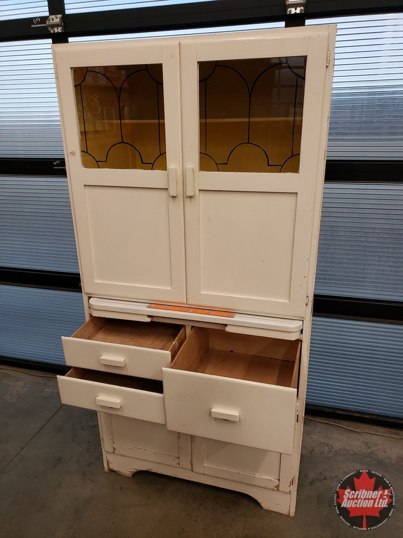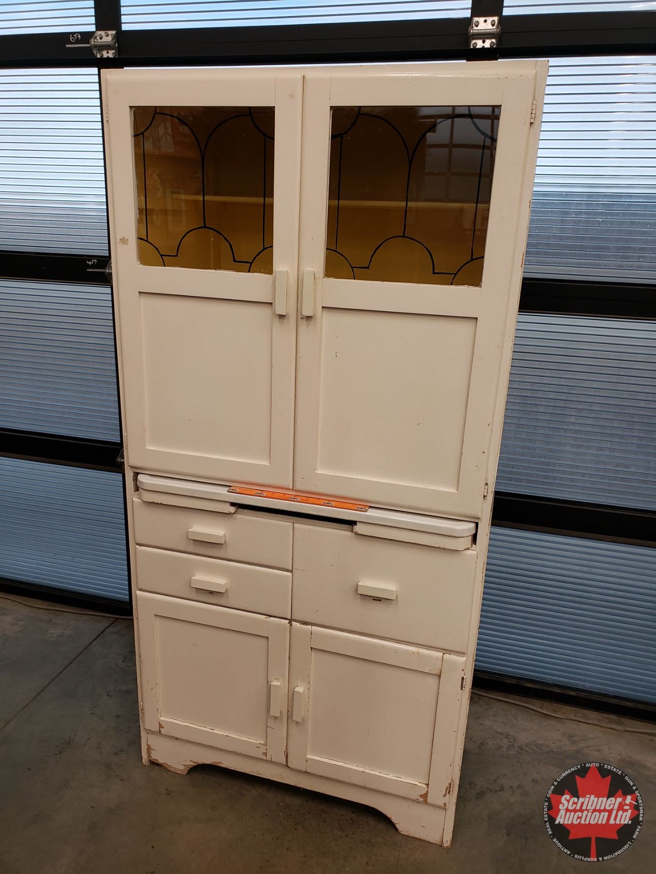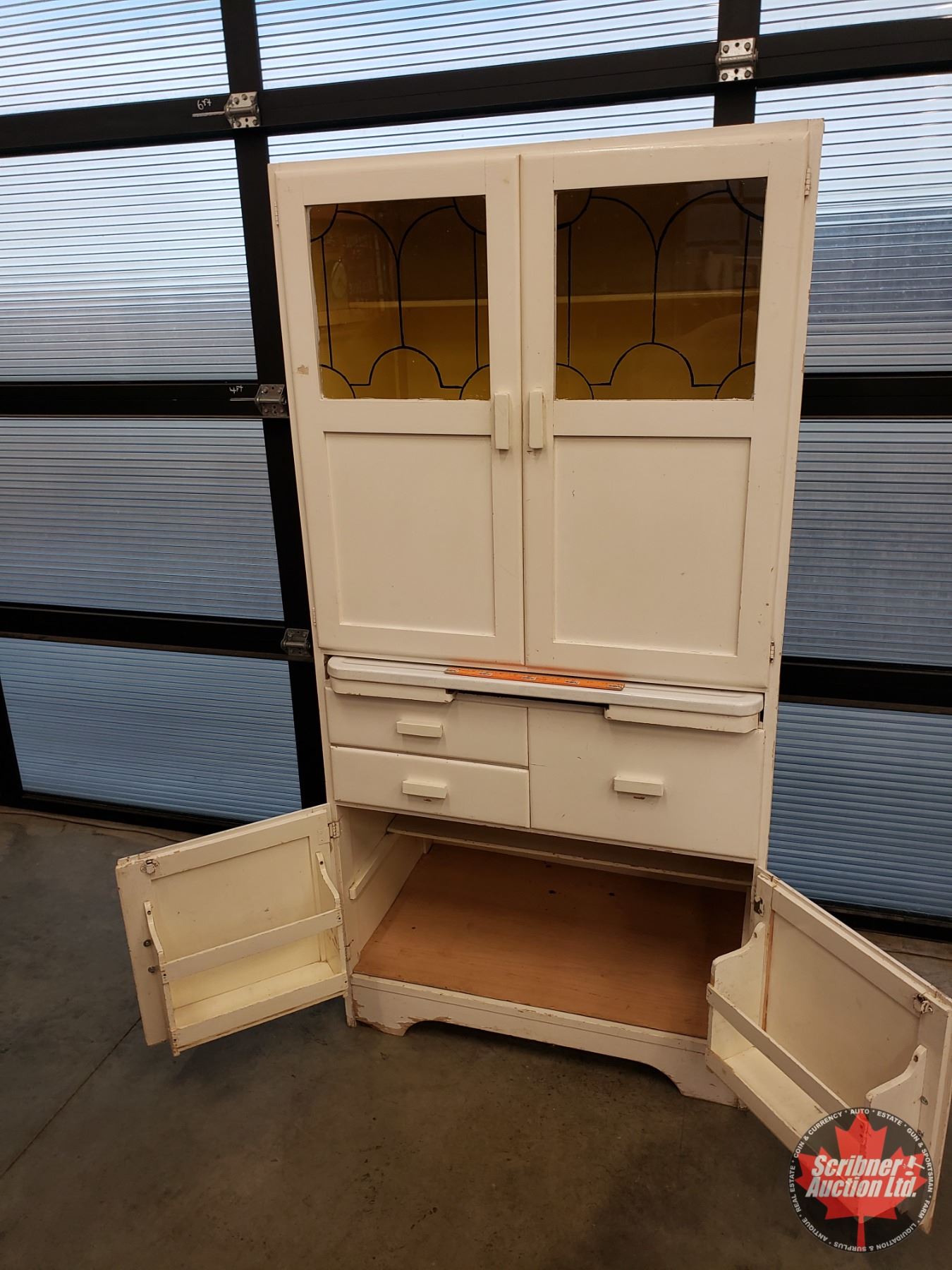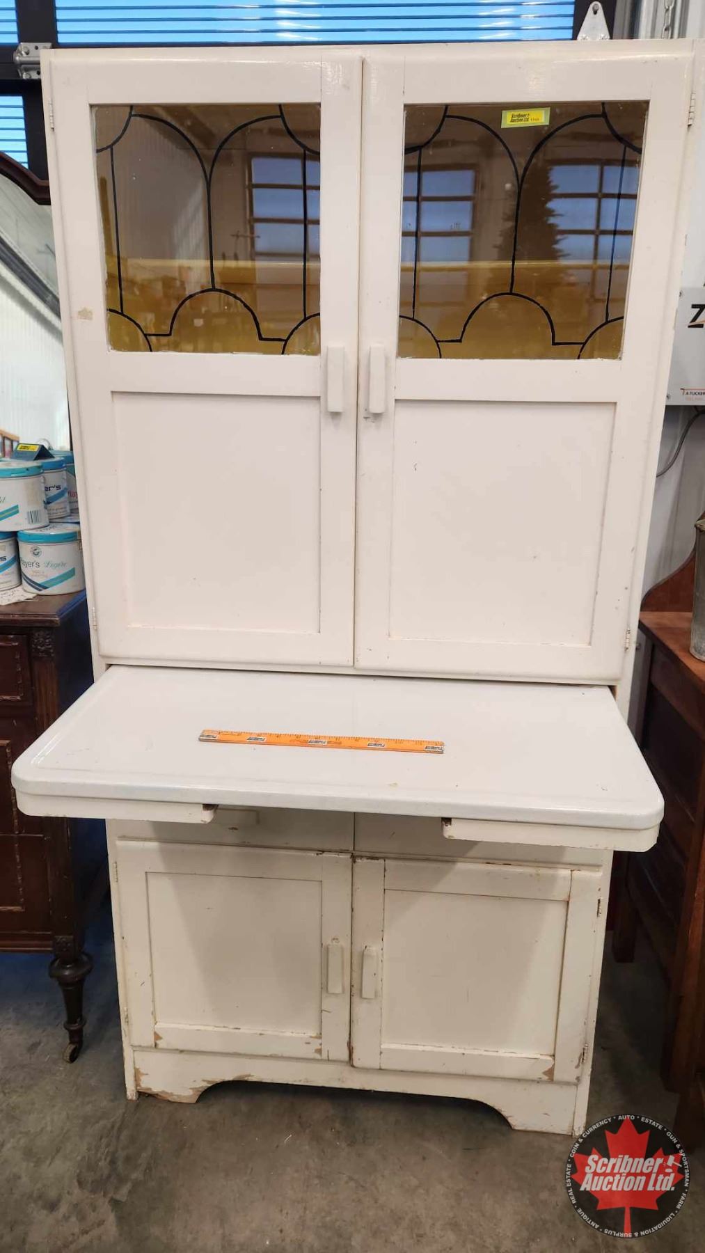 Vintage Kitchen Cupboard with Slide Out Enamel Top Work Surface - Glass in Top of Cupboard Doors - Painted Lattice Design (65"H x 32-1/4"W x 21"D) (SEE PICS!)