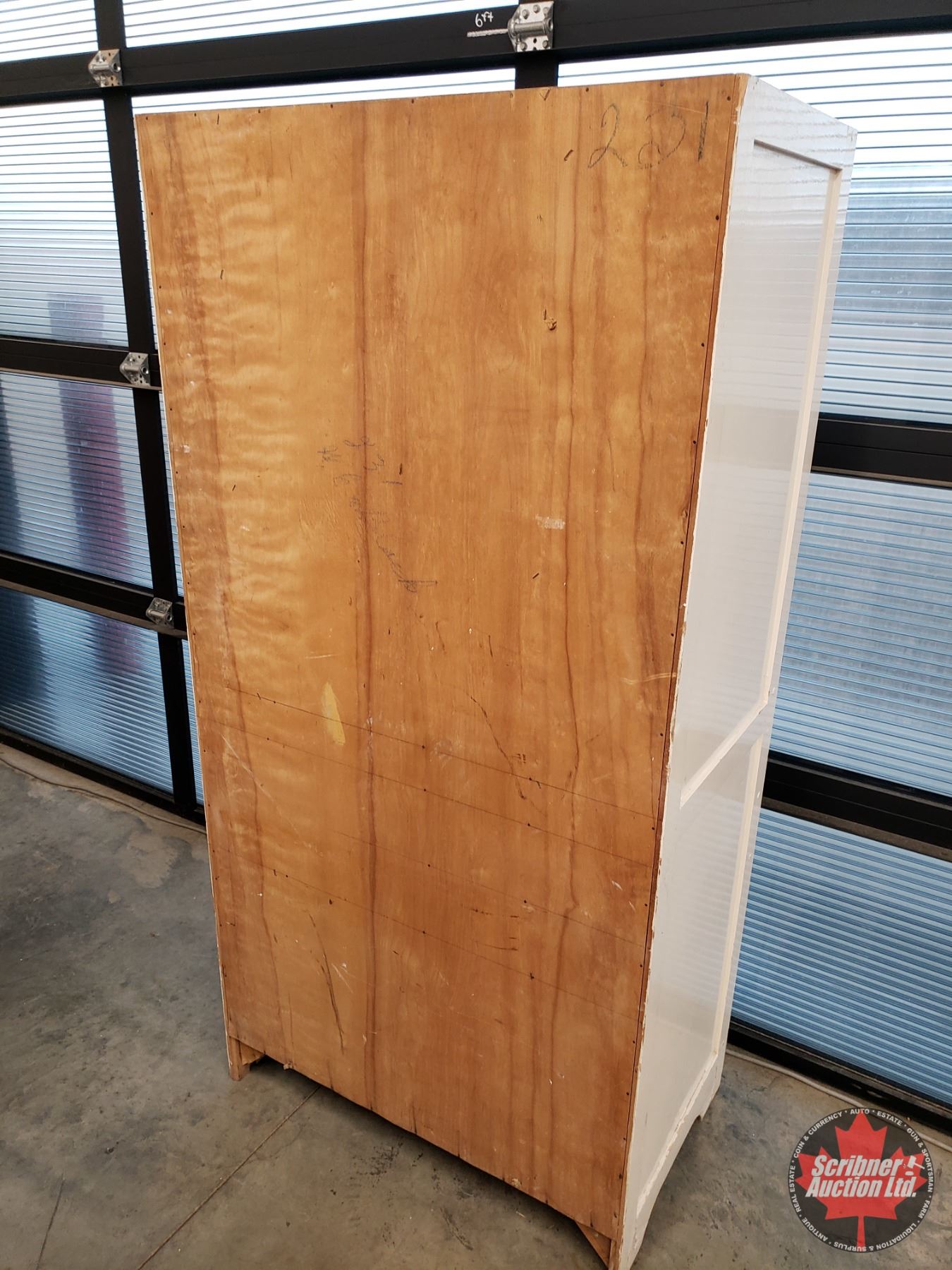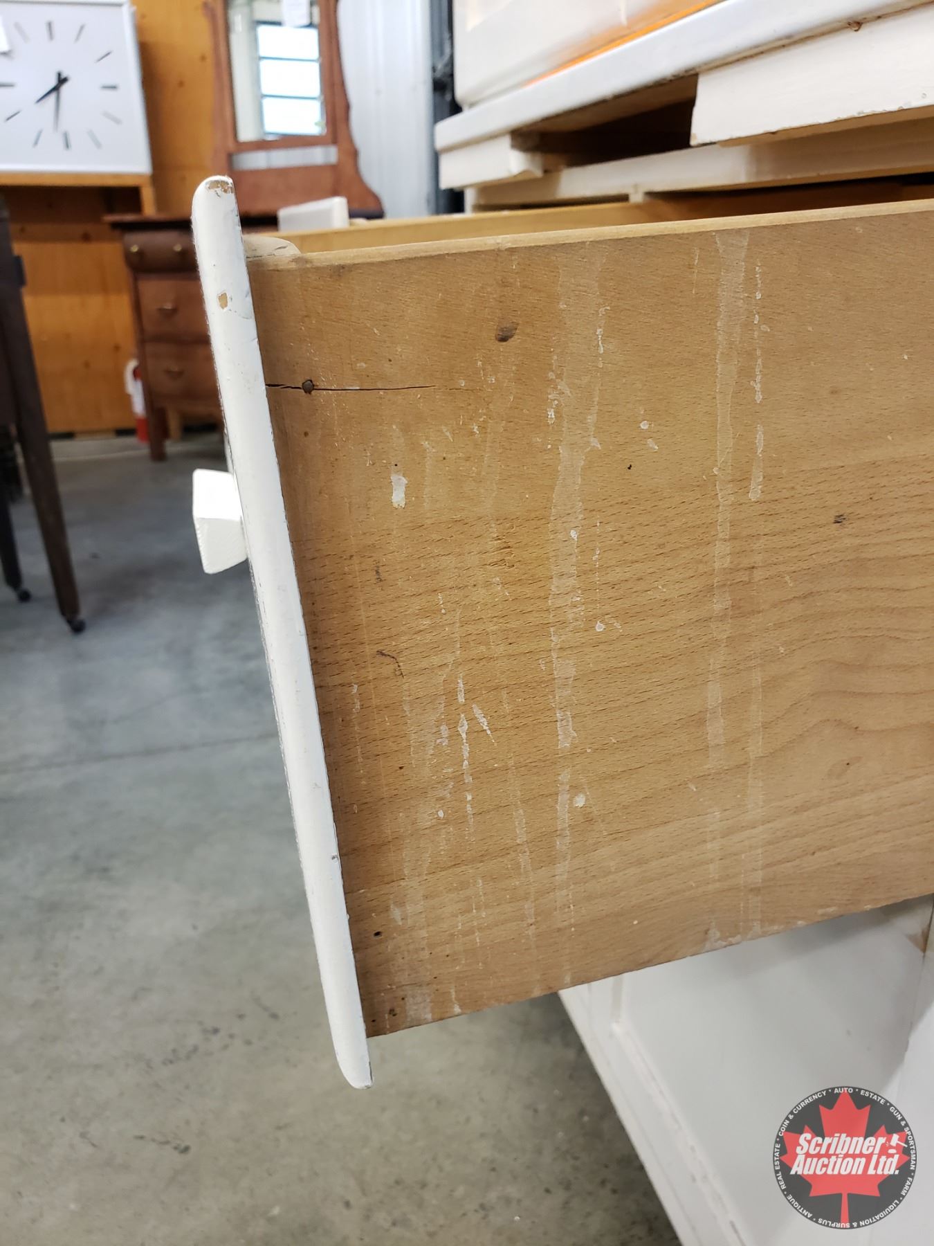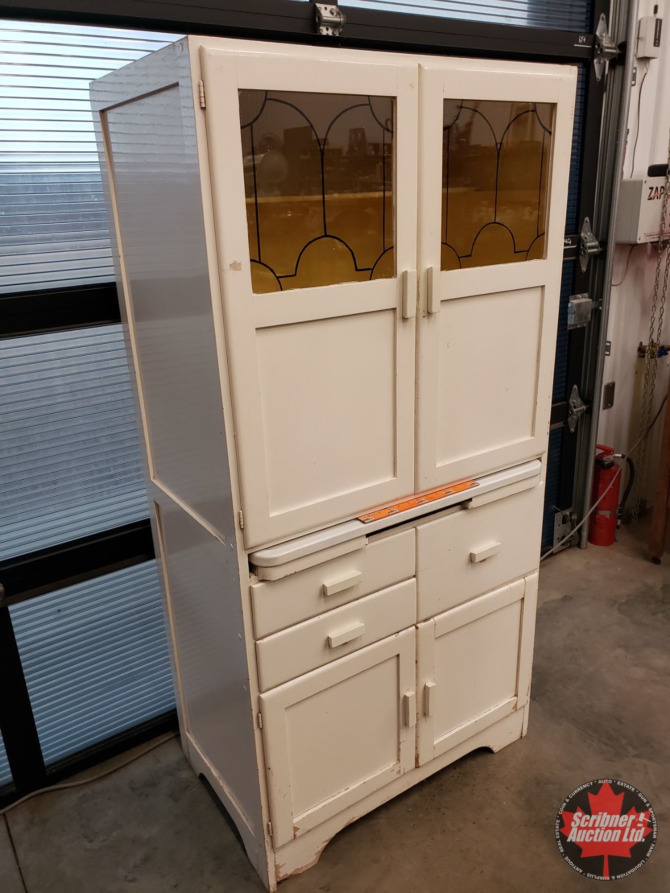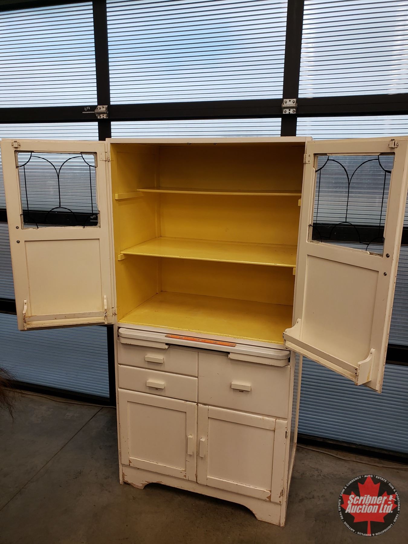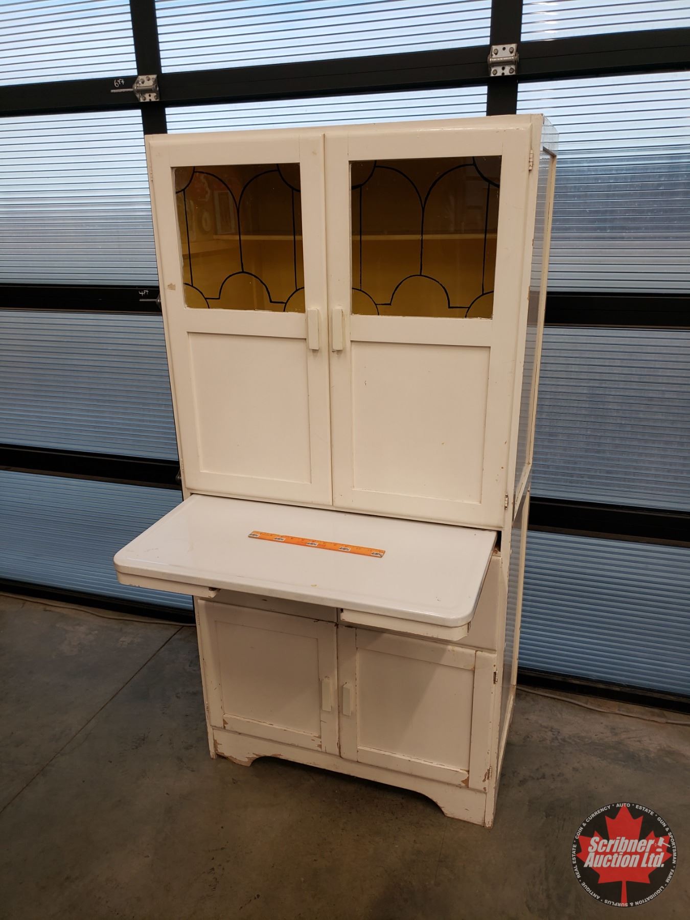 Vintage Kitchen Cupboard with Slide Out Enamel Top Work Surface - Glass in Top of Cupboard Doors - Painted Lattice Design (65"H x 32-1/4"W x 21"D) (SEE PICS!)