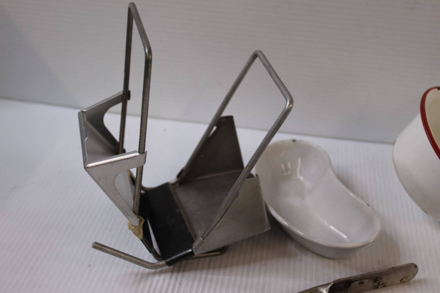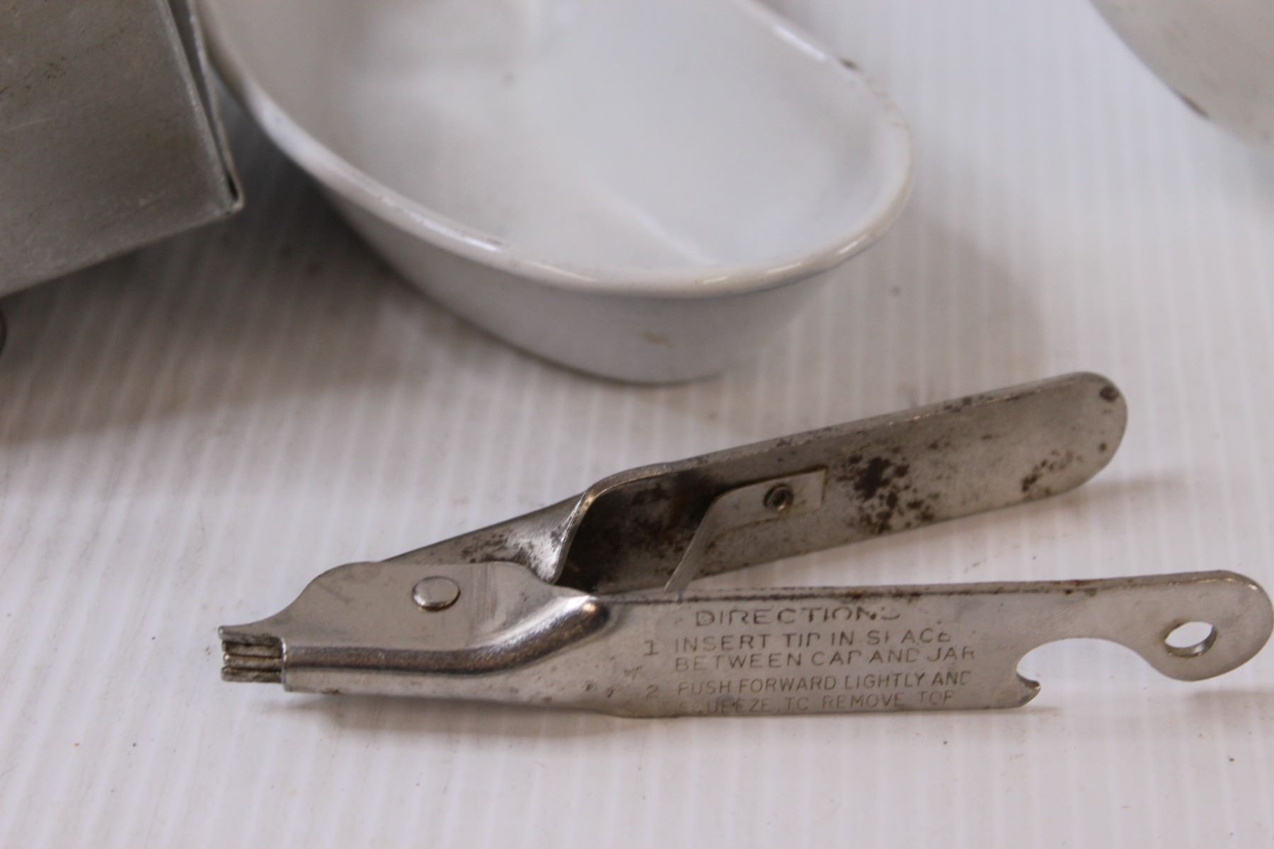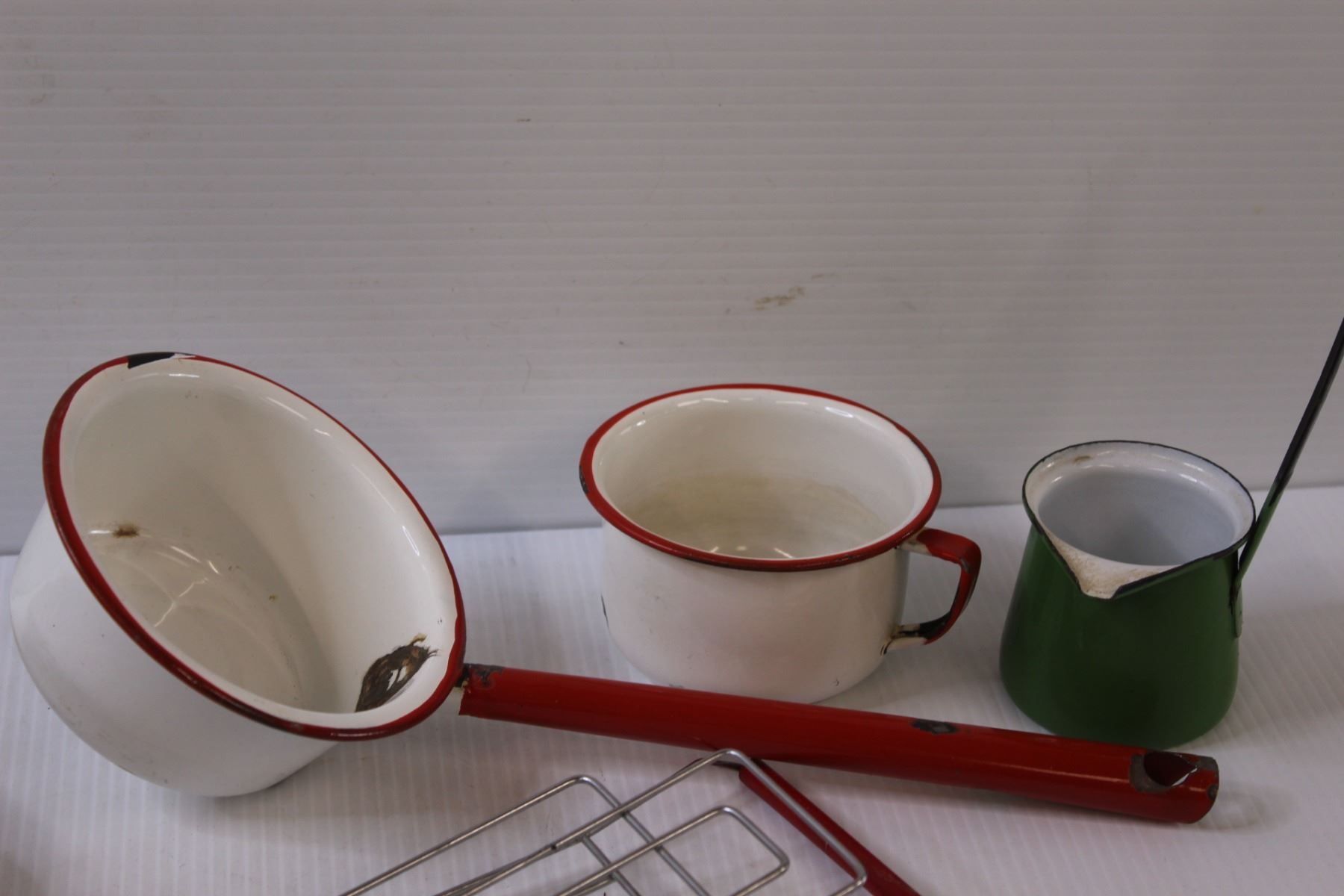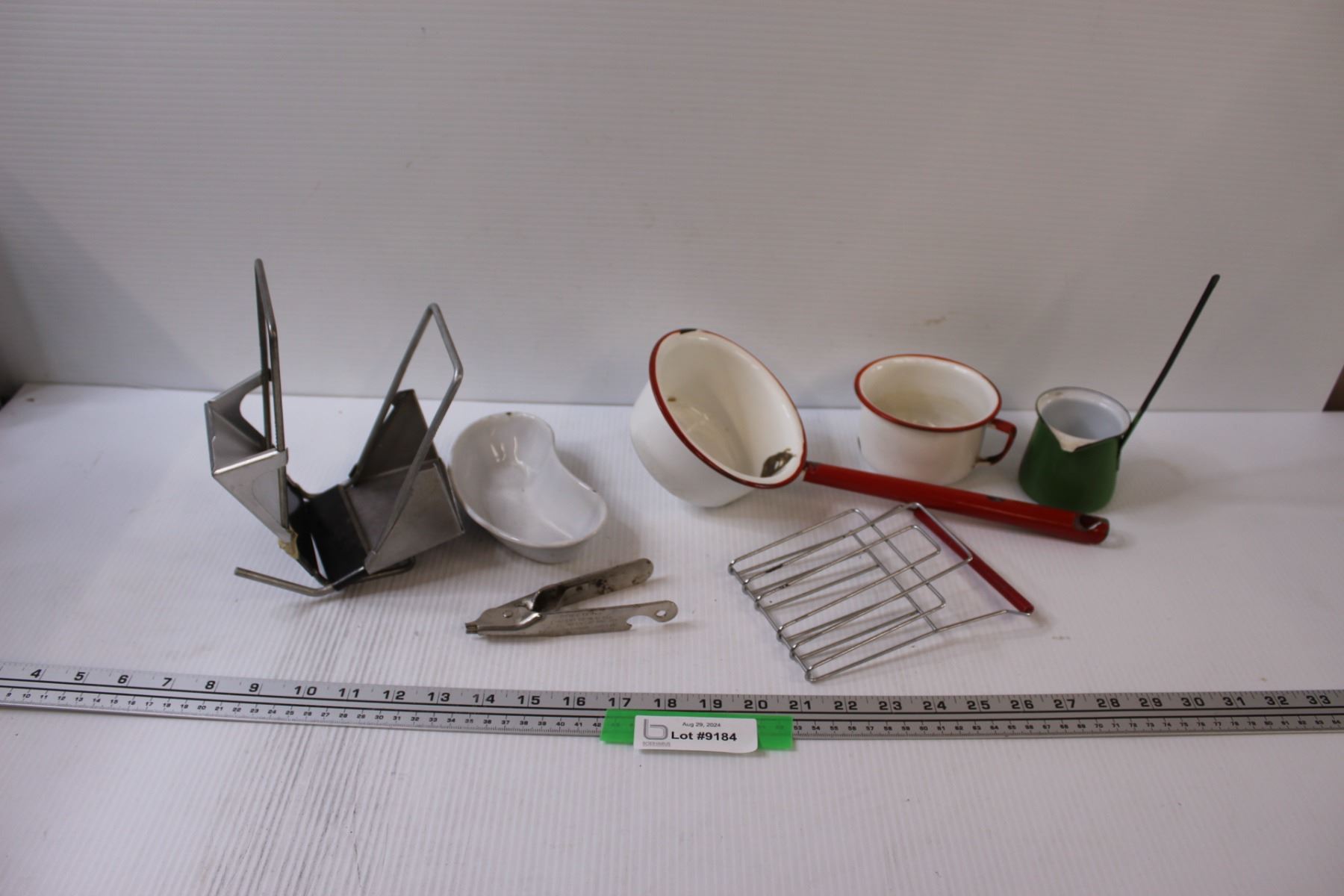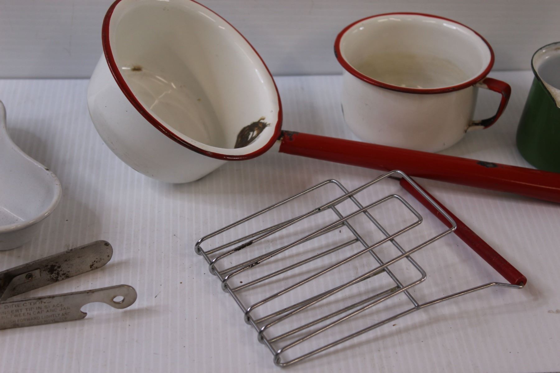 Vintage Kitchen Items: (3) Enamel Scoops/Ladles, Tray, Hand Held Toaster, Can Lid Opener, Misc.