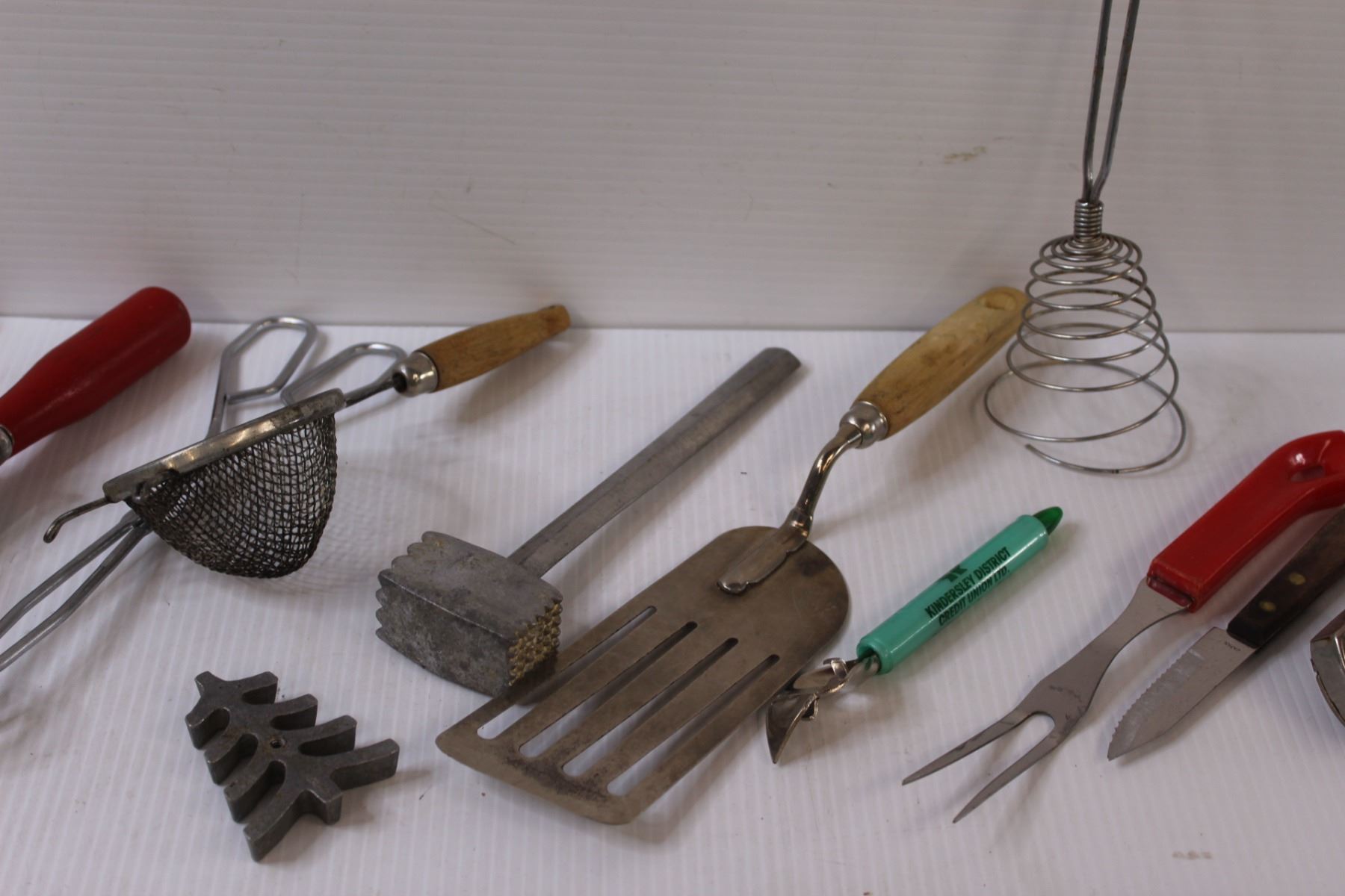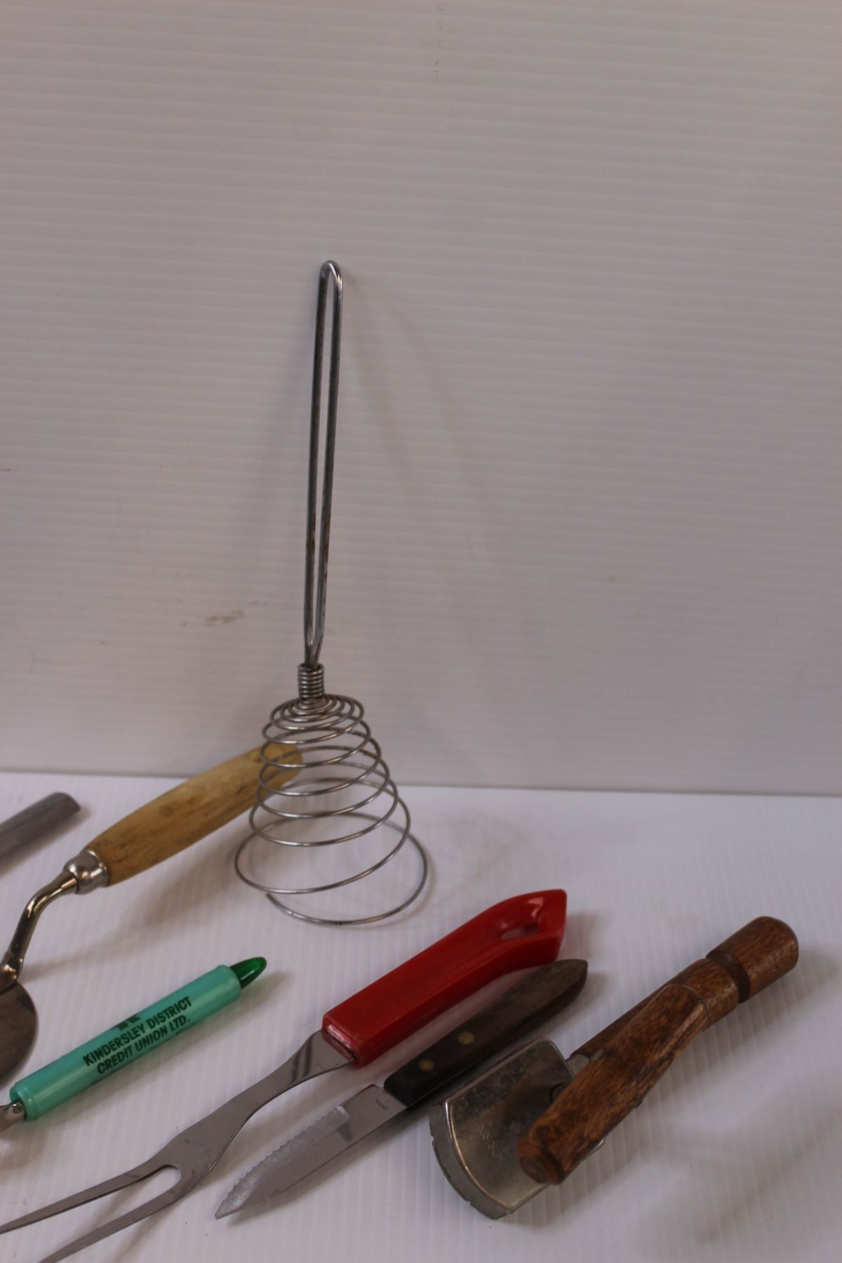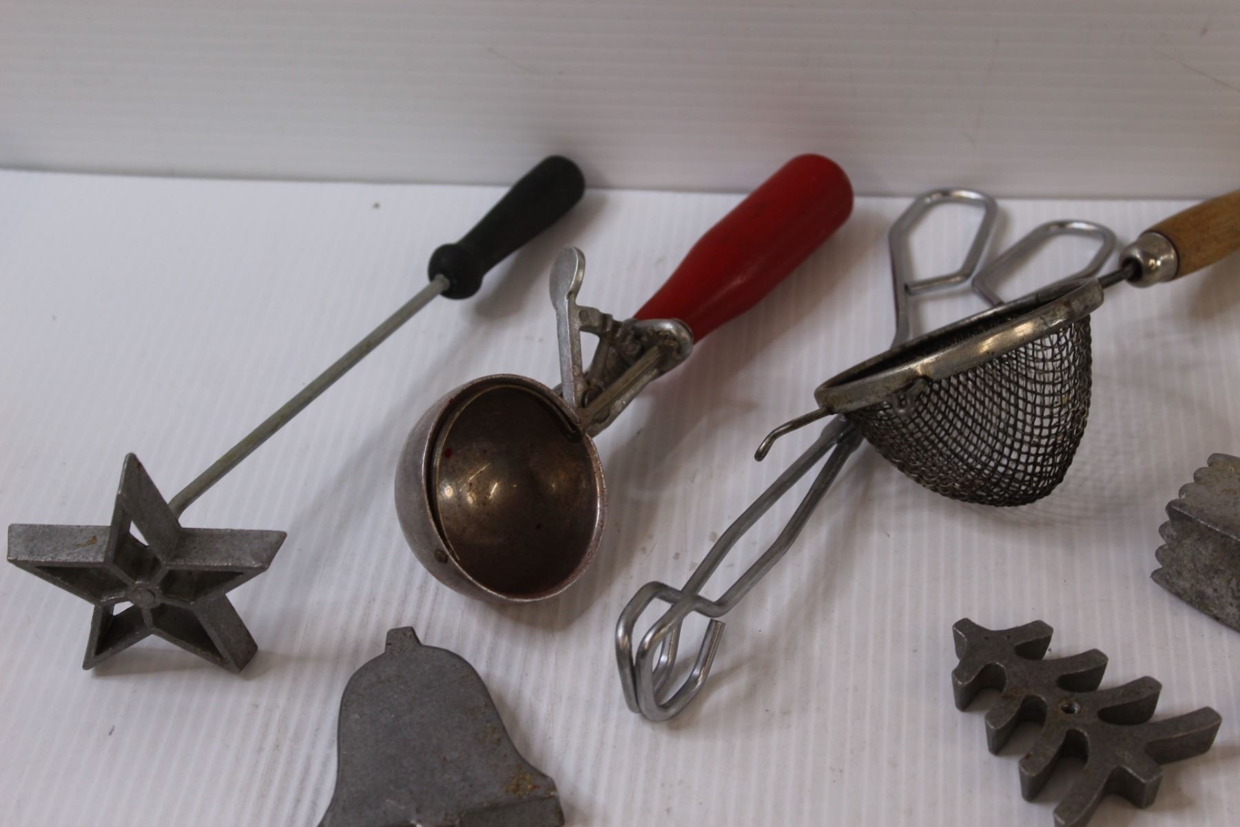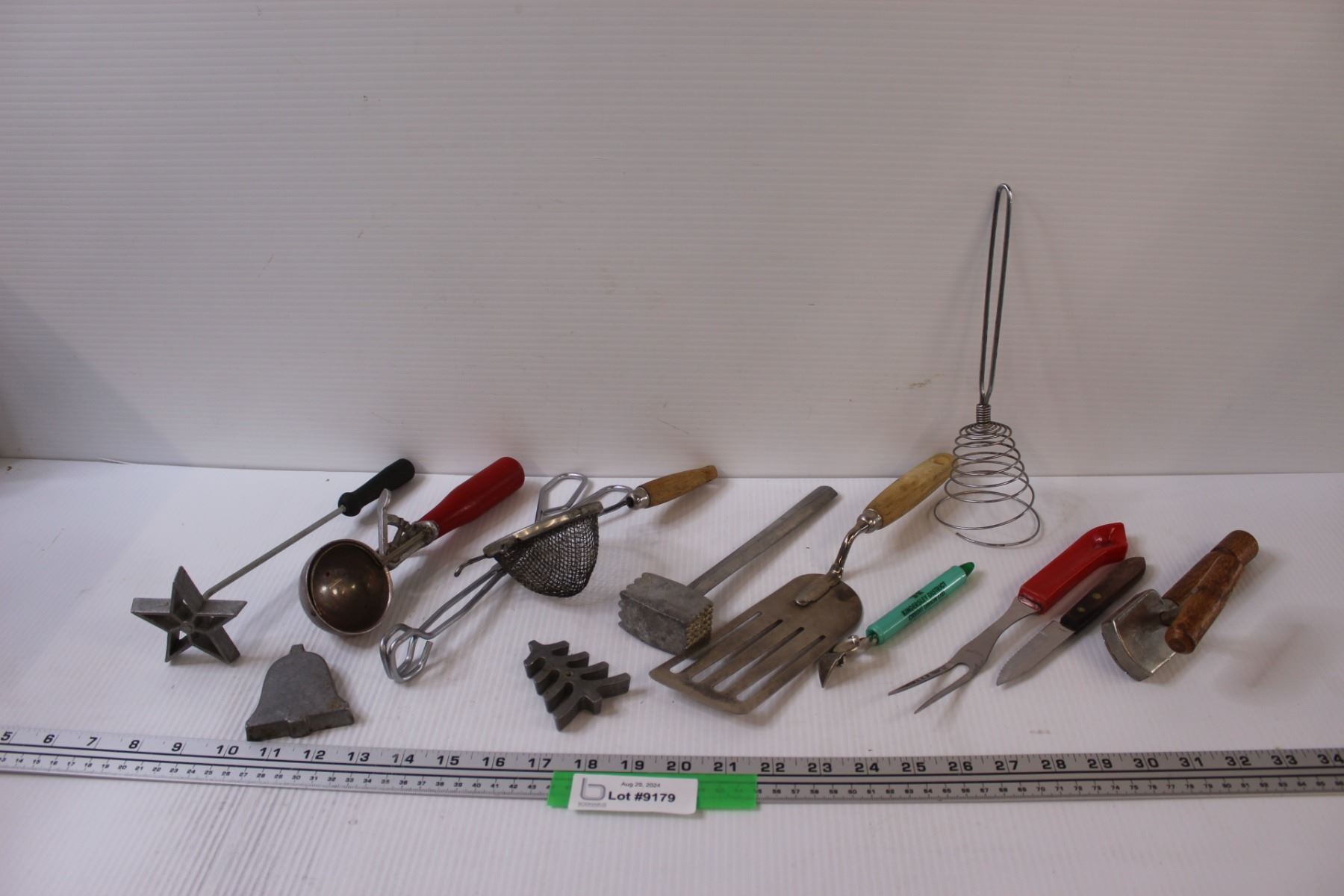 Vintage Kitchen Items: Ice Cream Scoop, Egg Sheller, Spatula, Mallet, Misc.