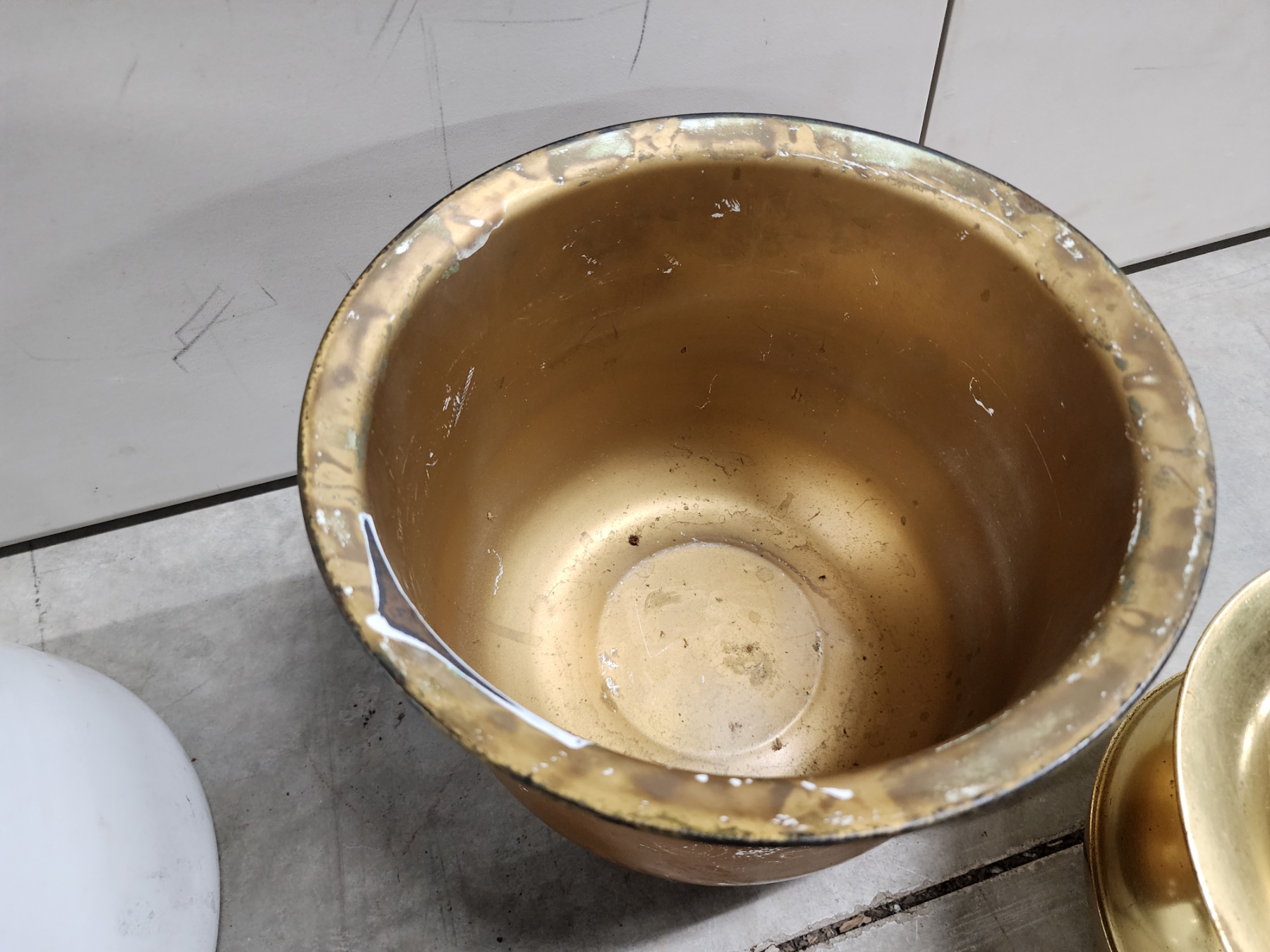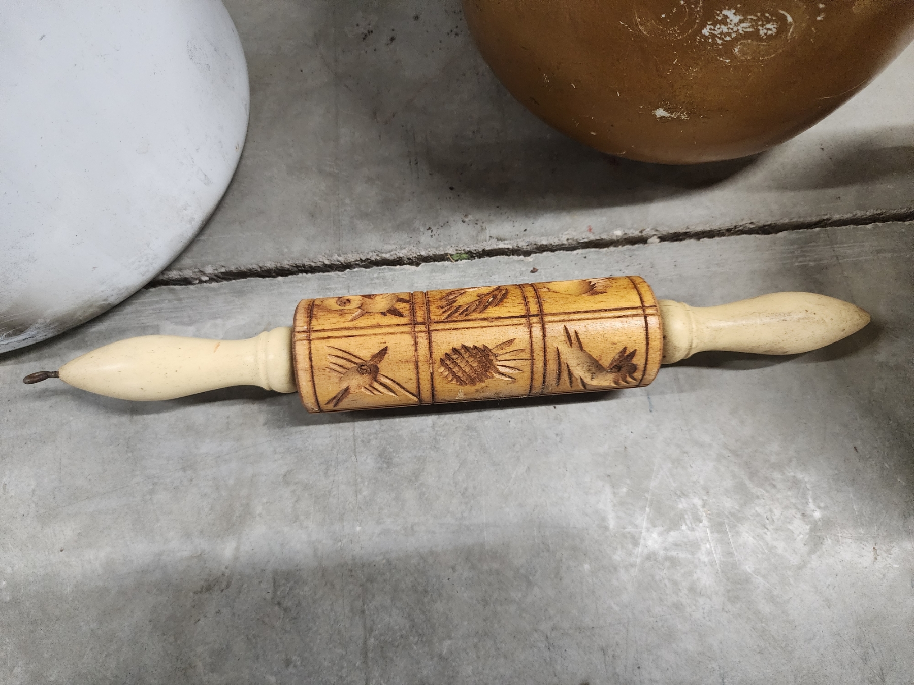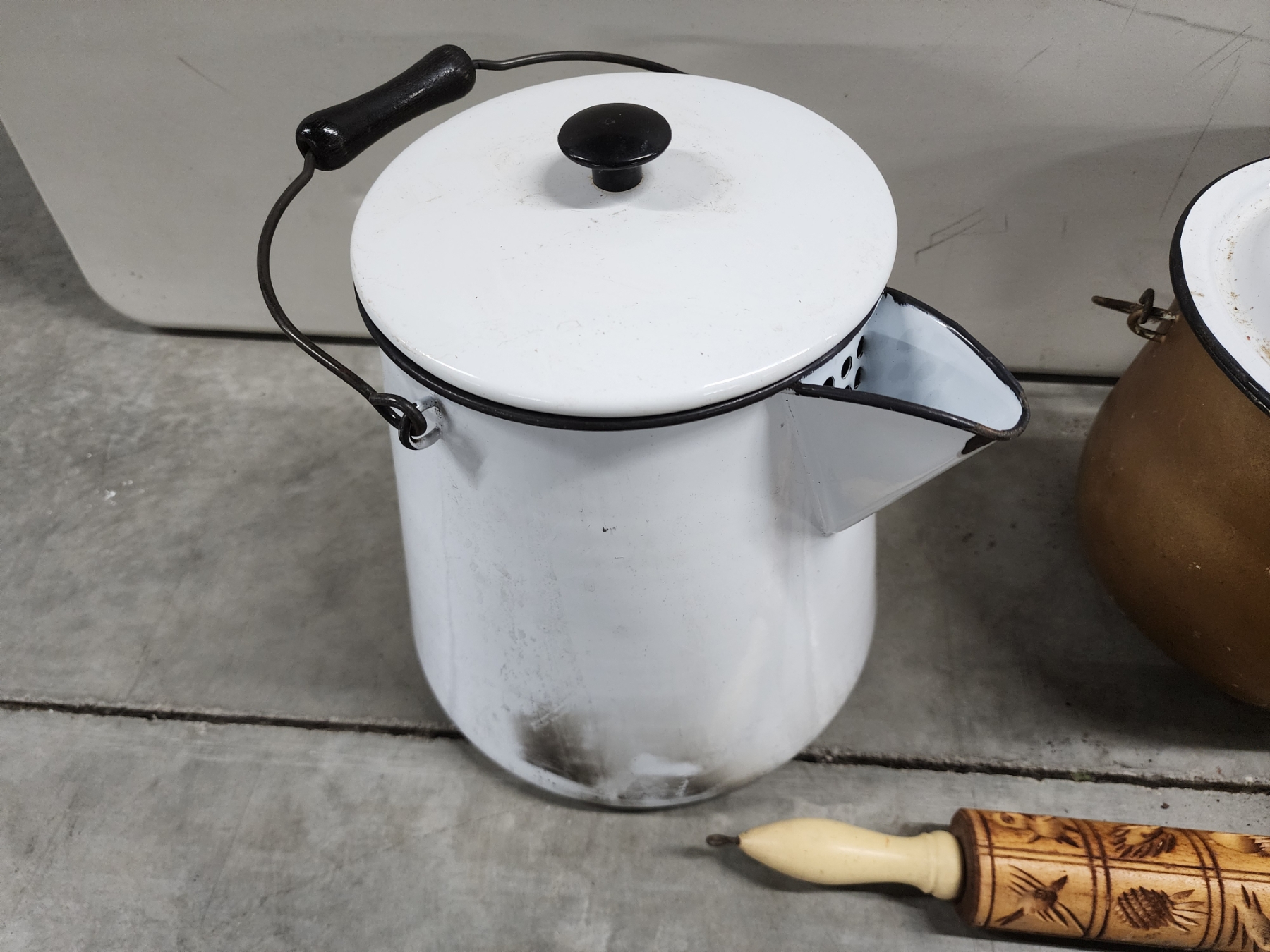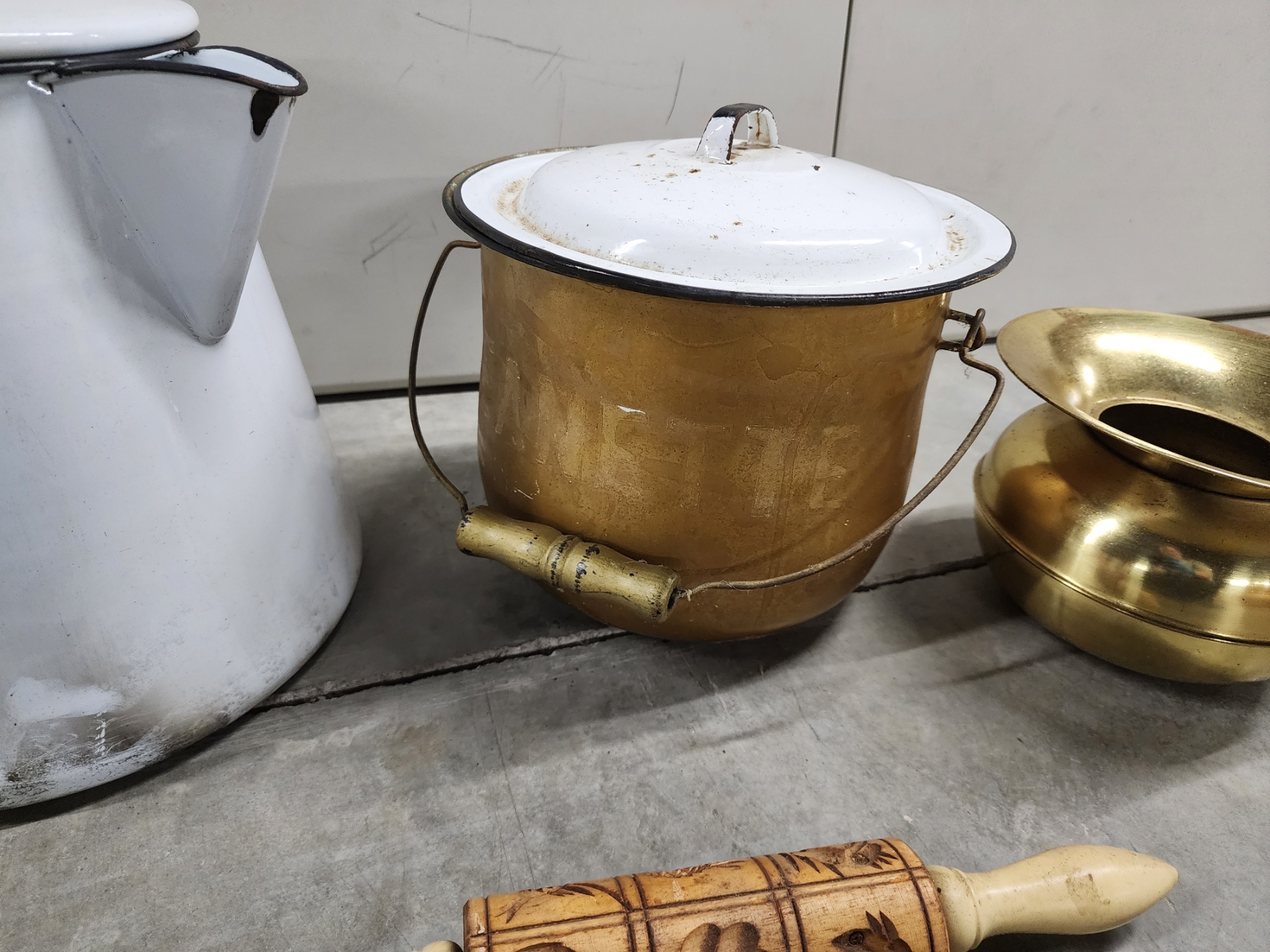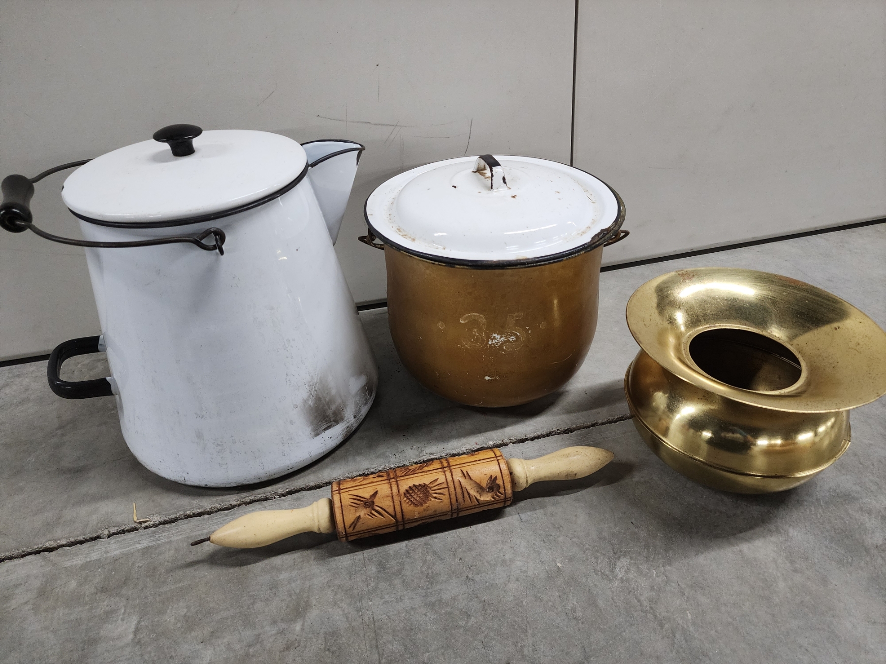 Vintage Kitchen Items: Large Enamel Boiler, Rolling Pin, Enamel Pot with Lid, Brass Spittoon/Vase