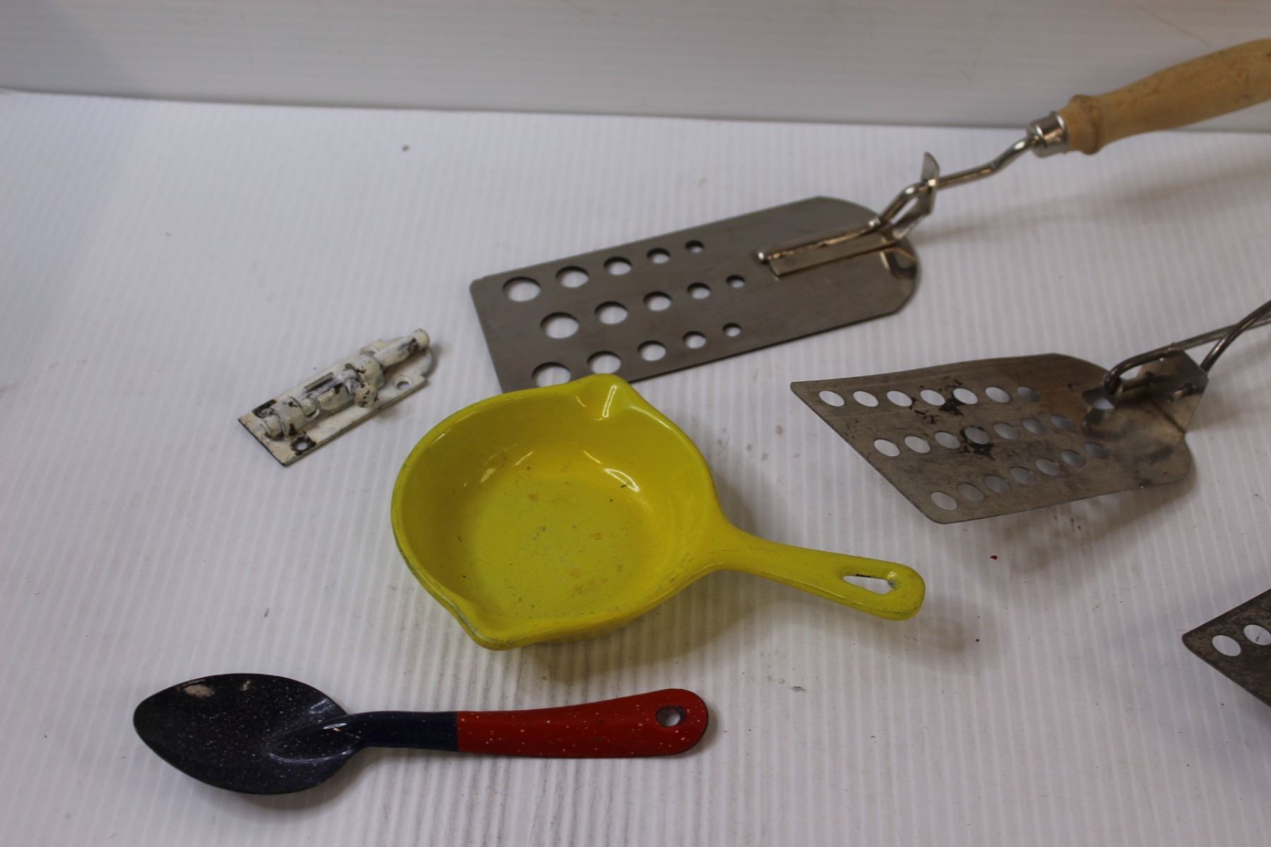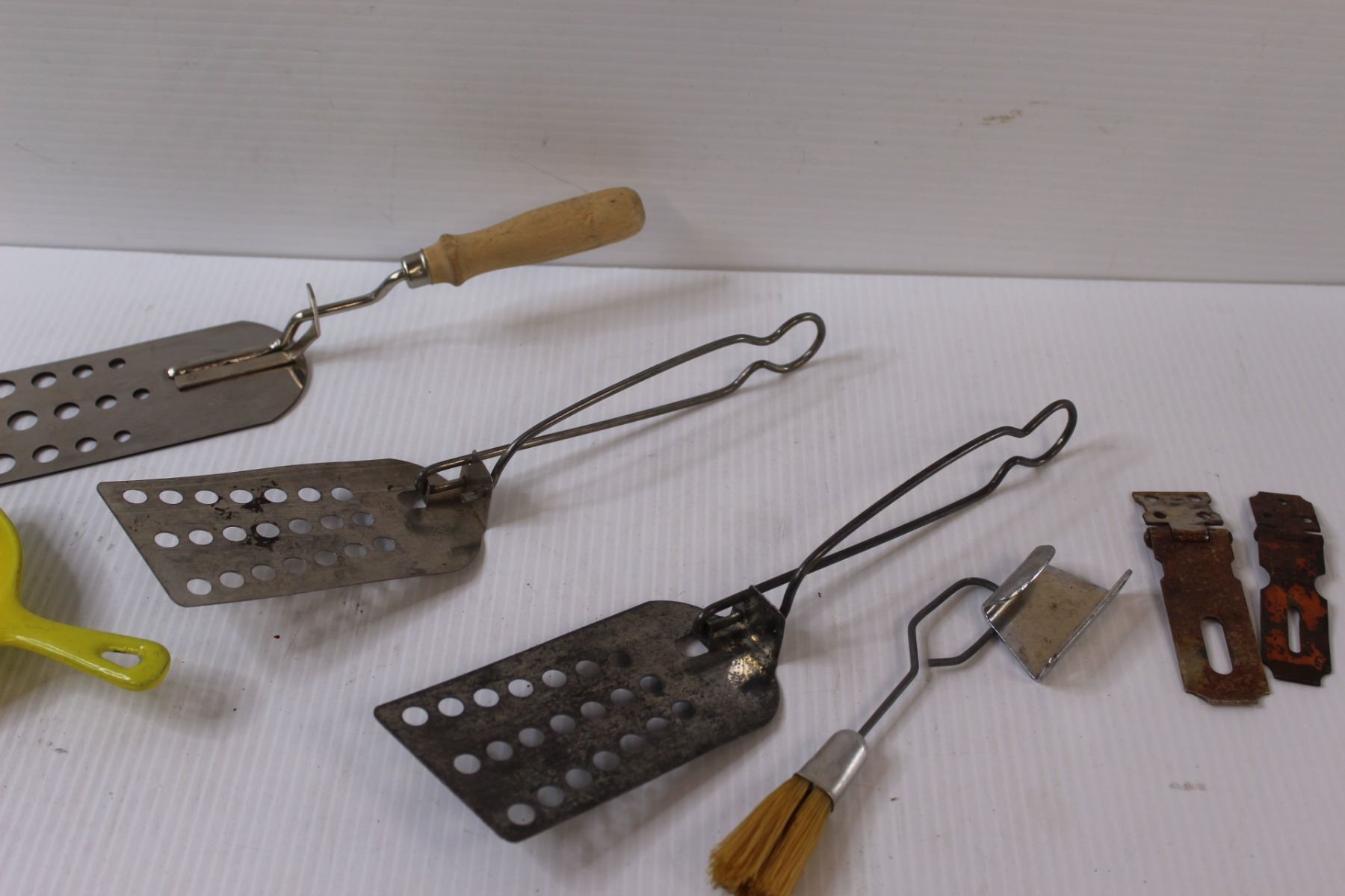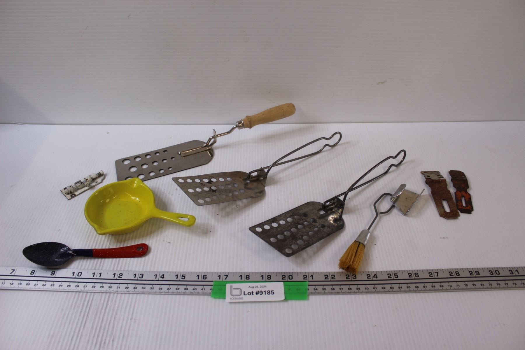 Vintage Kitchen Items: Vintage Spatulas, Hinges, Mini Cast Frying Pan, Misc.