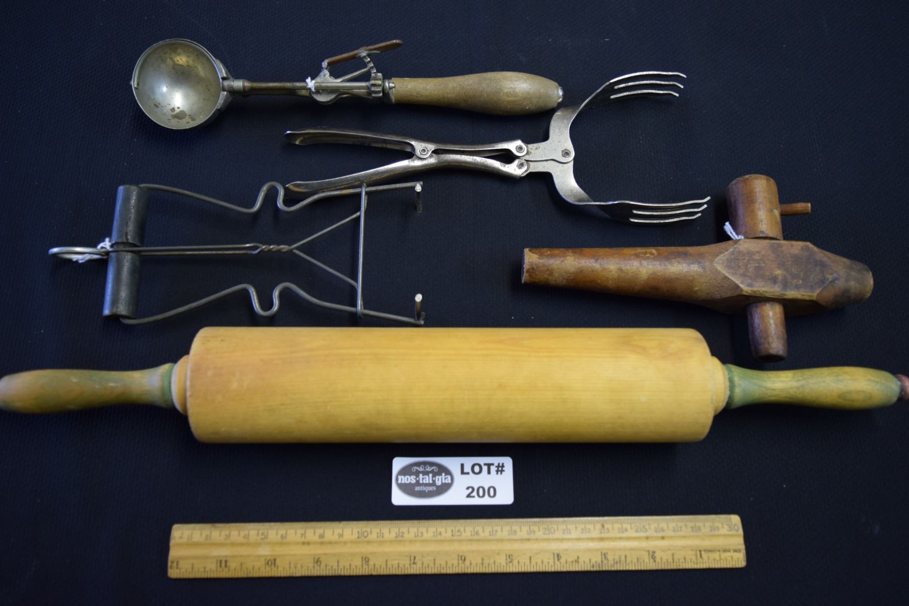 Ghilcrist 31 Ice Cream Scoop, Handy Things Salad Tongs, Rolling Pin, Primitive Jar Lifter and Keg Tap