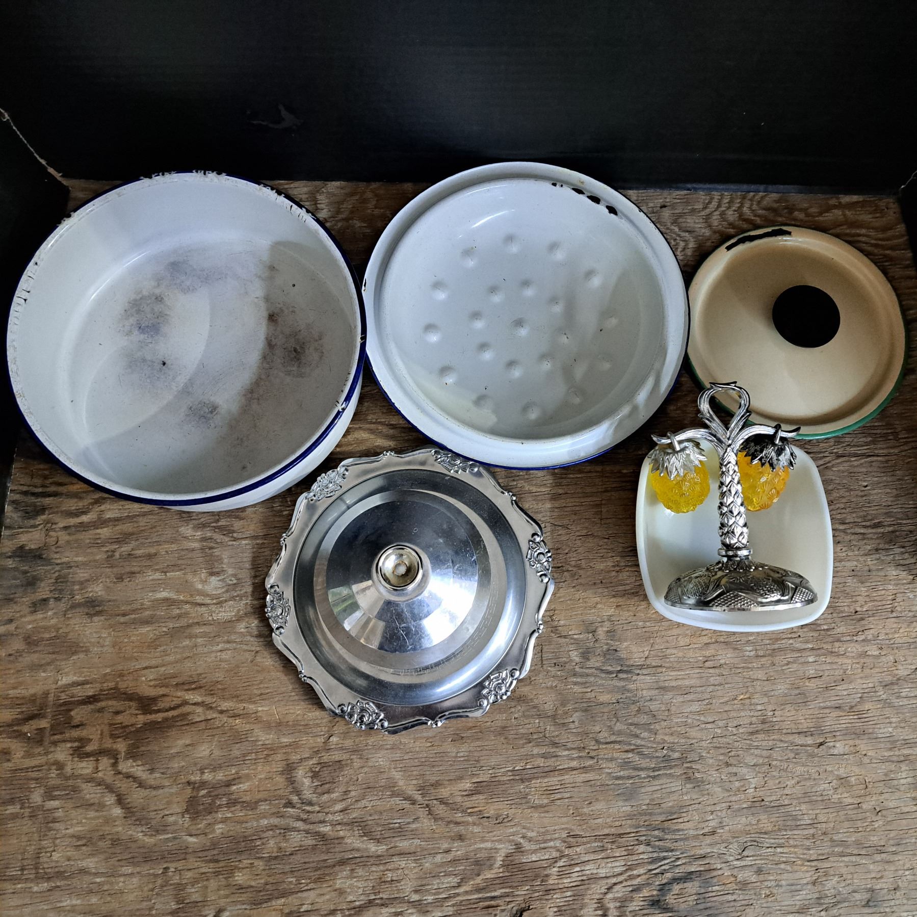 Vintage Kitchenware - Enamel, Pyrex Milk Glass, Butter Dish