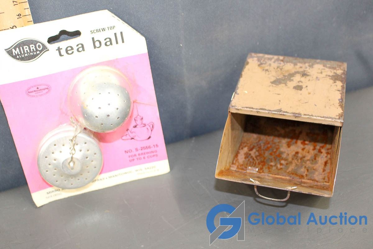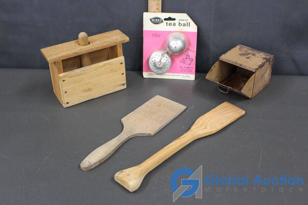 Wooden Press and Cooking Spoons, Tea Ball (still packages), etc