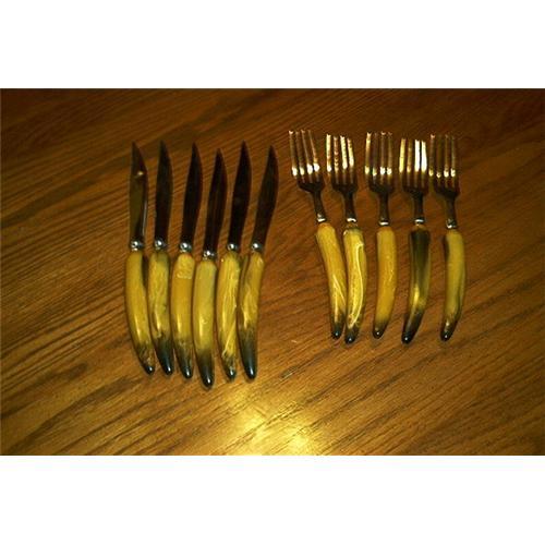 Featuring 6 bakelite handled knifes and 5 matching bakelite handled forks. Stainless steel. Maker unknown. The forks measures 8 inches long the knifes measures 8 1/2 inches long; the bakelite handles measures 3 7/8 inches long with thickness of 1/2 inch. All 11 pieces are in excellent condition.