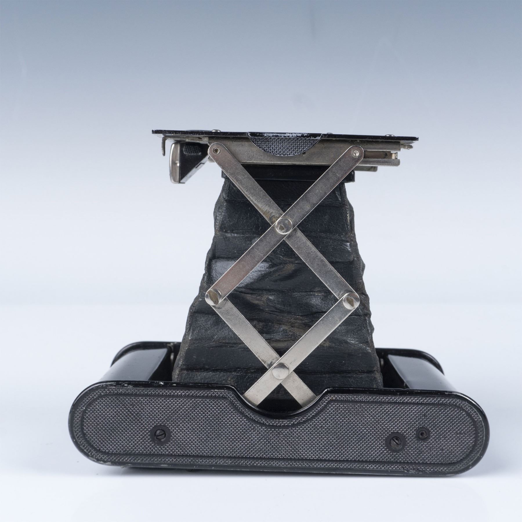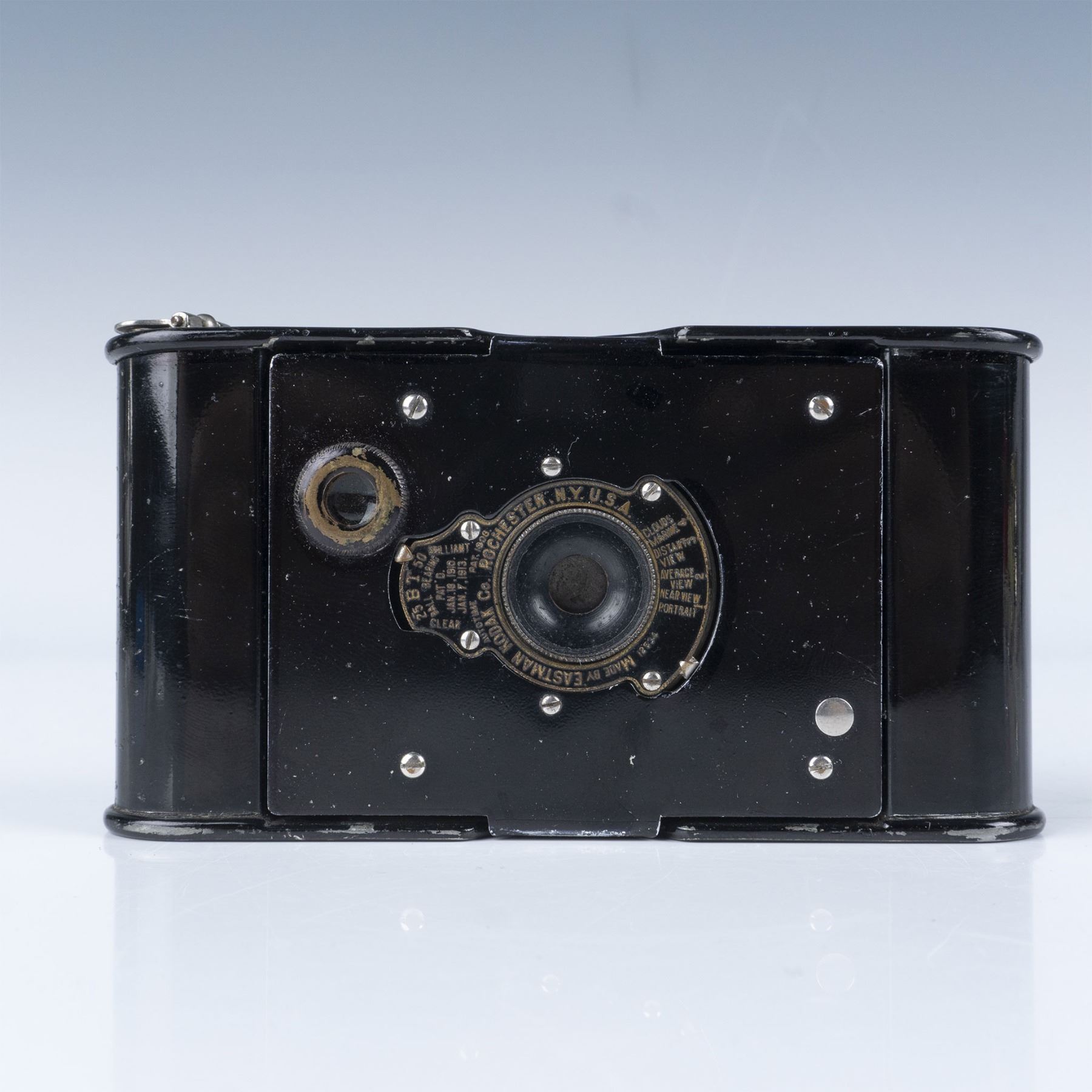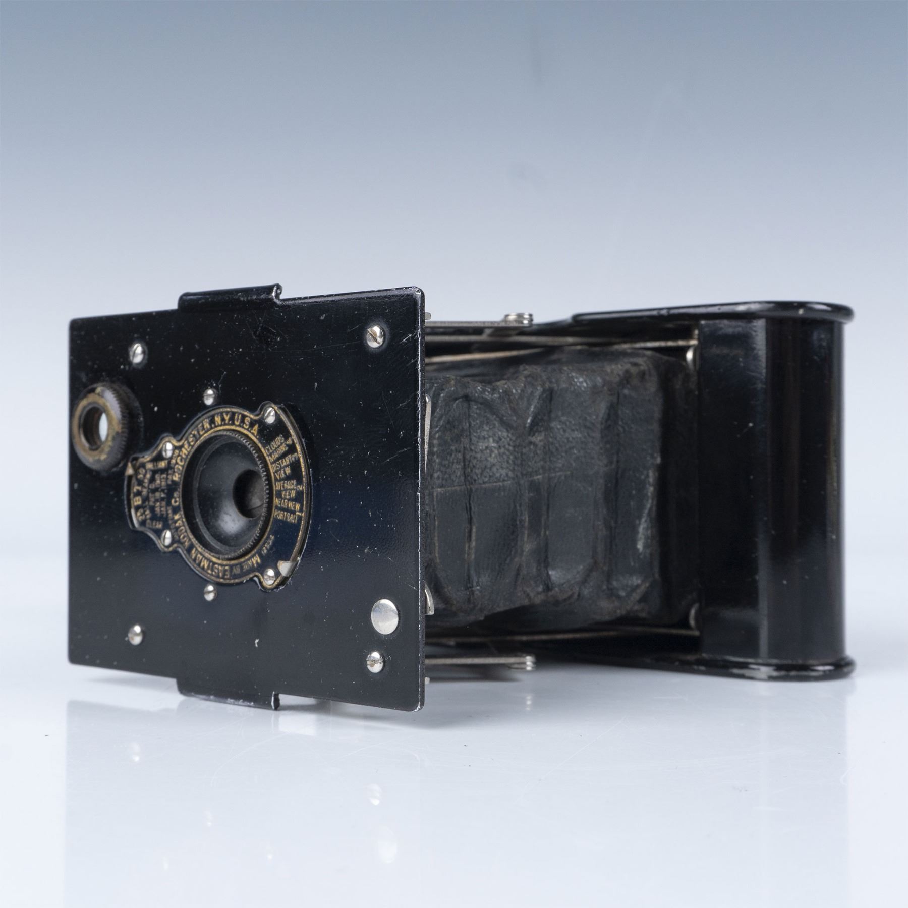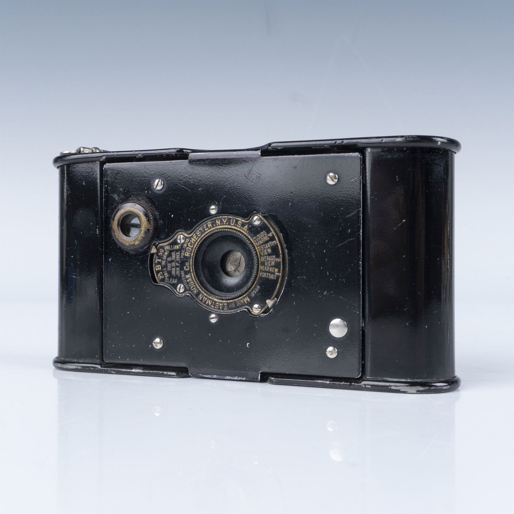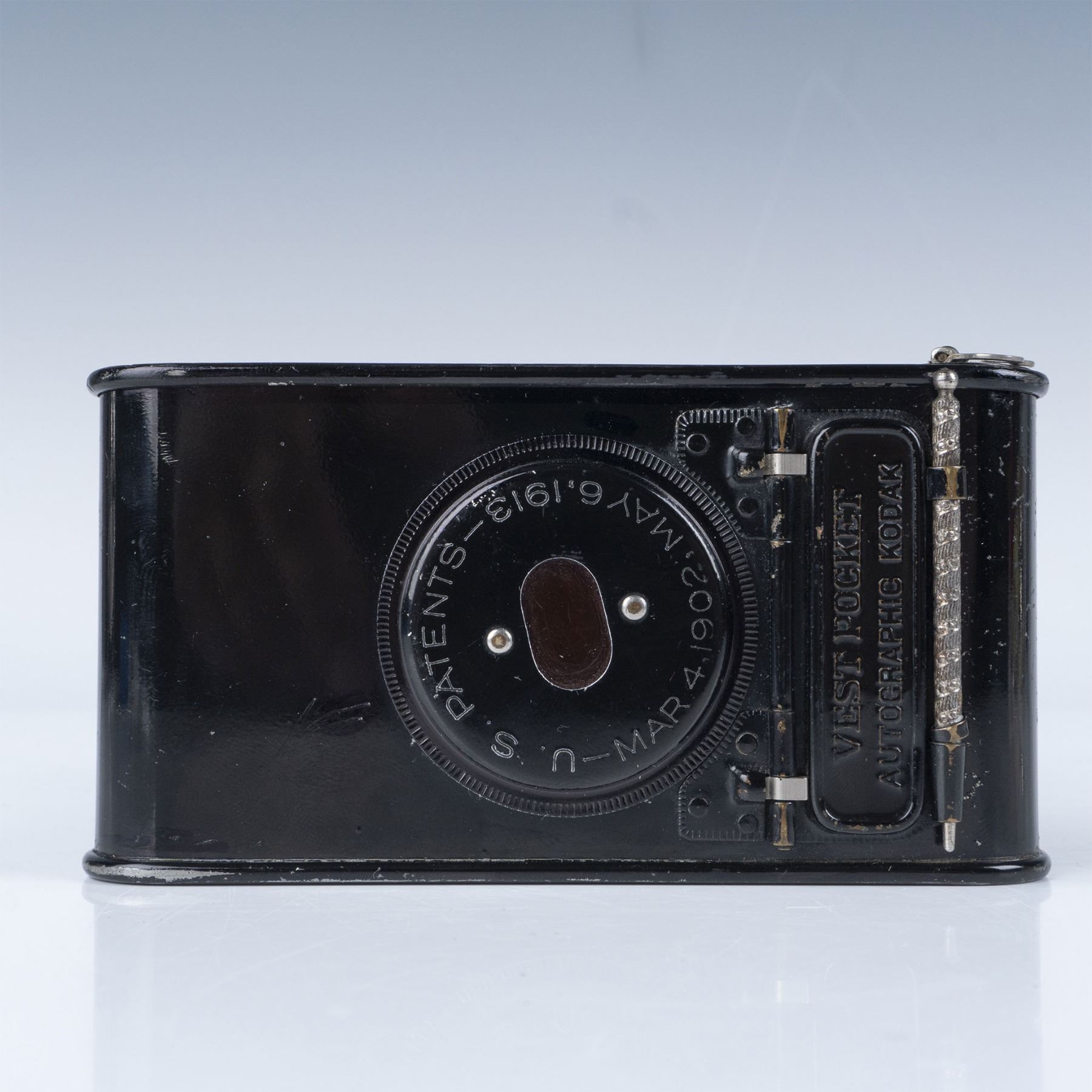 A vintage Kodak Vest Pocket Autographic folding camera, introduced in the early 20th century. This compact model features a metal body with a collapsible leather bellows design and is equipped with a lens marked with patent information, dating back to 1912. Known as The Soldiers Camera during World War I due to its portability, this piece holds historical significance as one of Kodaks early ventures into consumer-grade portable photography. It includes the autographic window on the back, a feature that allowed photographers to write notes directly on the film.