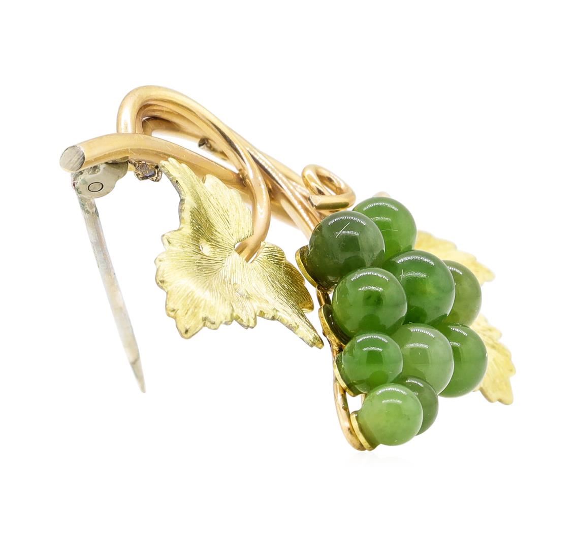 One vintage Krementz pin featuring genuine jade beads and 14KT gold overlay. The brooch weighs approximately 7.4 grams and comes with the original box.
