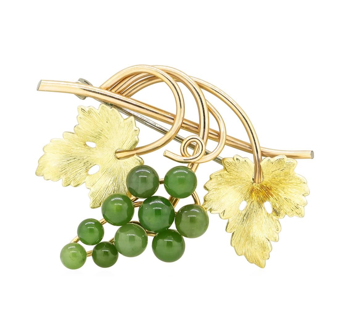 One vintage Krementz pin featuring genuine jade beads and 14KT gold overlay. The brooch weighs approximately 7.4 grams and comes with the original box.