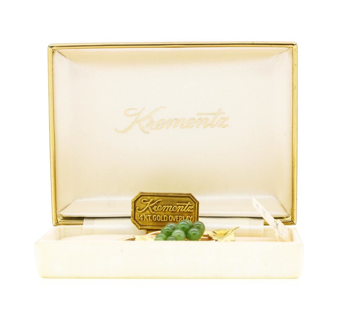 One vintage Krementz pin featuring genuine jade beads and 14KT gold overlay. The brooch weighs approximately 7.4 grams and comes with the original box.