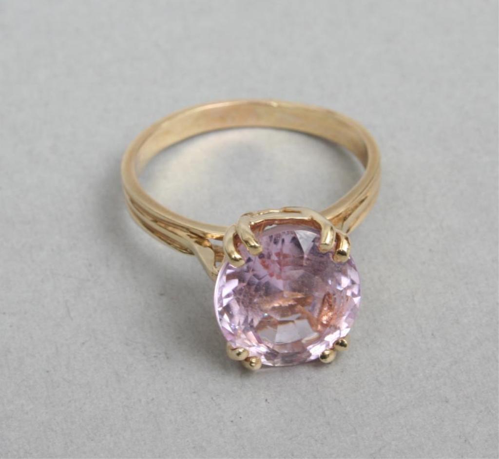Cast in 14 karat yellow gold, prong set with an oval modified brilliant cut natural kunzite, measuring 12.23 x 10.90 x 7.47 mm, approximately 6.35 carats, eye clean clarity, type I, very light, slightly greyish, purple-red color (GIA PR 2/2), of a very good cut. Total weight of colored stone is 6.35 carats. Total weight of ring 4.6g.