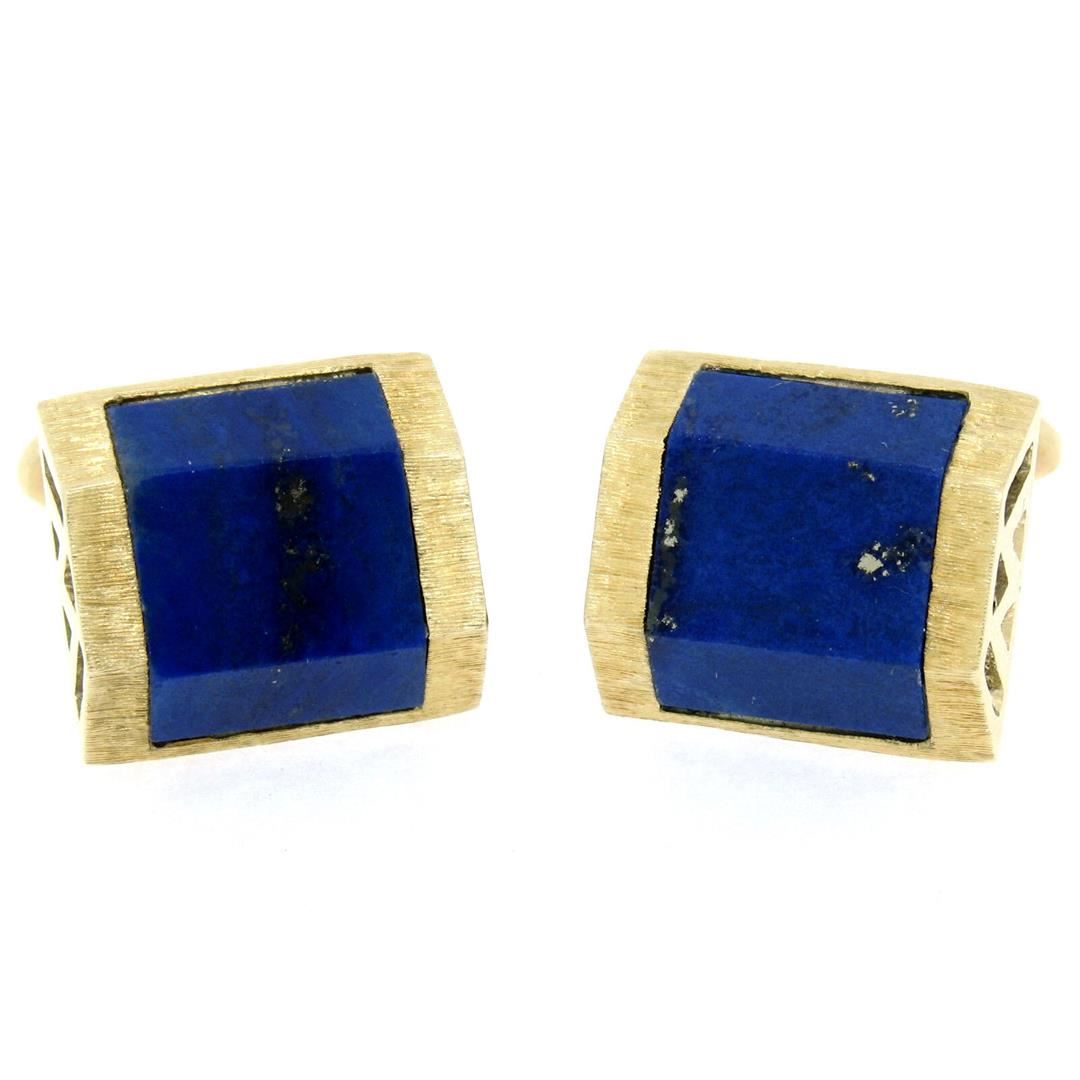 A vintage solid 14k yellow gold cufflinks by La Triomphe, featuring 2 trapezoidal cut natural lapis (15.10x12.15mm). These cuff links have a Swivel Back design with a clearance of 10.70mm, weigh a total of 19.15 grams, and the front panels measure 16.85x18.10mm.