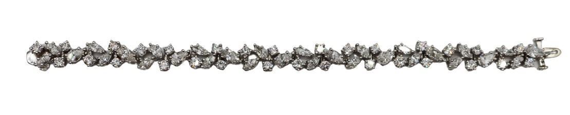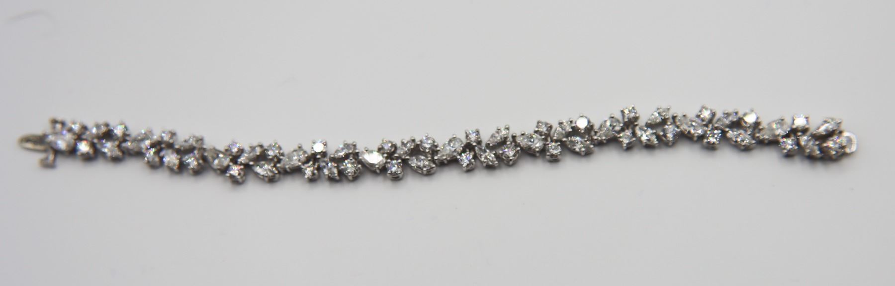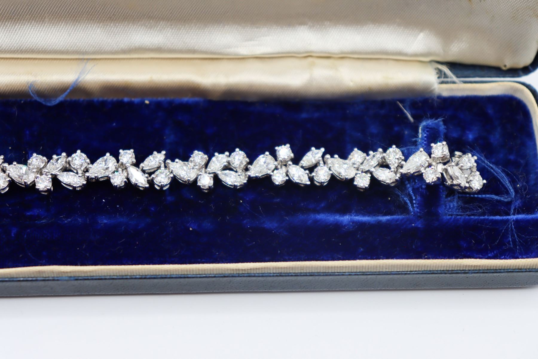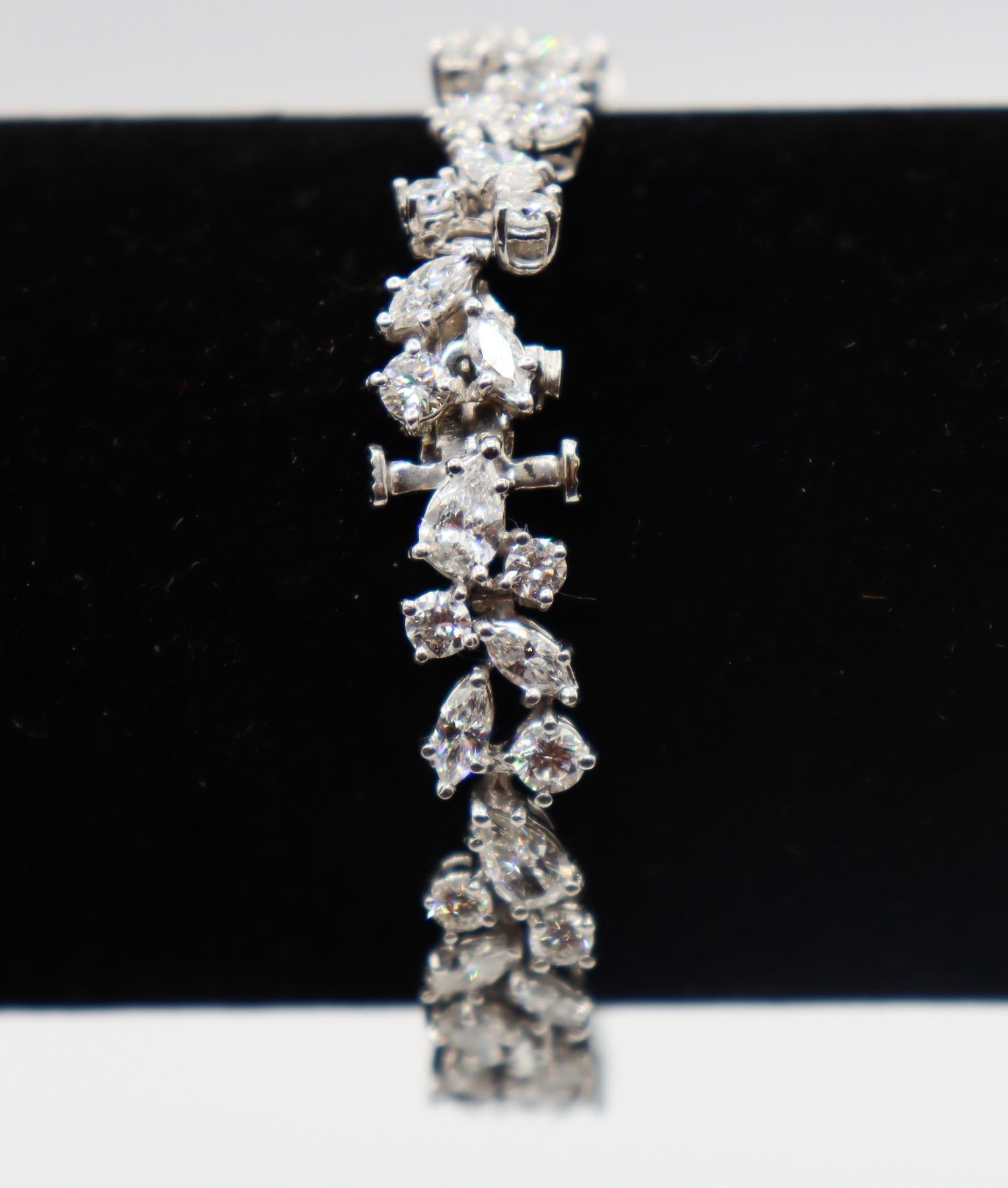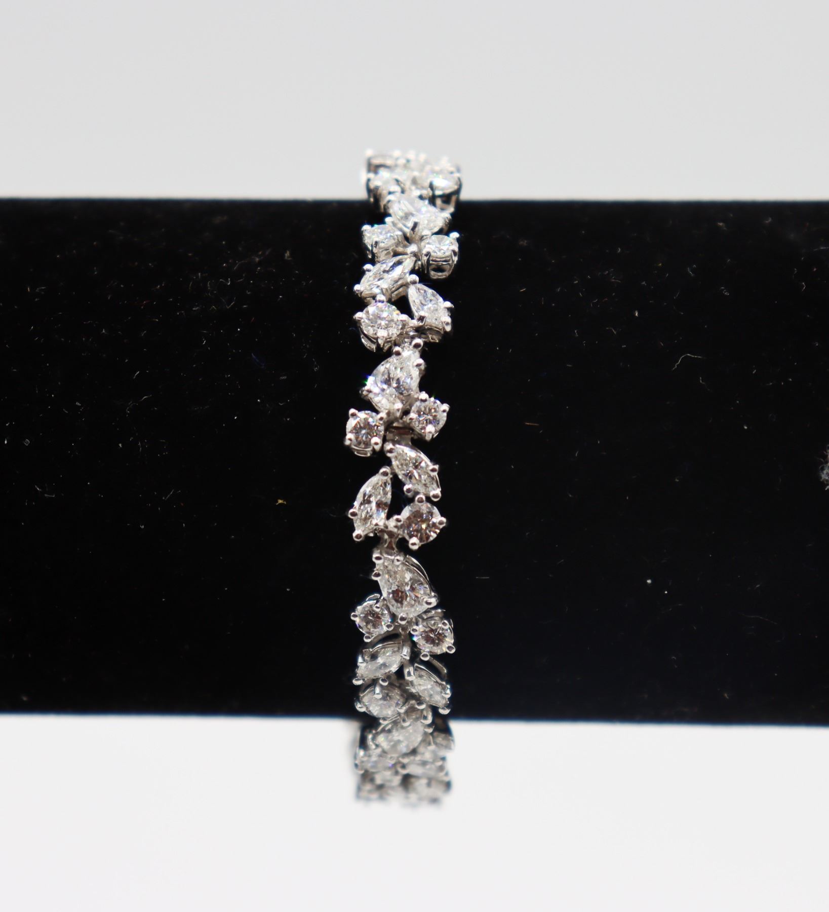 Vintage Ladies Diamond Cluster Style Bracelet with 10 pear cut, 29 round brilliant cut diamonds, 20 marquise cut diamonds, weighing 14.10 cts (stated), all diamonds are of G-H color and VS1-SI1 clarity. The bracelet is crafted in 19.4 dwt of platinum and measures 7 in long.