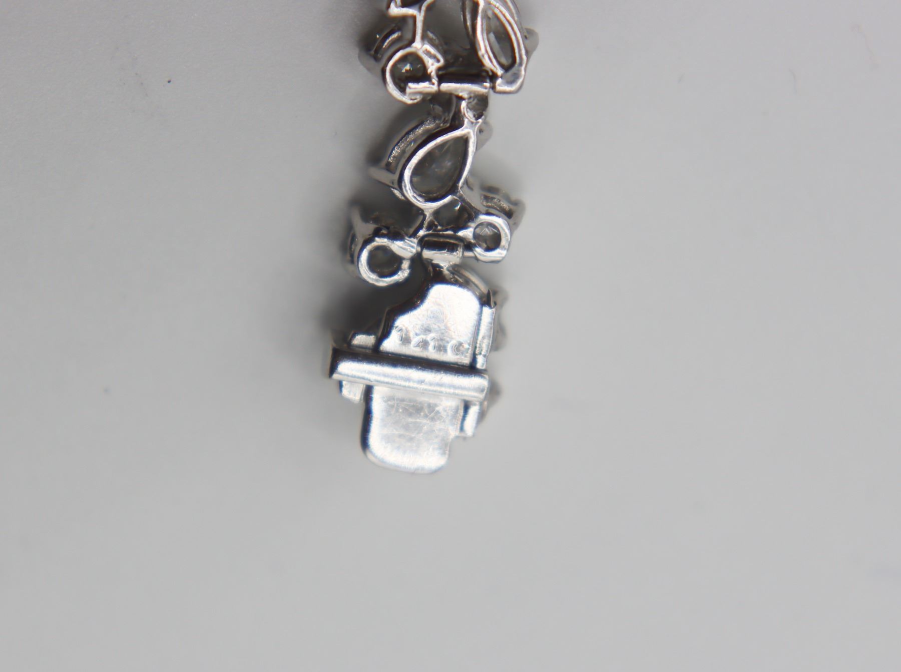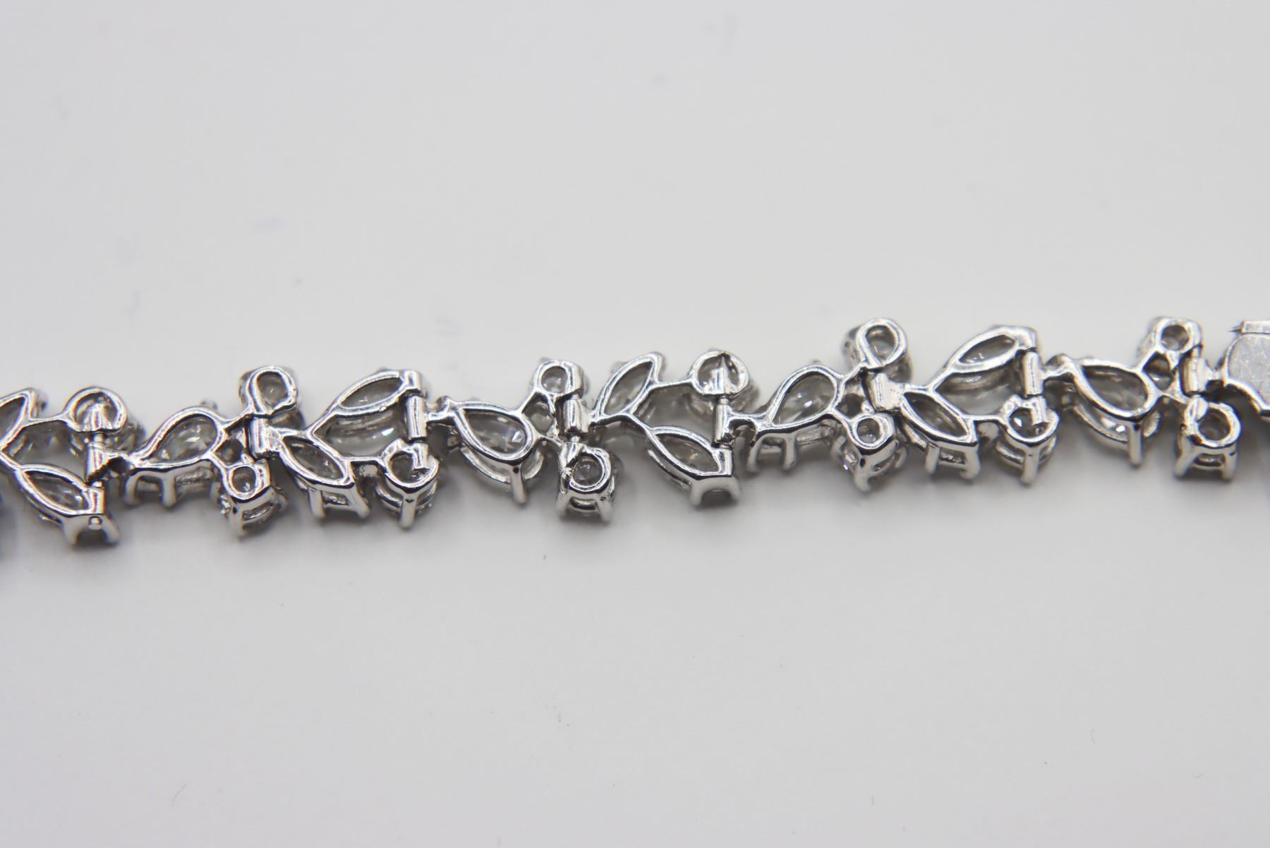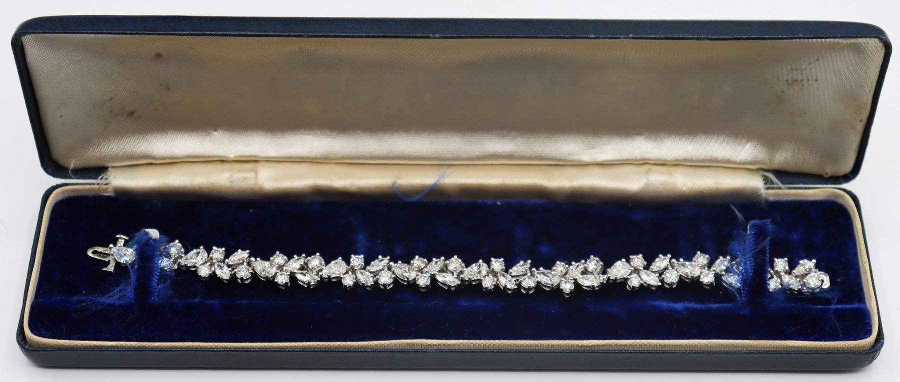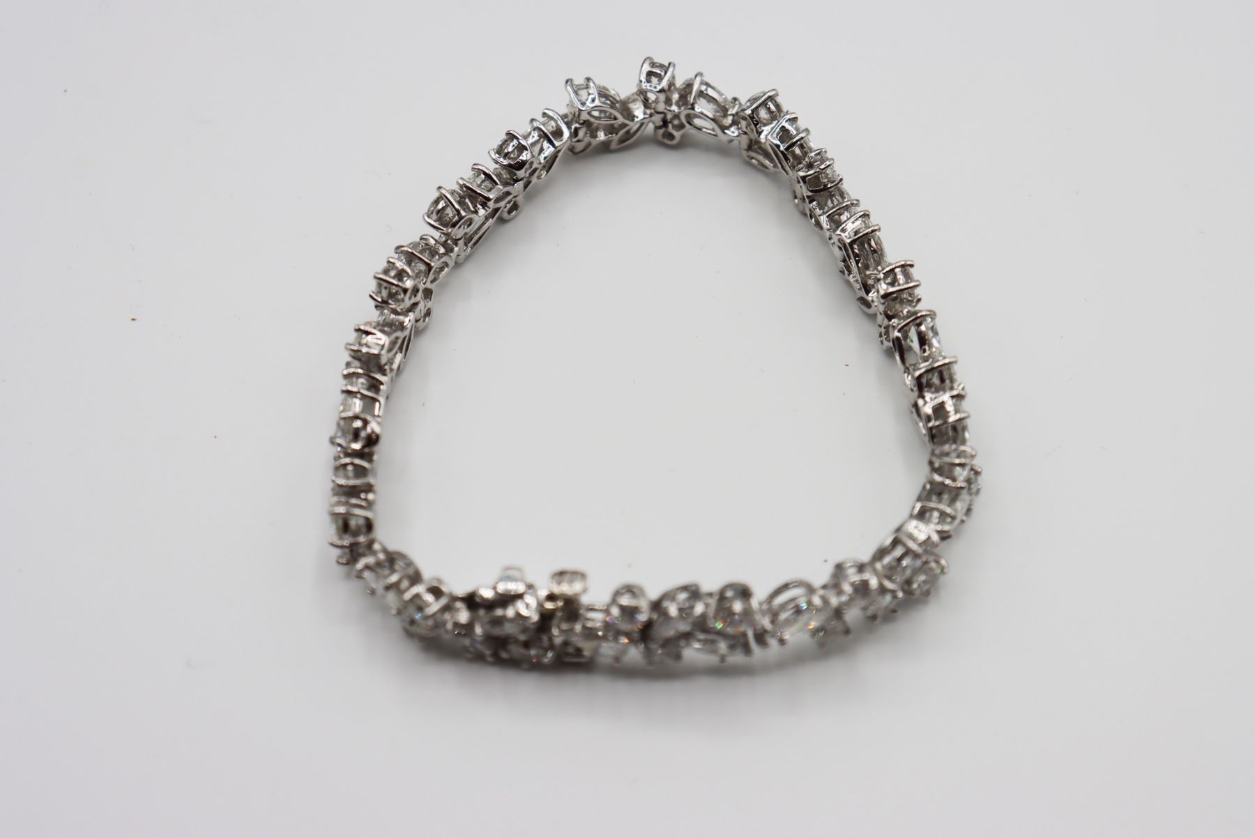 Vintage Ladies Diamond Cluster Style Bracelet with 10 pear cut, 29 round brilliant cut diamonds, 20 marquise cut diamonds, weighing 14.10 cts (stated), all diamonds are of G-H color and VS1-SI1 clarity. The bracelet is crafted in 19.4 dwt of platinum and measures 7 in long.