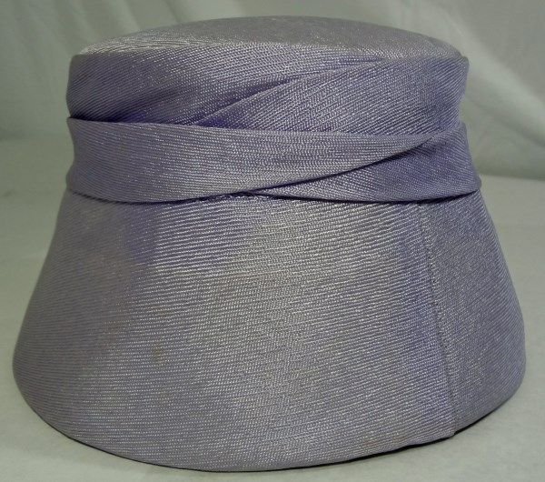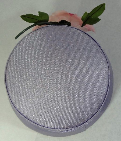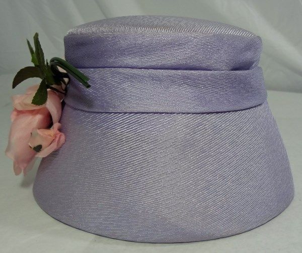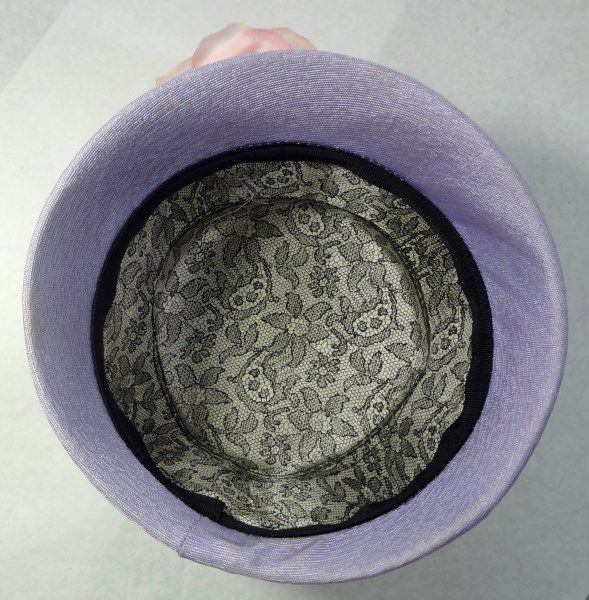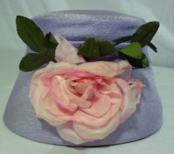 Purple ladies hat with pink rose and leaves attached to the front of the hat. 5" tall.