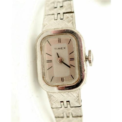 Vintage Ladies Manual Wind Timex Watch . The rectangular case is 5/8" x 9/16". The crystal is beveled. With the band and all it is 6 5/8" long. It is in very good condition and works great. The watch is silver metal with a stainless steel case back.