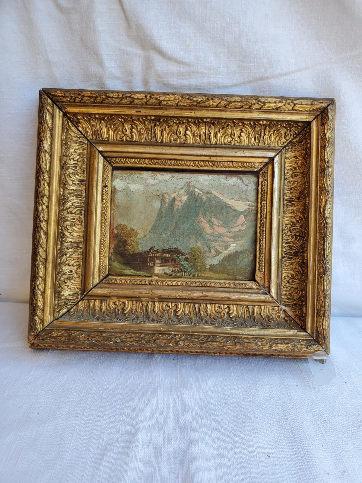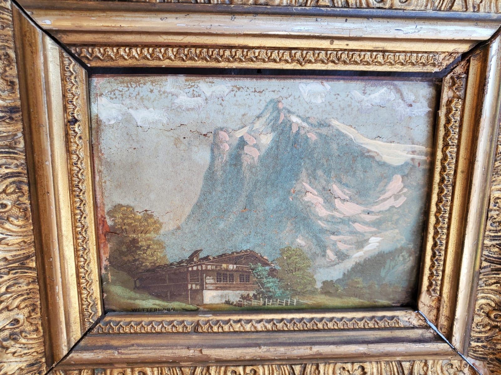 Vintage oil painting on board of "Wetterhorn" in beautiful, ornate vintage gold gilt frame, measures approx. 10 in. wide x 9 in. tall.