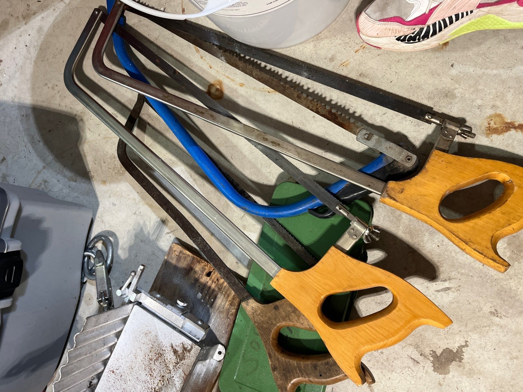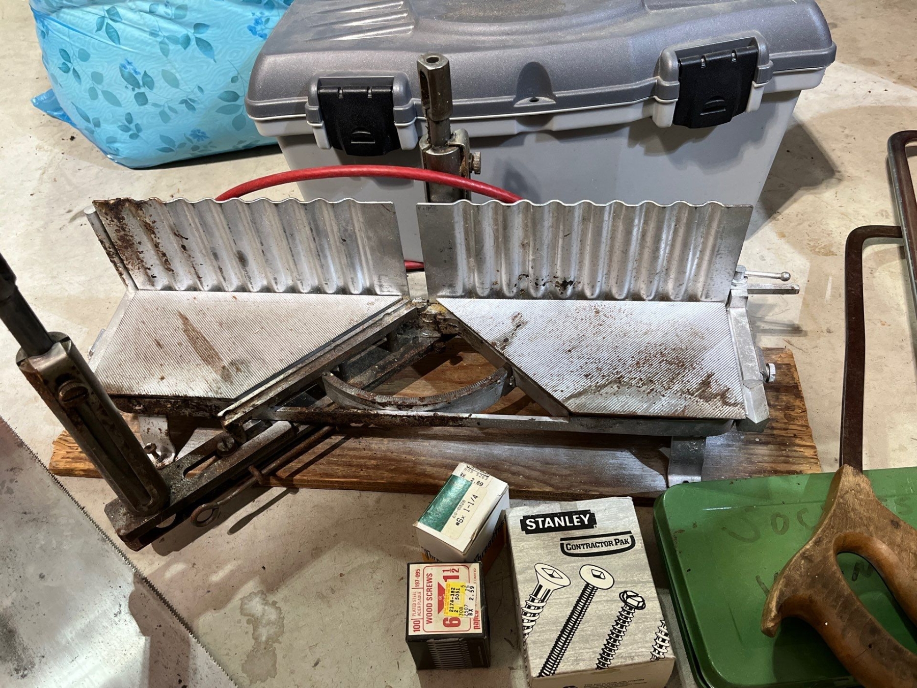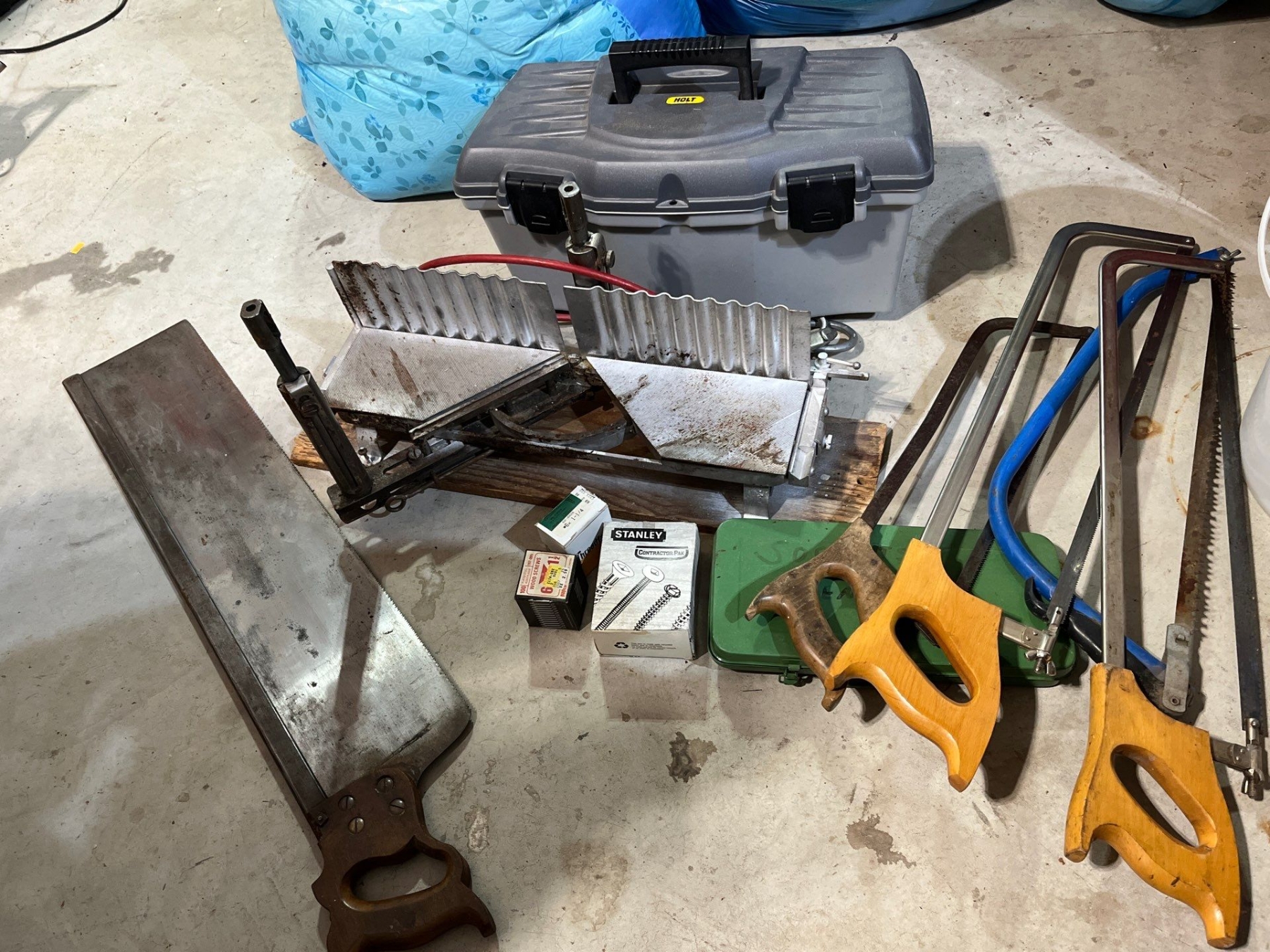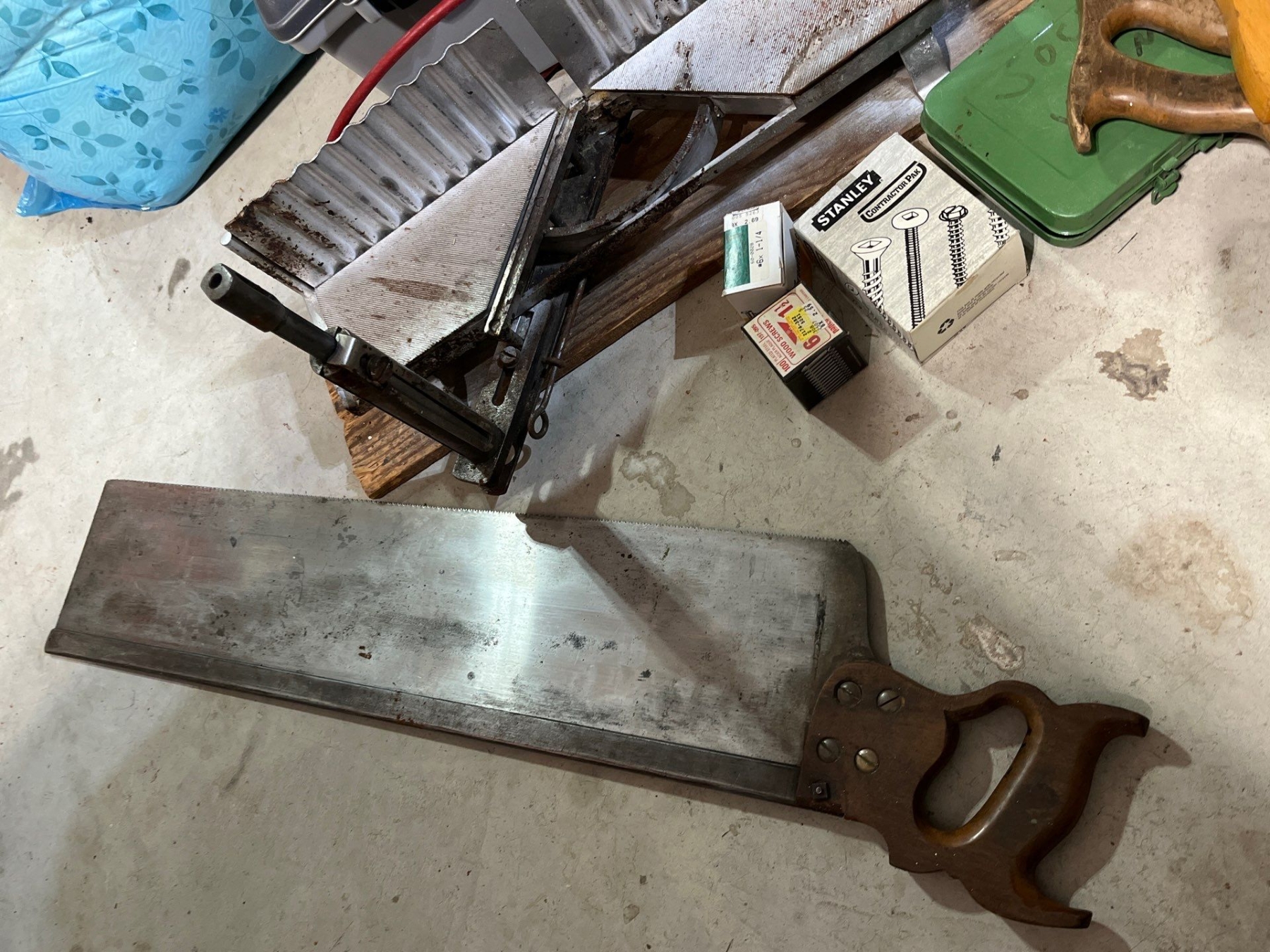 Vintage Langdon miter box, with assortment of antique saws socket sets toolbox
