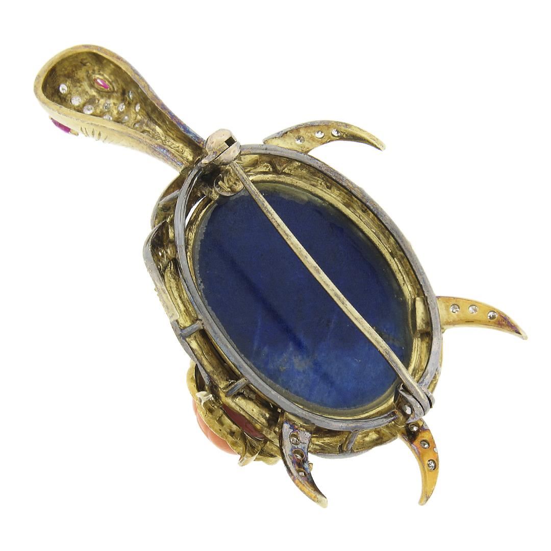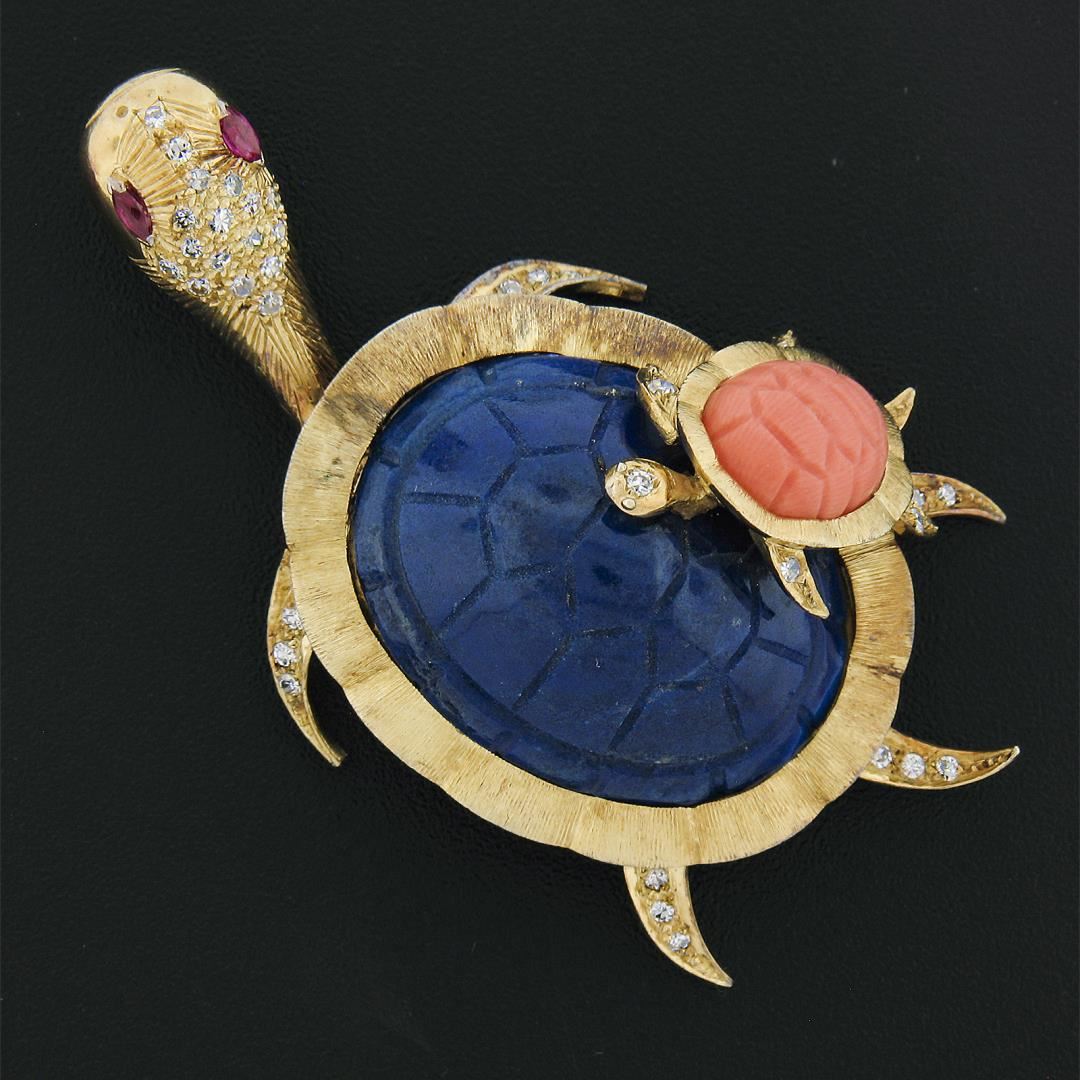 A vintage solid 14k yellow gold turtle brooch, with 38 single cut natural diamonds (G/H - VS1/VS2 ; 0.38ctw), 2 marquise cut natural rubies (0.20ctw), 1 carved oval cabochon cut natural lapis (27.5x21.5 mm), and 1 carved oval cabochon cut natural coral (11.5x9.2 mm). Measures 59.5x32.5mm and weighs a total of 20.6 grams.
