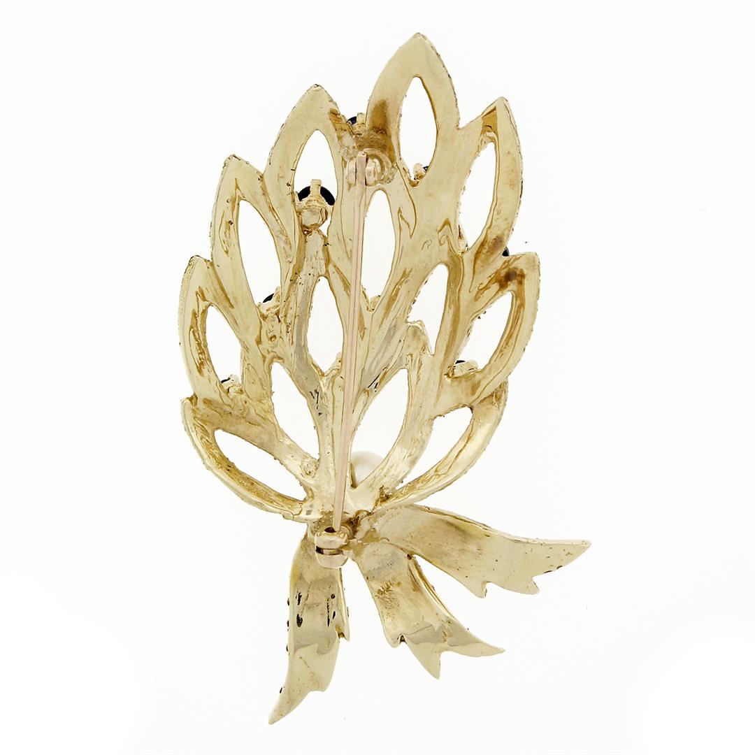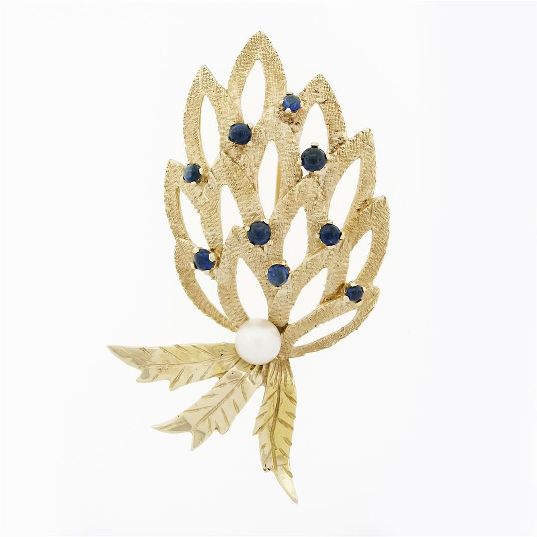 A vintage solid 14k yellow gold flower leaf pin brooch, with 9 round cabochon cut natural sapphires (3.2 to 2.5mm - 1.30ctw), & 1 round shape cultured pearl (6.00mm). Measures 38.9x61.0mm mm and weighs a total of 12.70 grams.