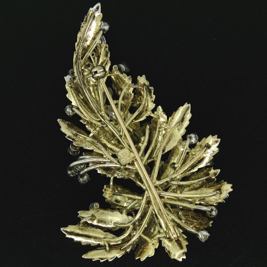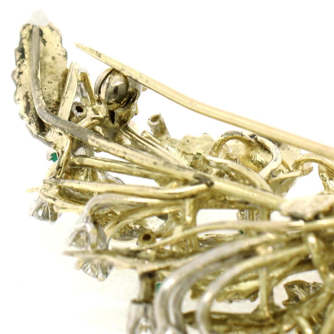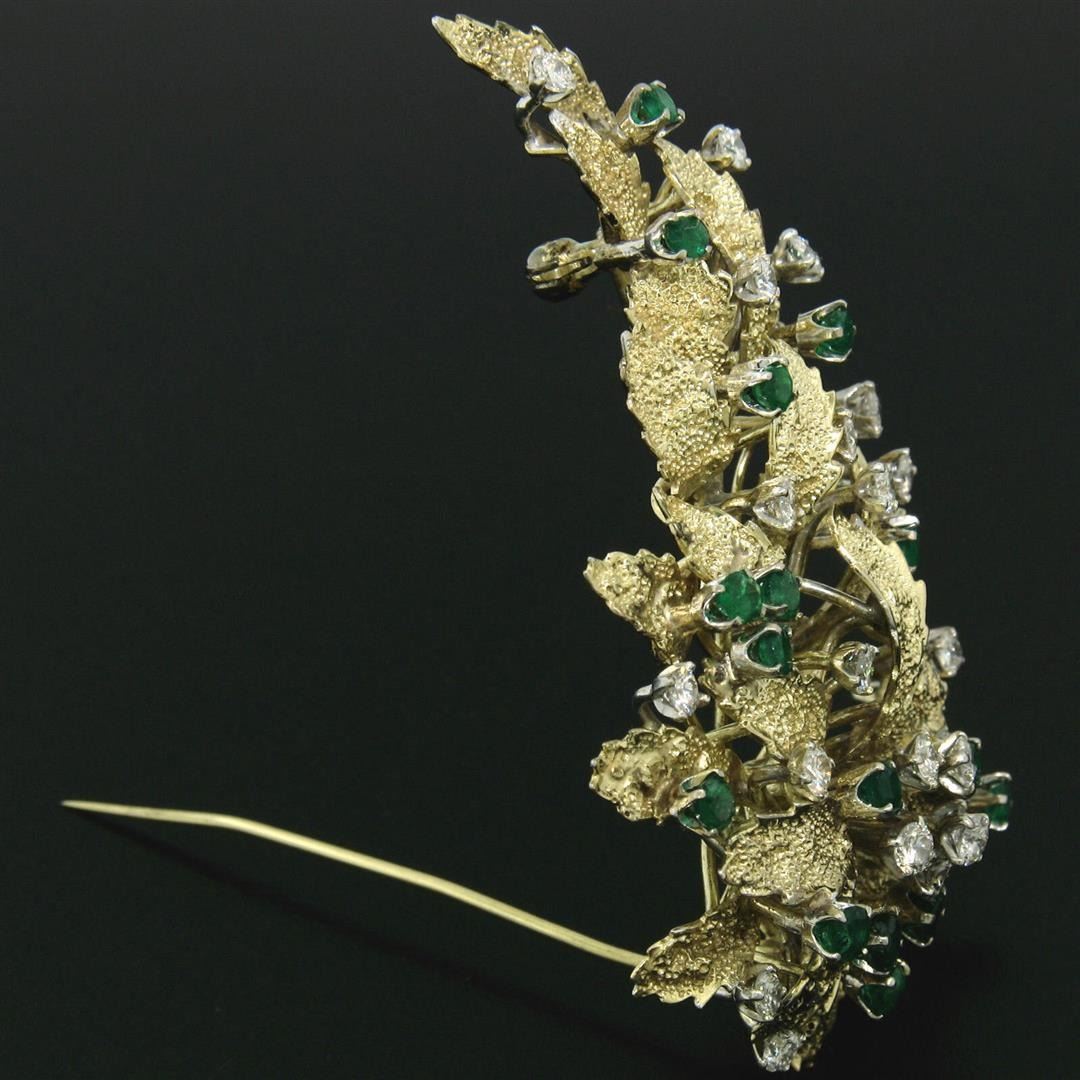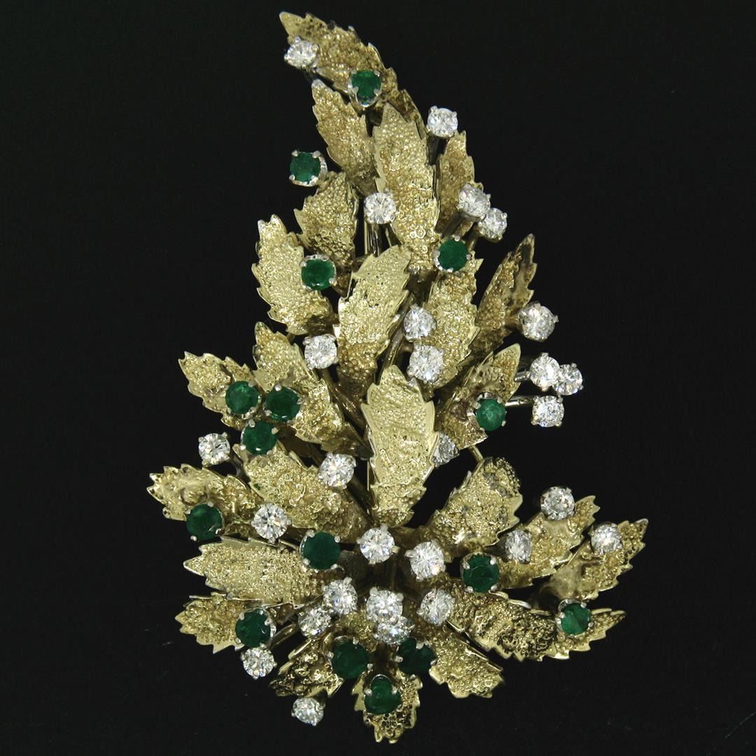 A vintage solid 14k yellow gold large leaf brooch, with 28 round brilliant cut natural diamonds (F/G - VS1/VS2; 2.60ctw), and 16 round cut natural emeralds (2.00ctw). Measures 45.55x66.75mm and weighs a total of 26.87 grams.