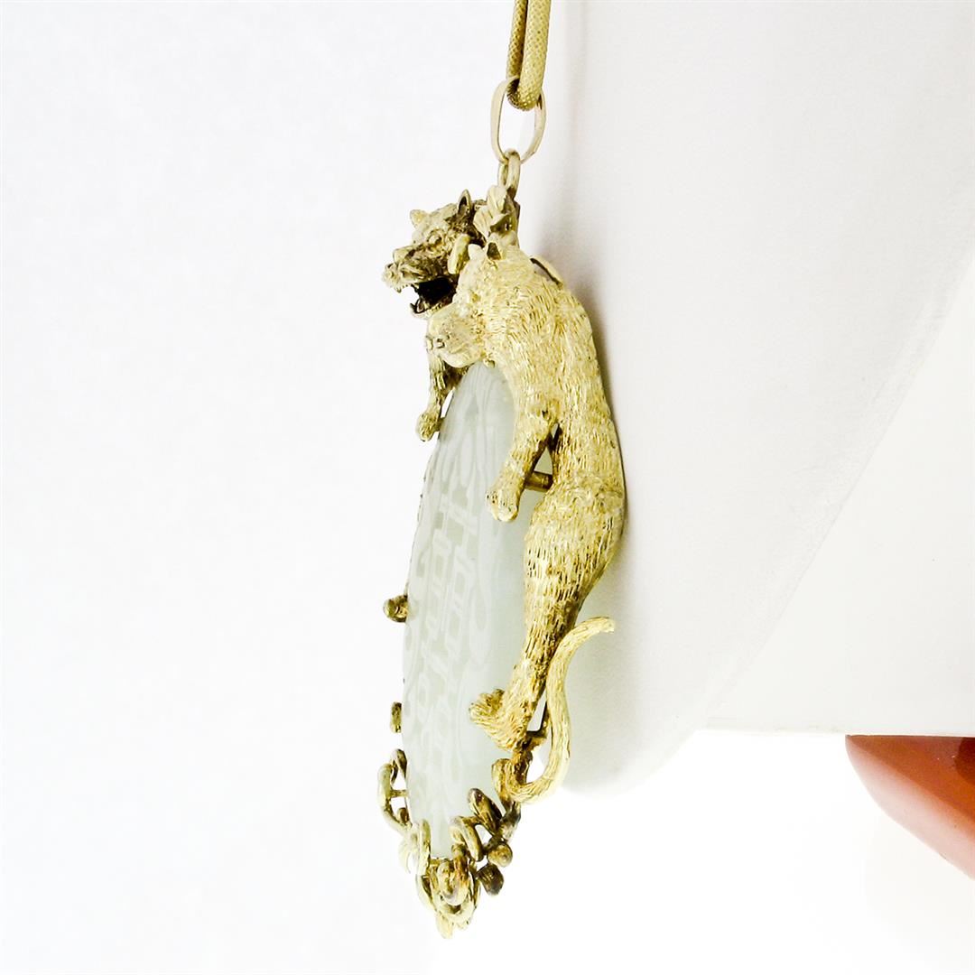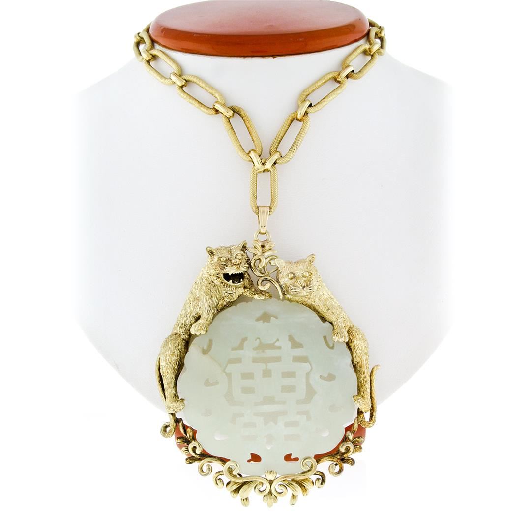 A vintage solid 14k yellow gold pendant with 1 pierced round natural nephrite jade (54.0mm). 22 inch oval link chain, 95.01 grams total weight, pendant measures 86.58x71.80mm.